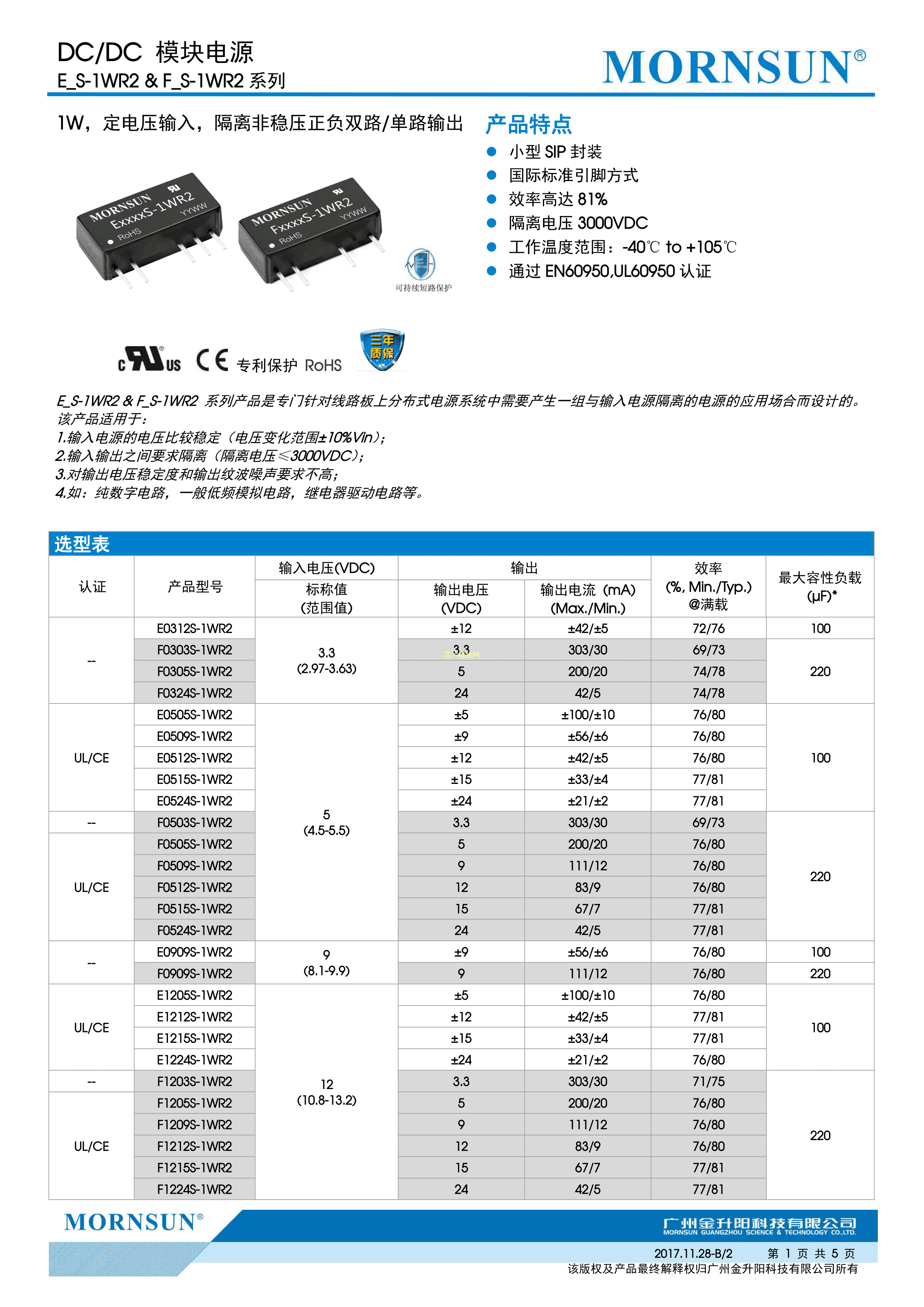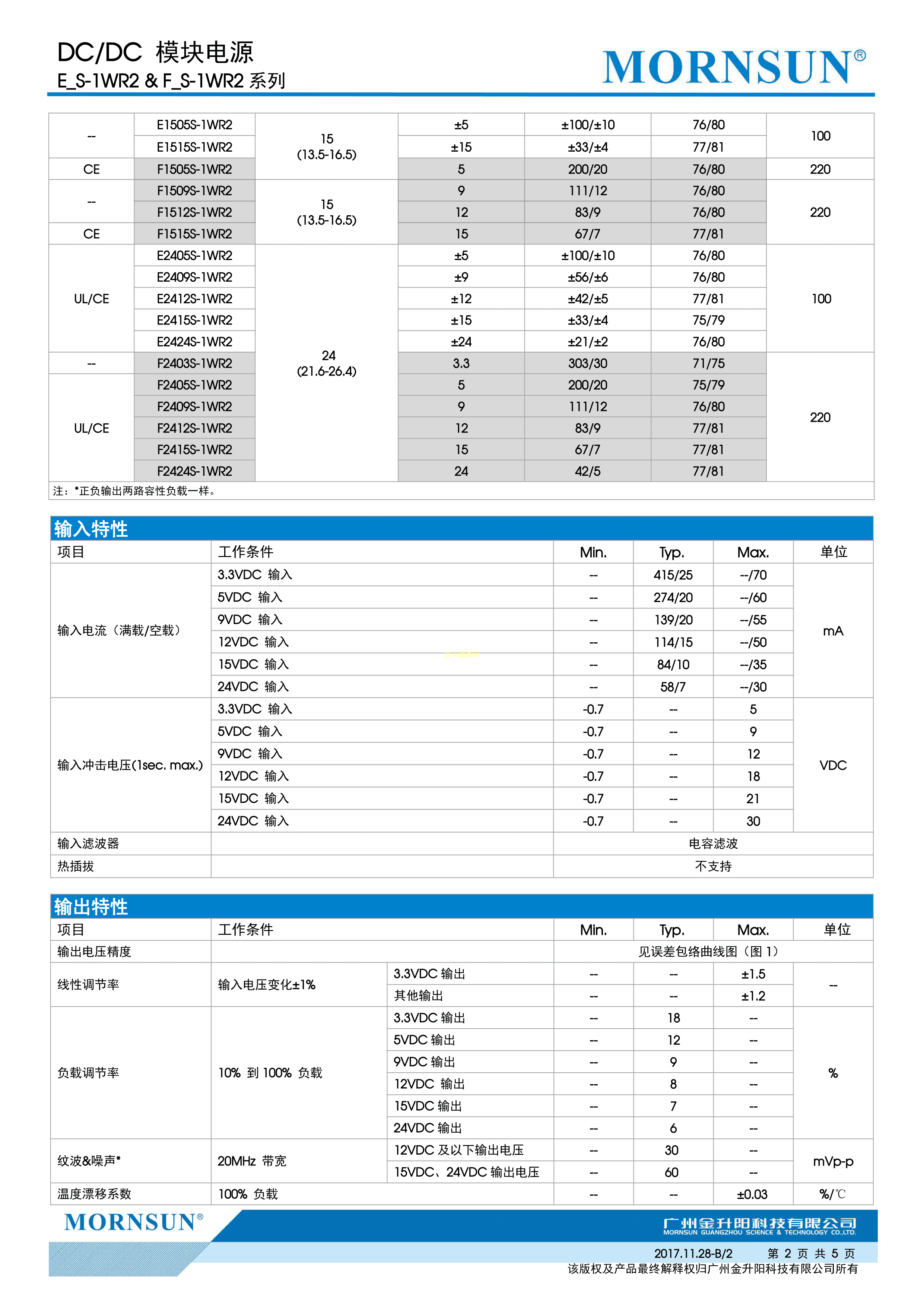 E2415S-1WR2数据手册插件封装MORNSUN(金升阳)PDF规格书,中英文下载