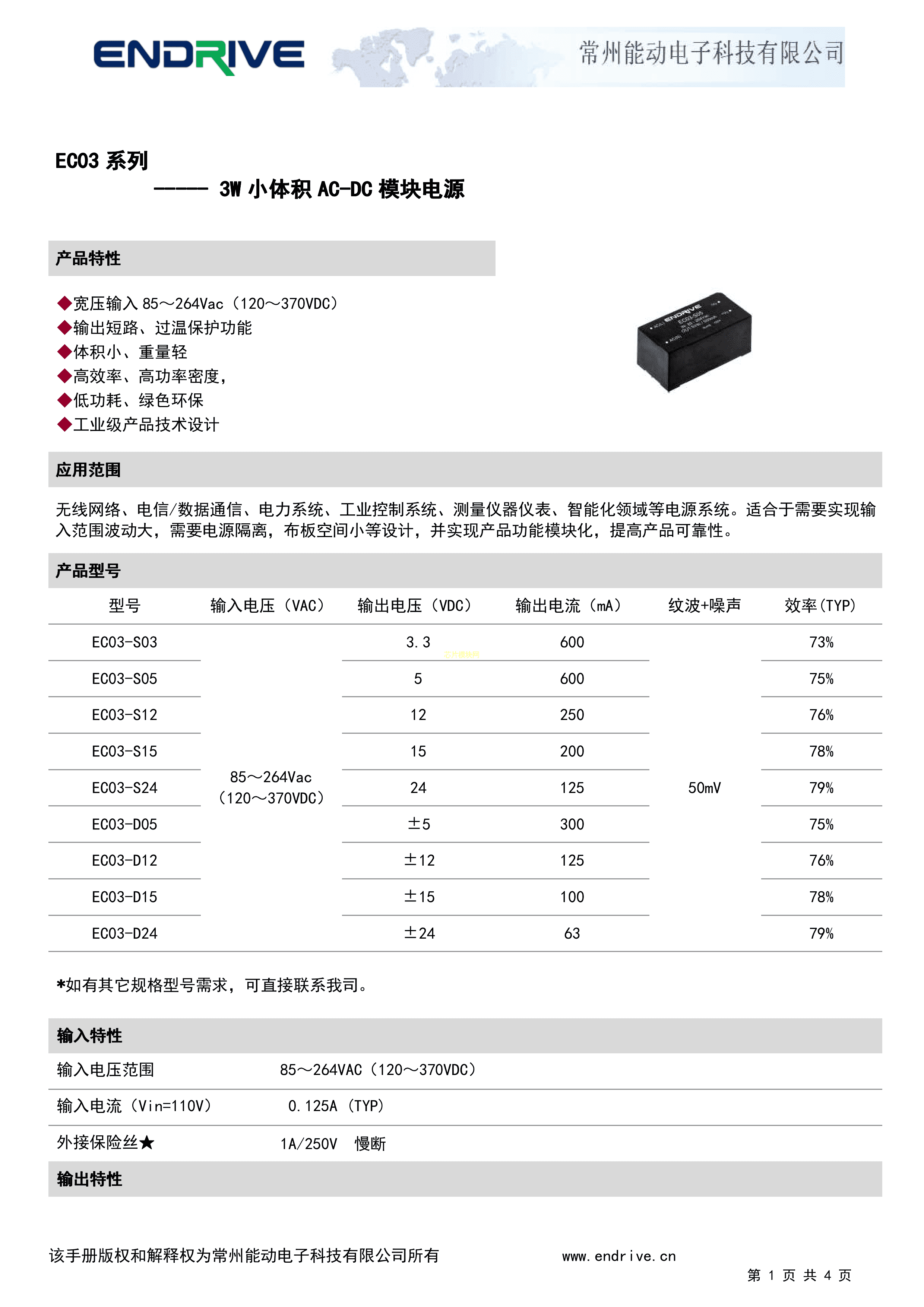 EC03-S03数据手册插件封装ENDRIVE(江苏能动)PDF规格书,中英文下载