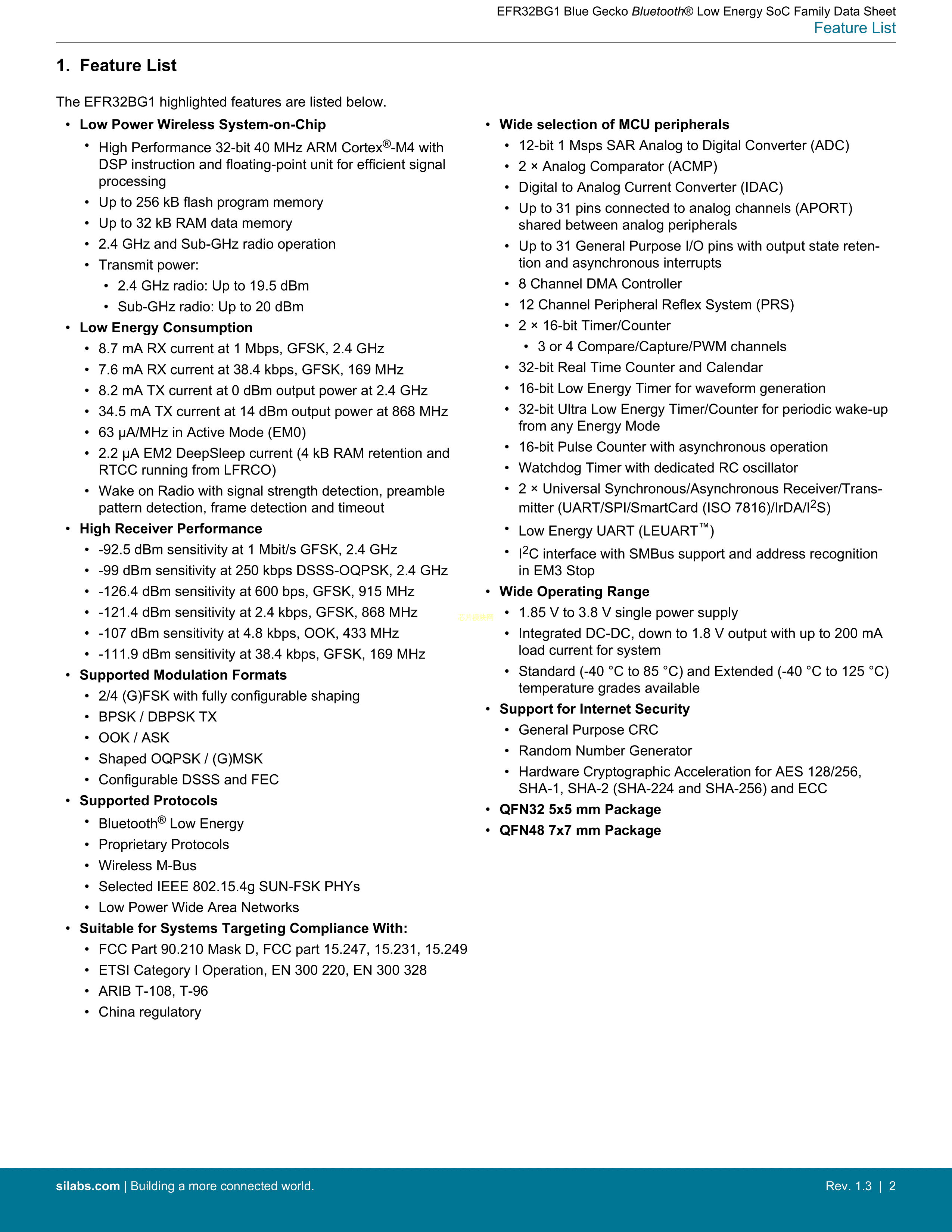 EFR32BG1B132F256GM32-C0数据手册QFN-32(5x5)封装SILICON-LABS(芯科)PDF规格书,中英文下载