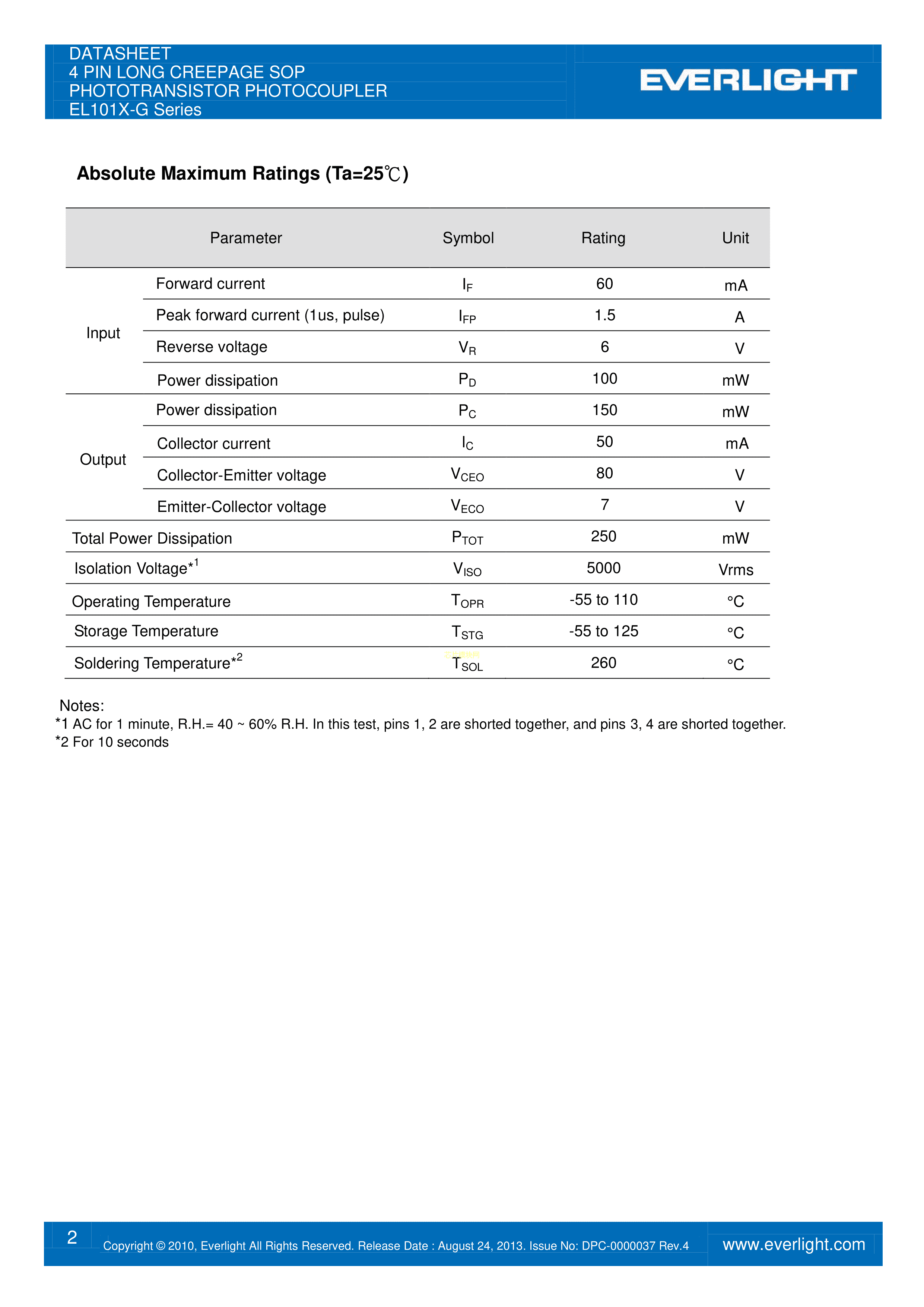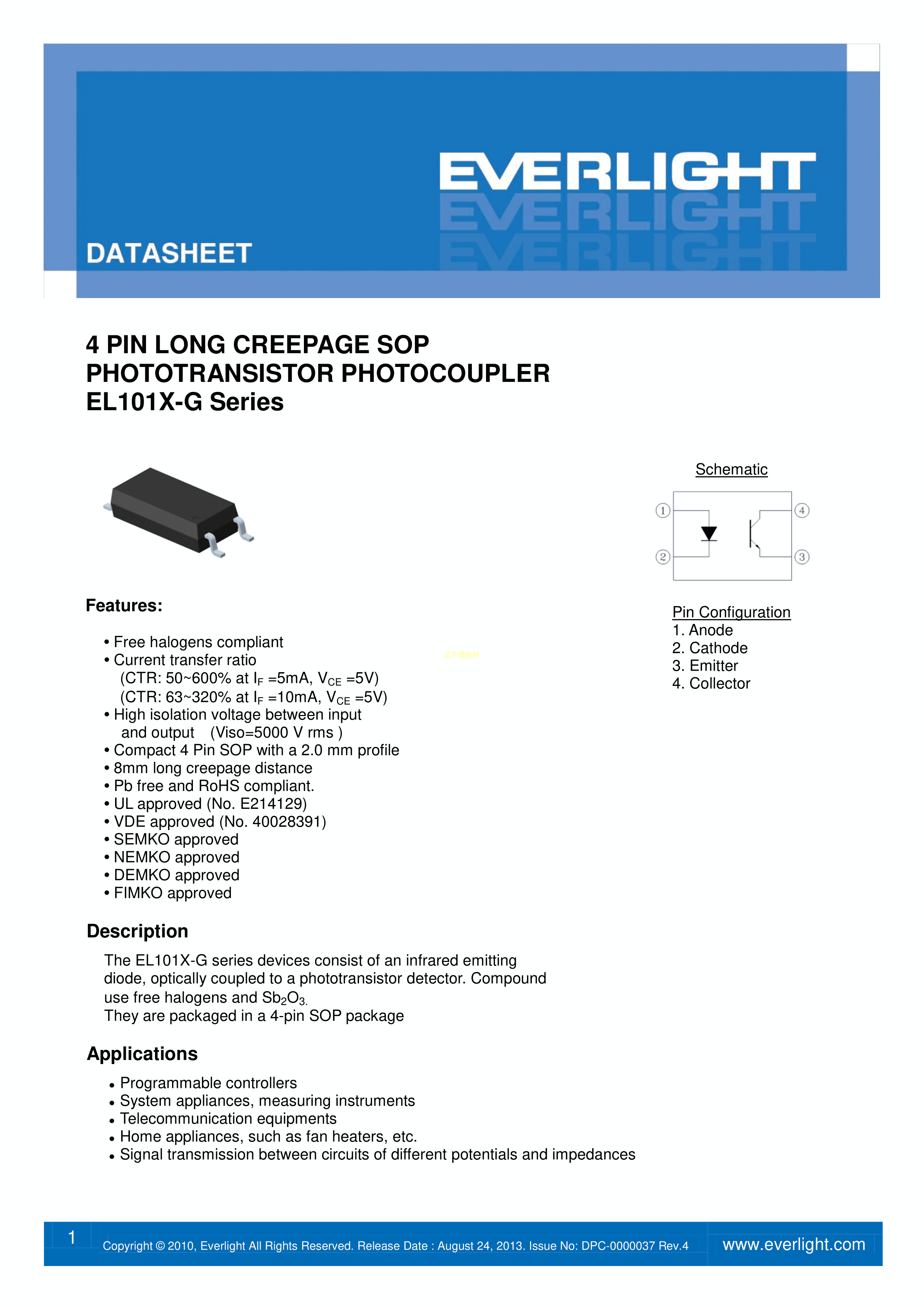 EL1013(TA)-VG数据手册SOP-4_2.54_300mil封装EVERLIGHT(台湾亿光