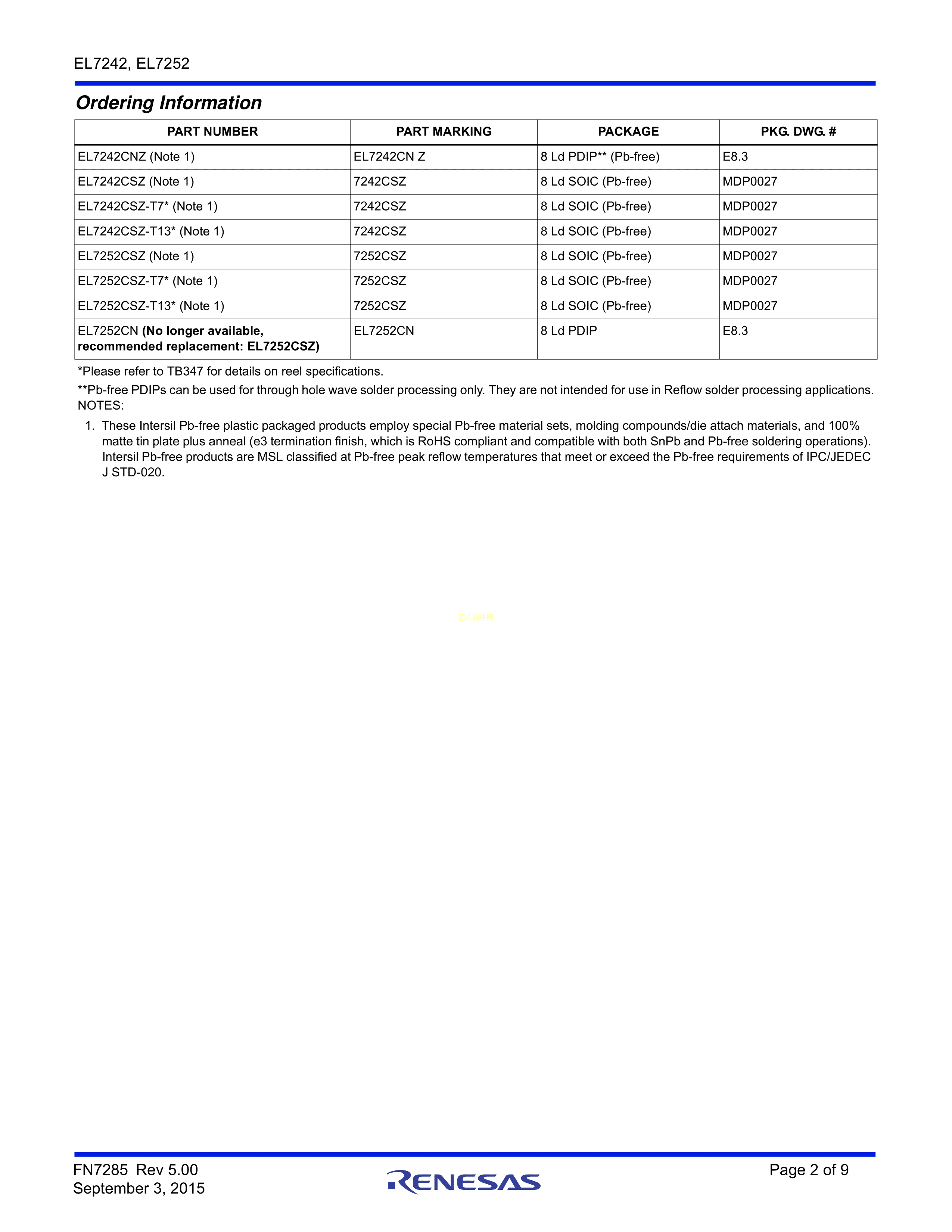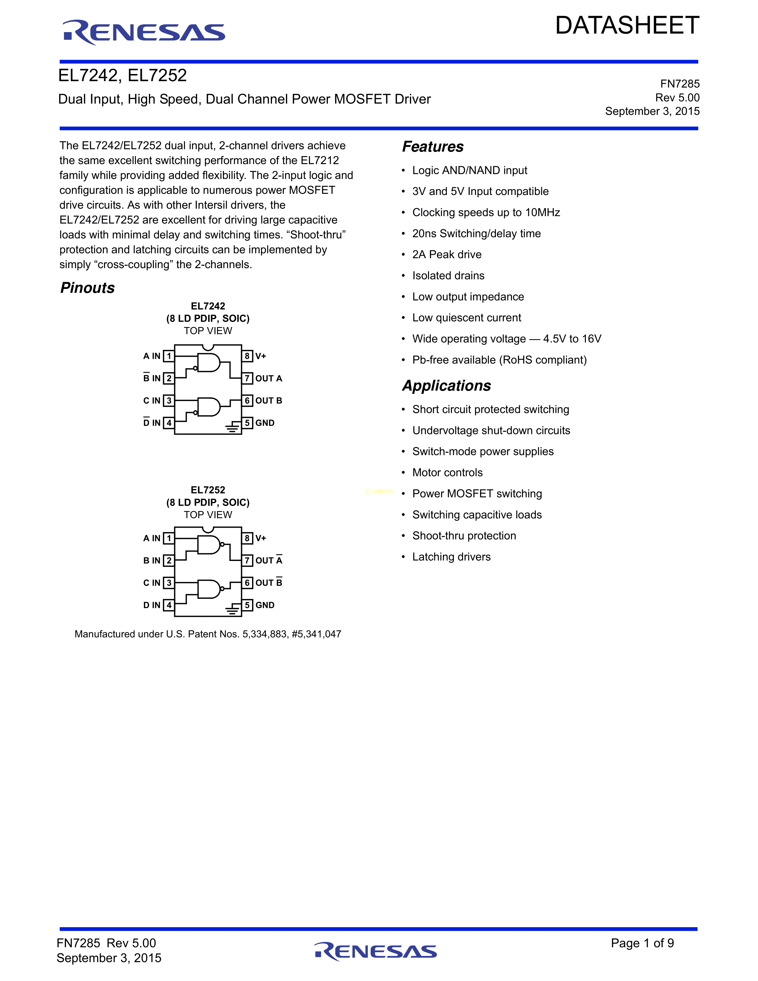 EL7252CSZ数据手册SOIC-8封装RENESAS(瑞萨)-IDTPDF规格书,中英文下载