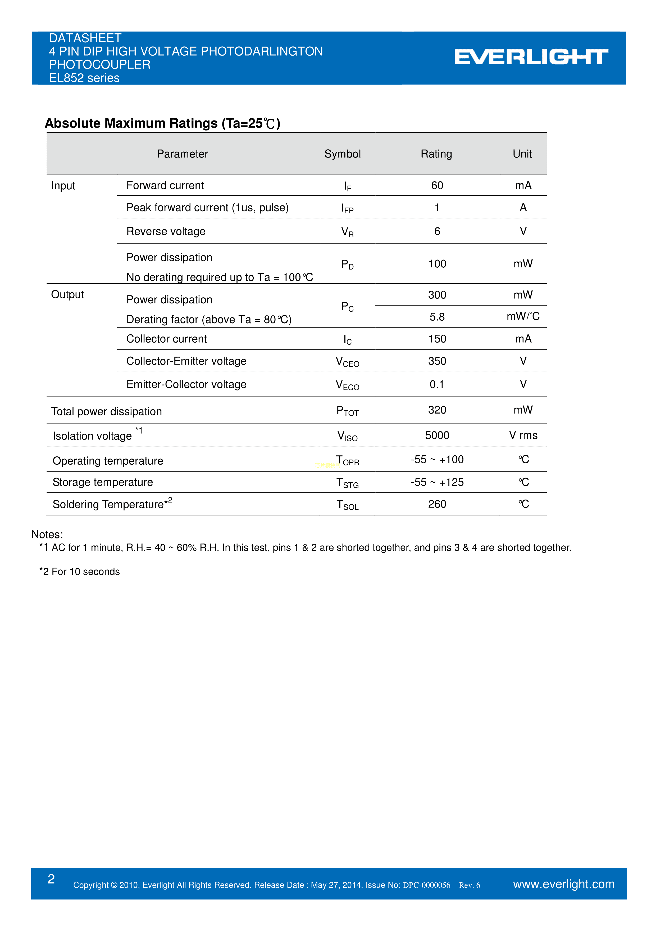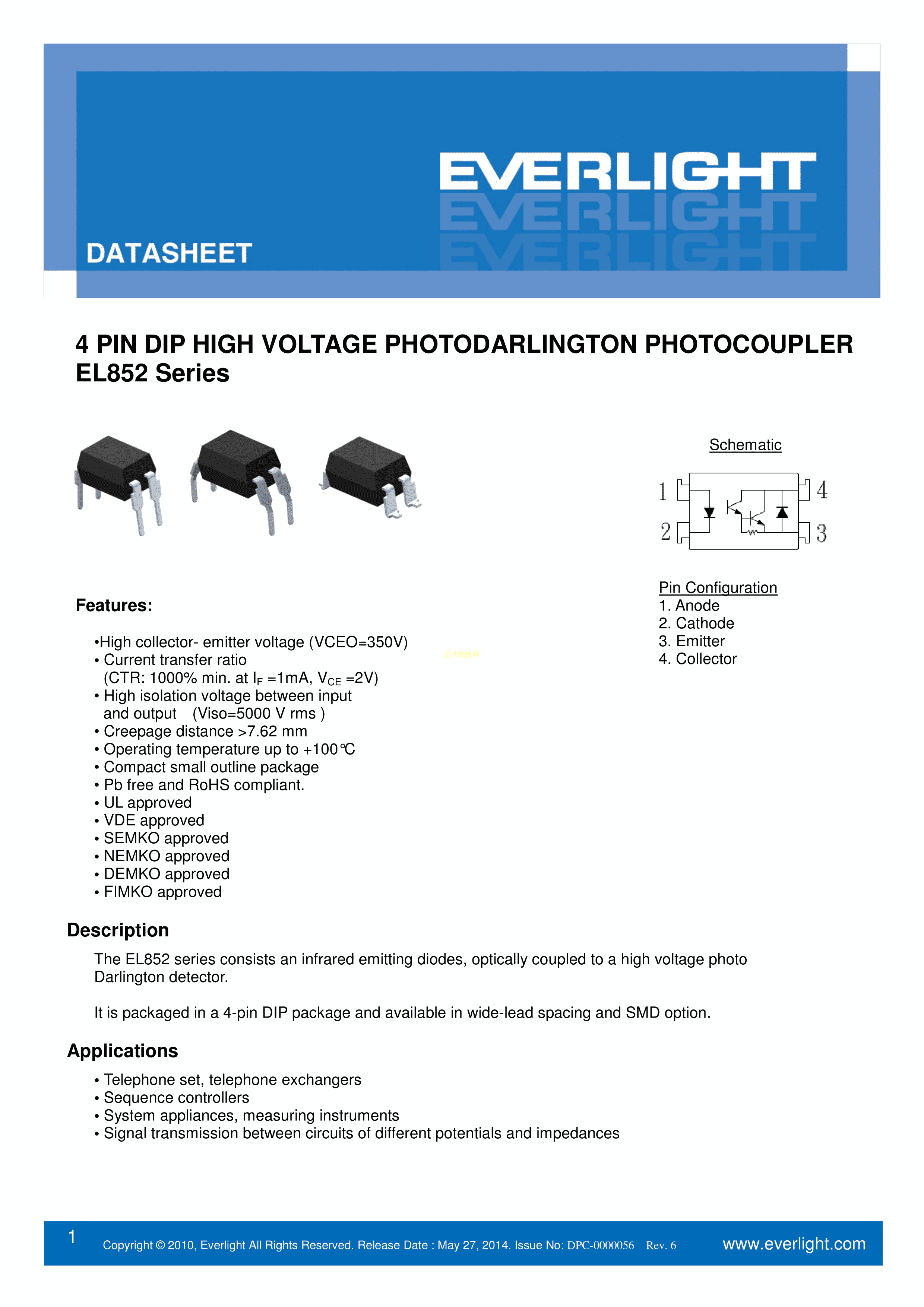 EL852数据手册DIP-4封装EVERLIGHT(台湾亿光)PDF规格书,中英文下载
