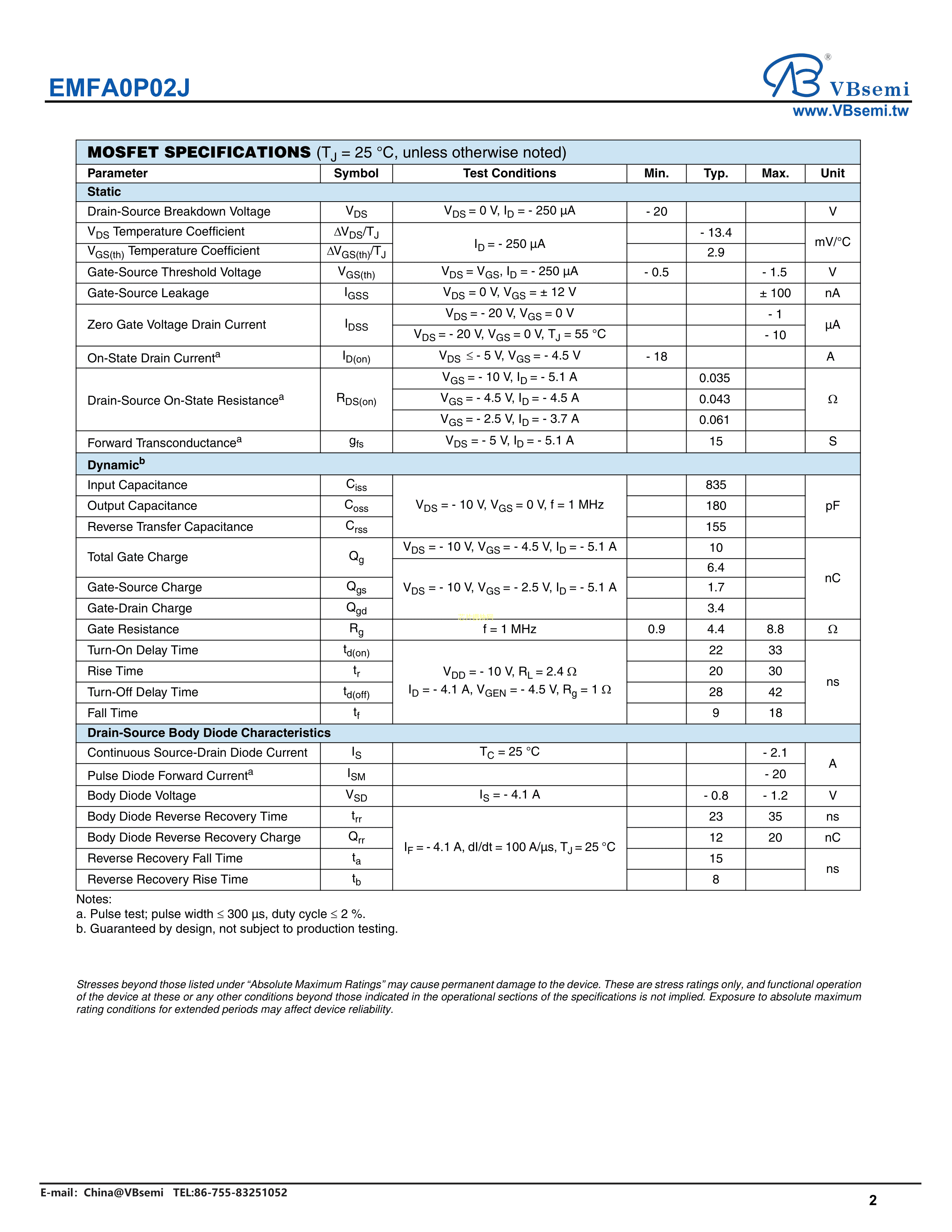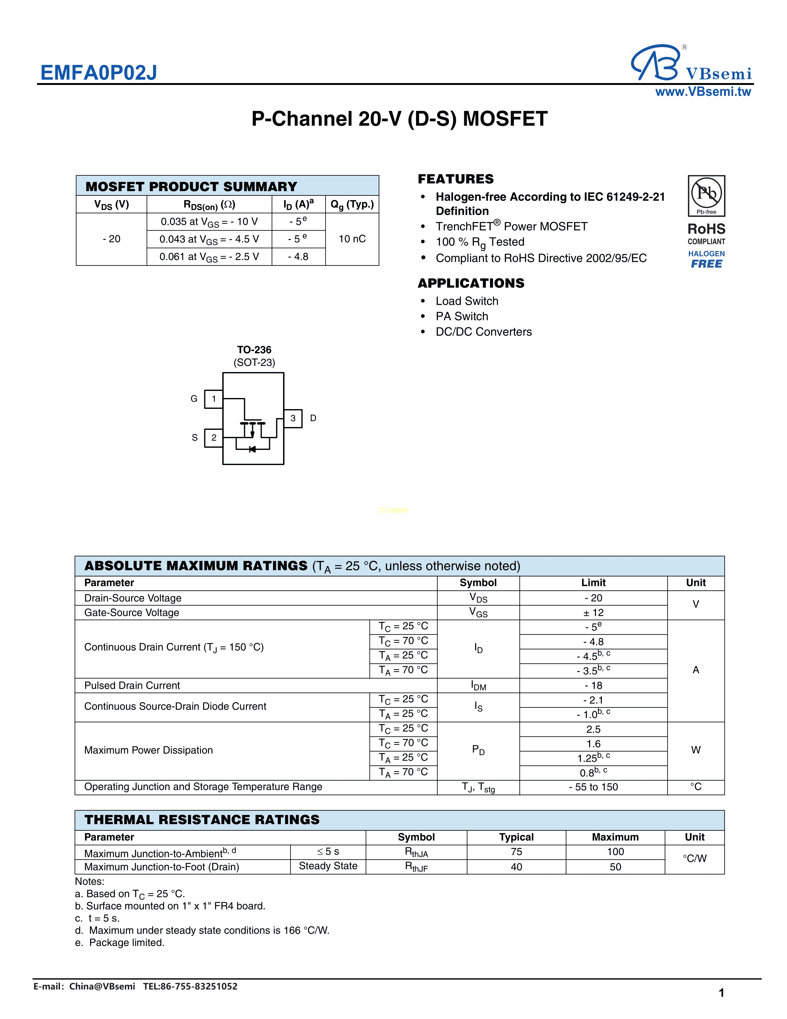 EMFA0P02J数据手册SOT-23-3封装VBsemi(台湾微碧)PDF规格书,中英文下载