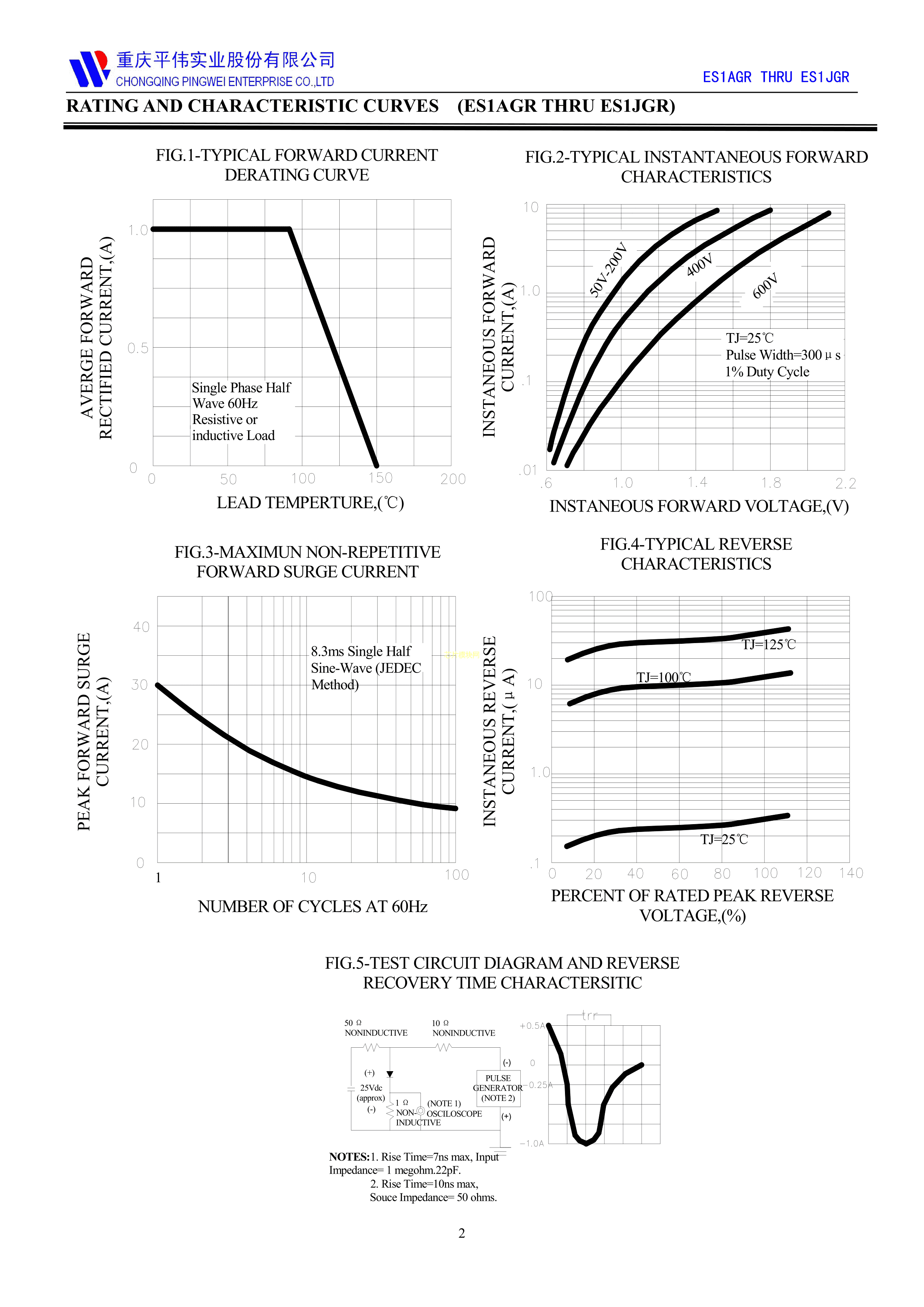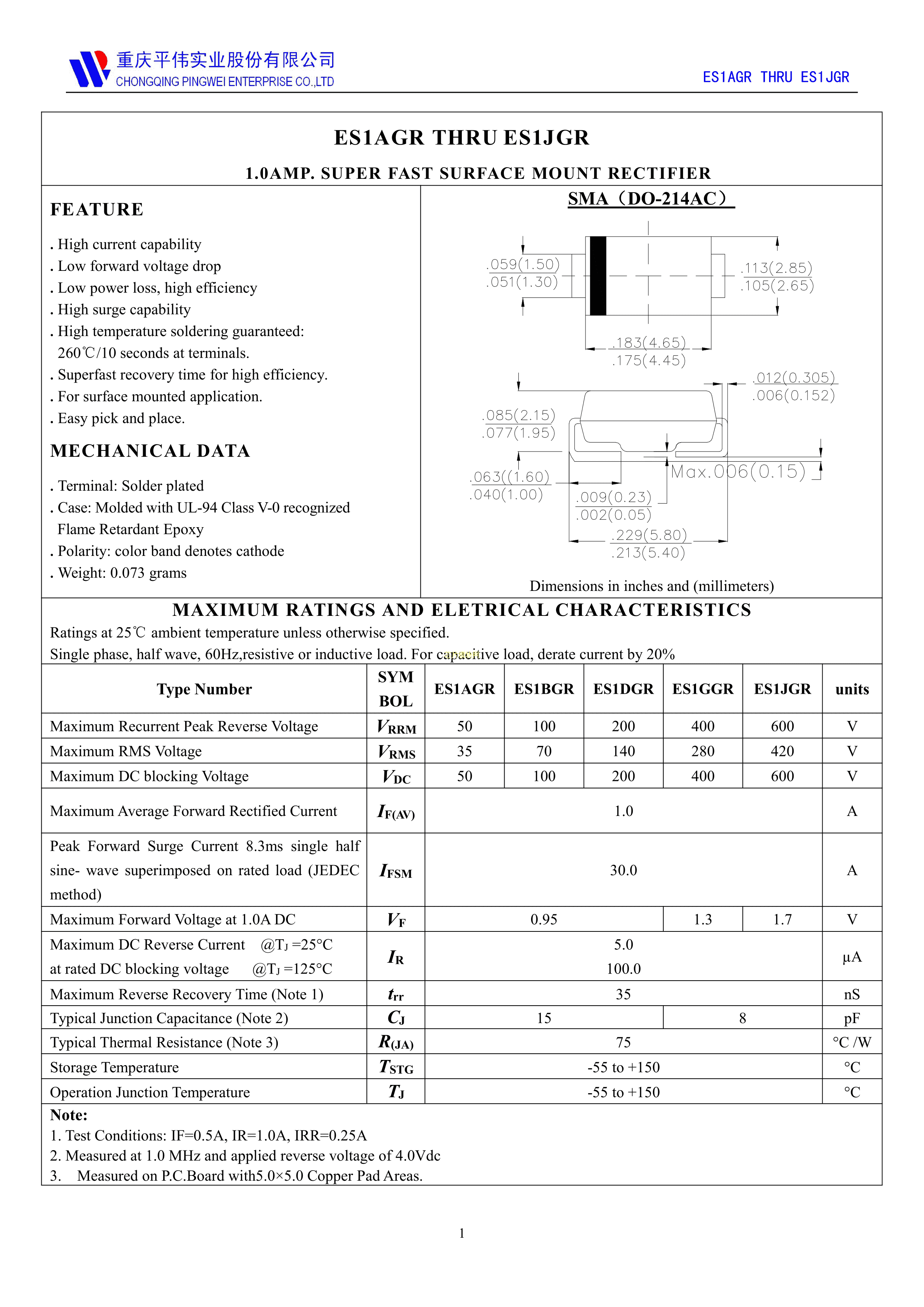 ES1JGR数据手册SMA封装PINGWEI(平伟)PDF规格书,中英文下载