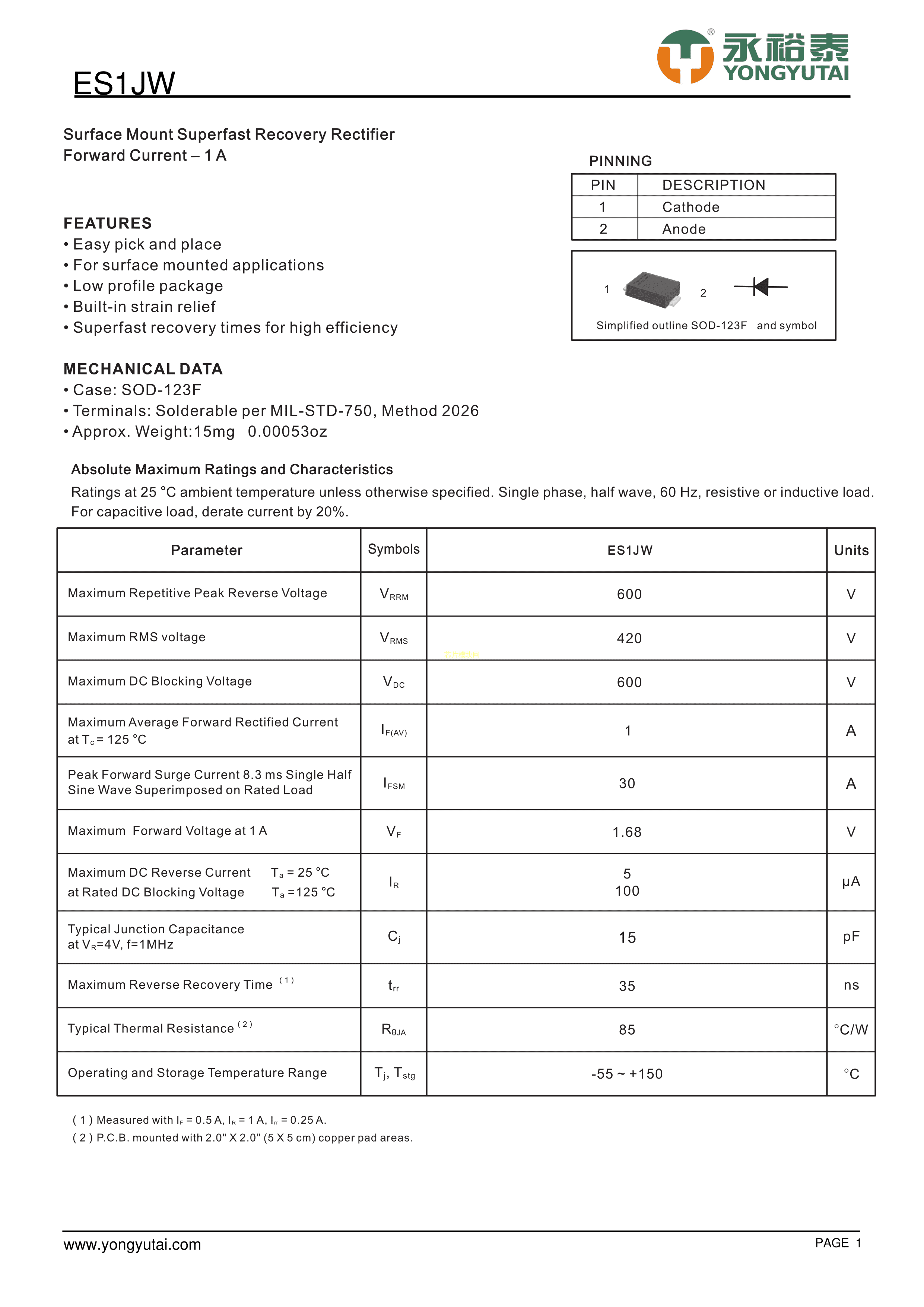 ES1JW数据手册SOD-123F封装YONGYUTAI(永裕泰)PDF规格书,中英文下载