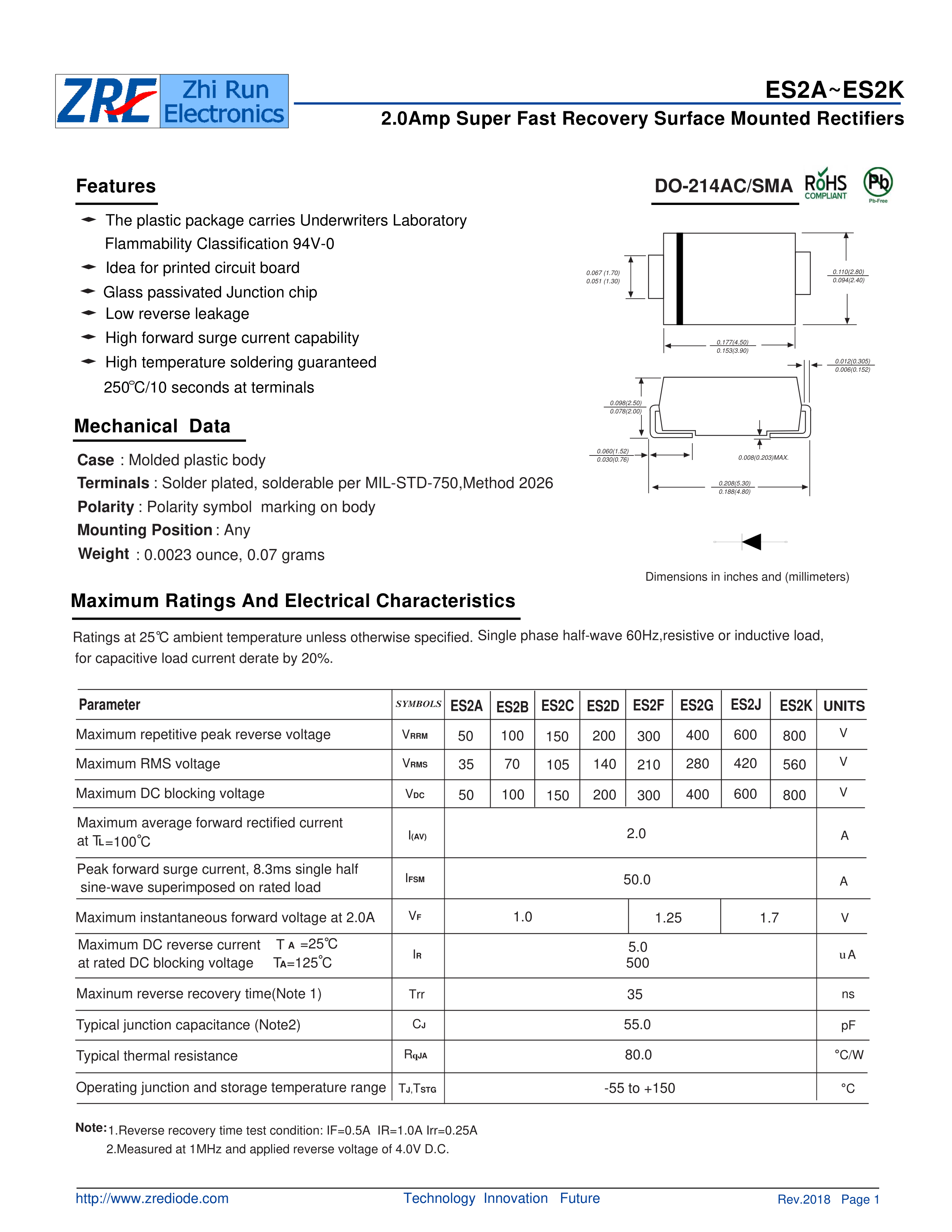 ES2J数据手册SMA封装ZRE(治润)PDF规格书,中英文下载