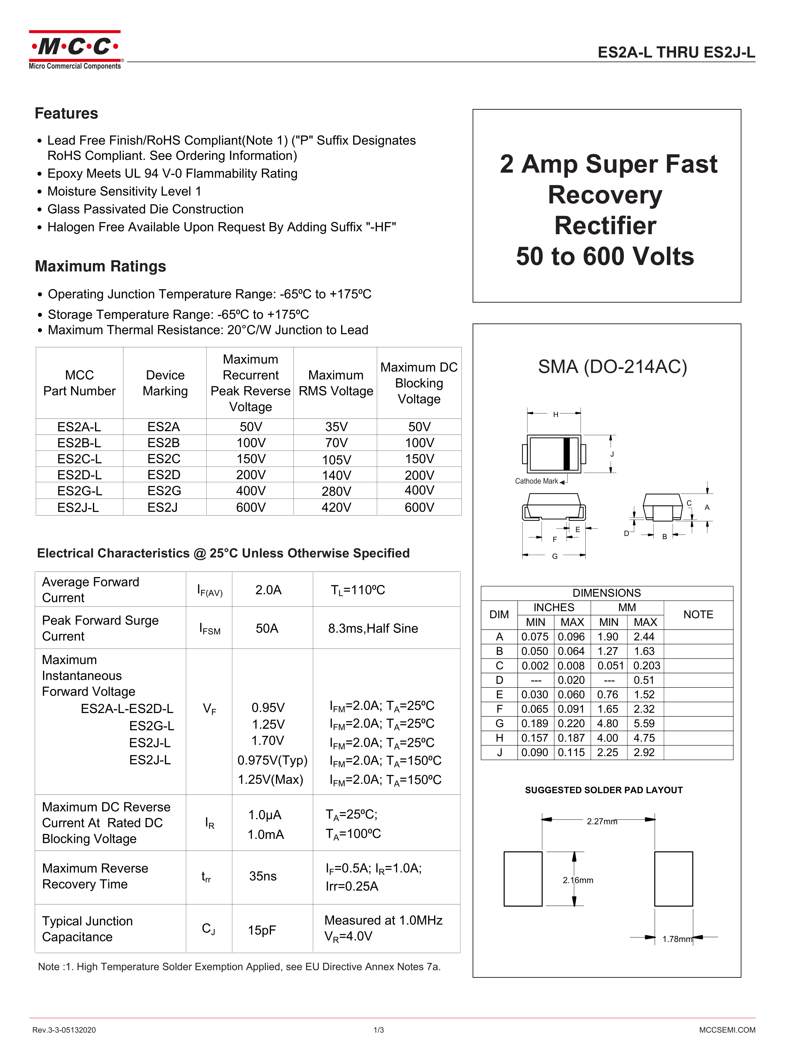 ES2J-LTP数据手册SMA封装MCC(美微科)PDF规格书,中英文下载