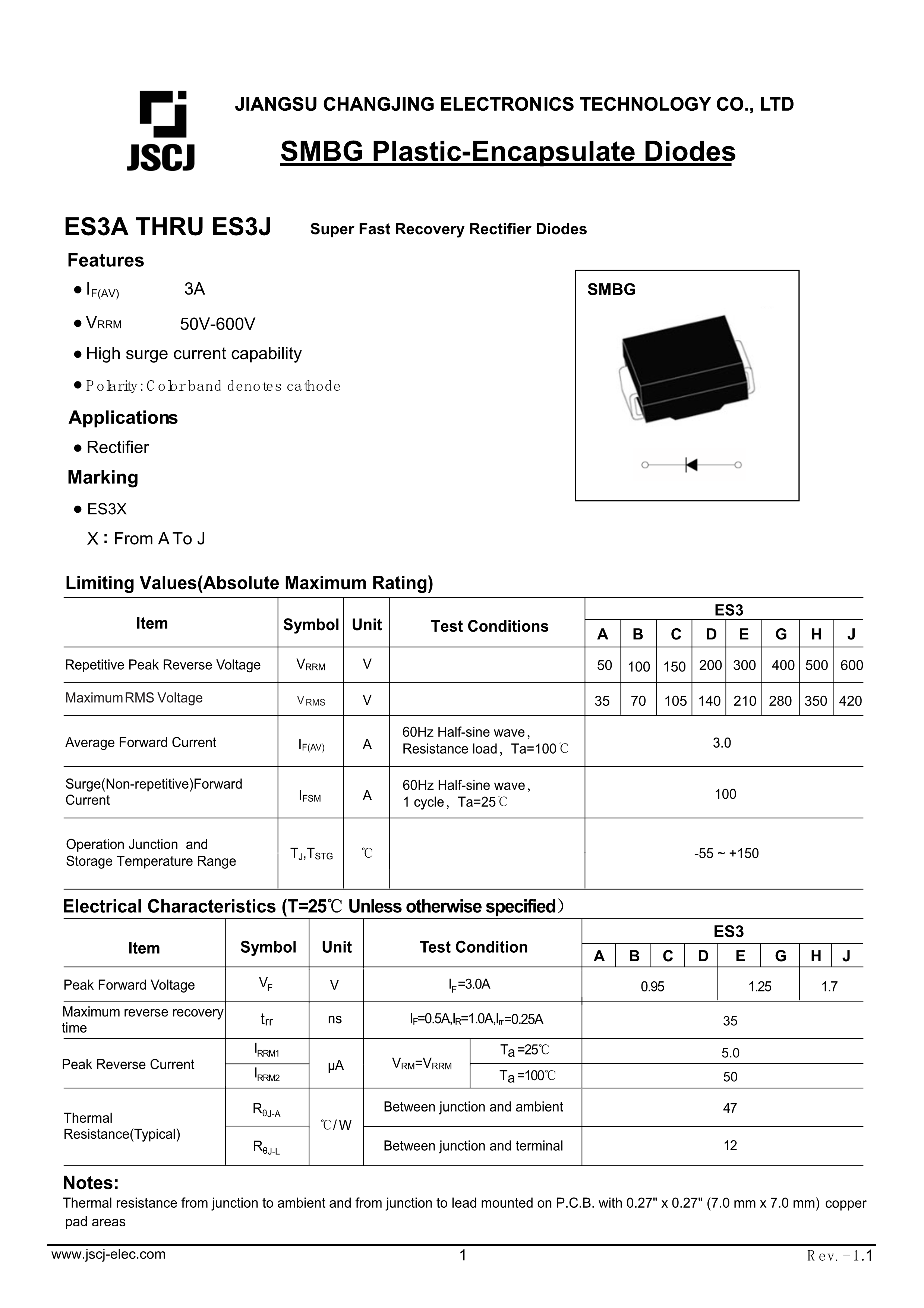 ES3J数据手册SMBG封装CJ(江苏长电-长晶)PDF规格书,中英文下载