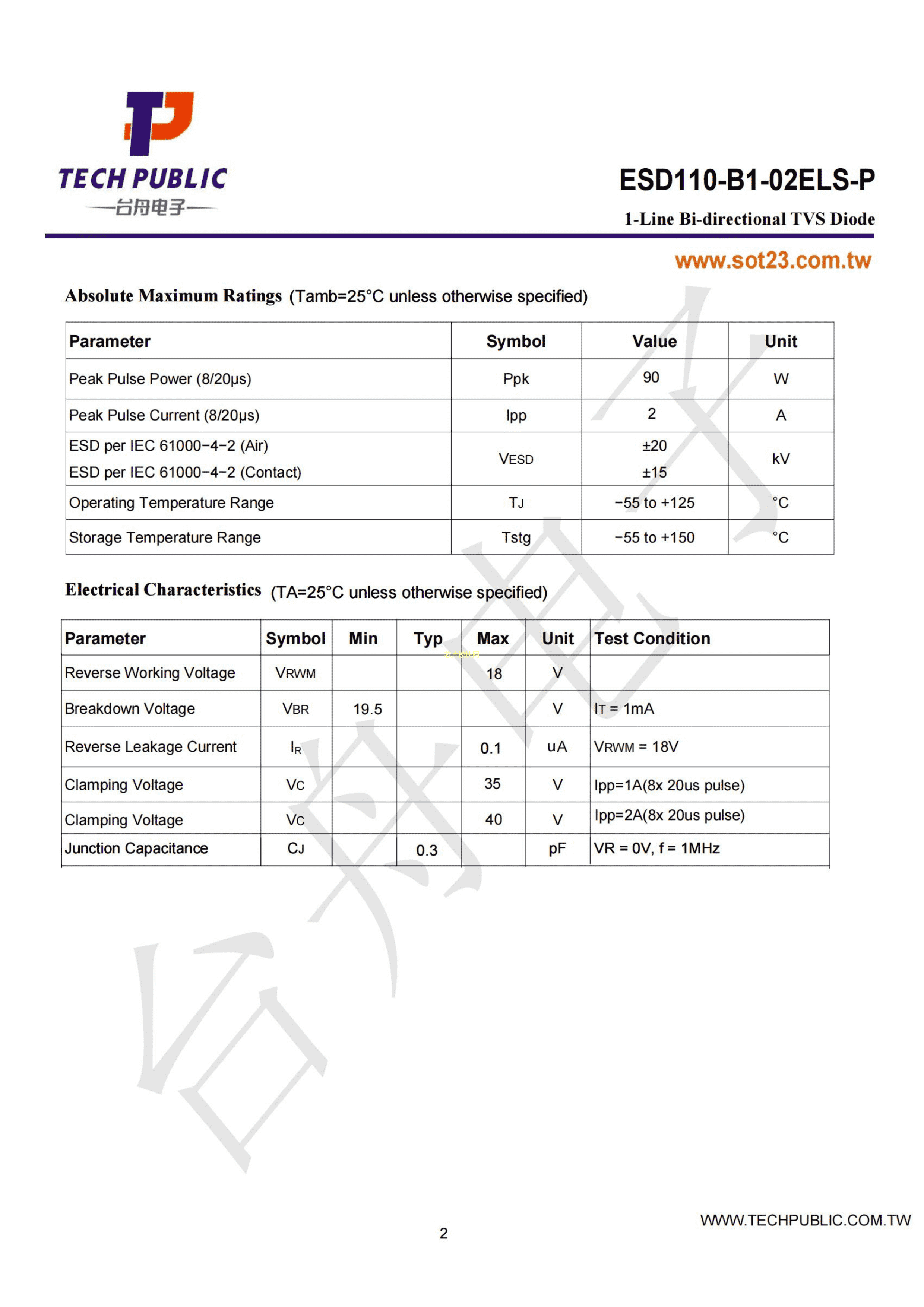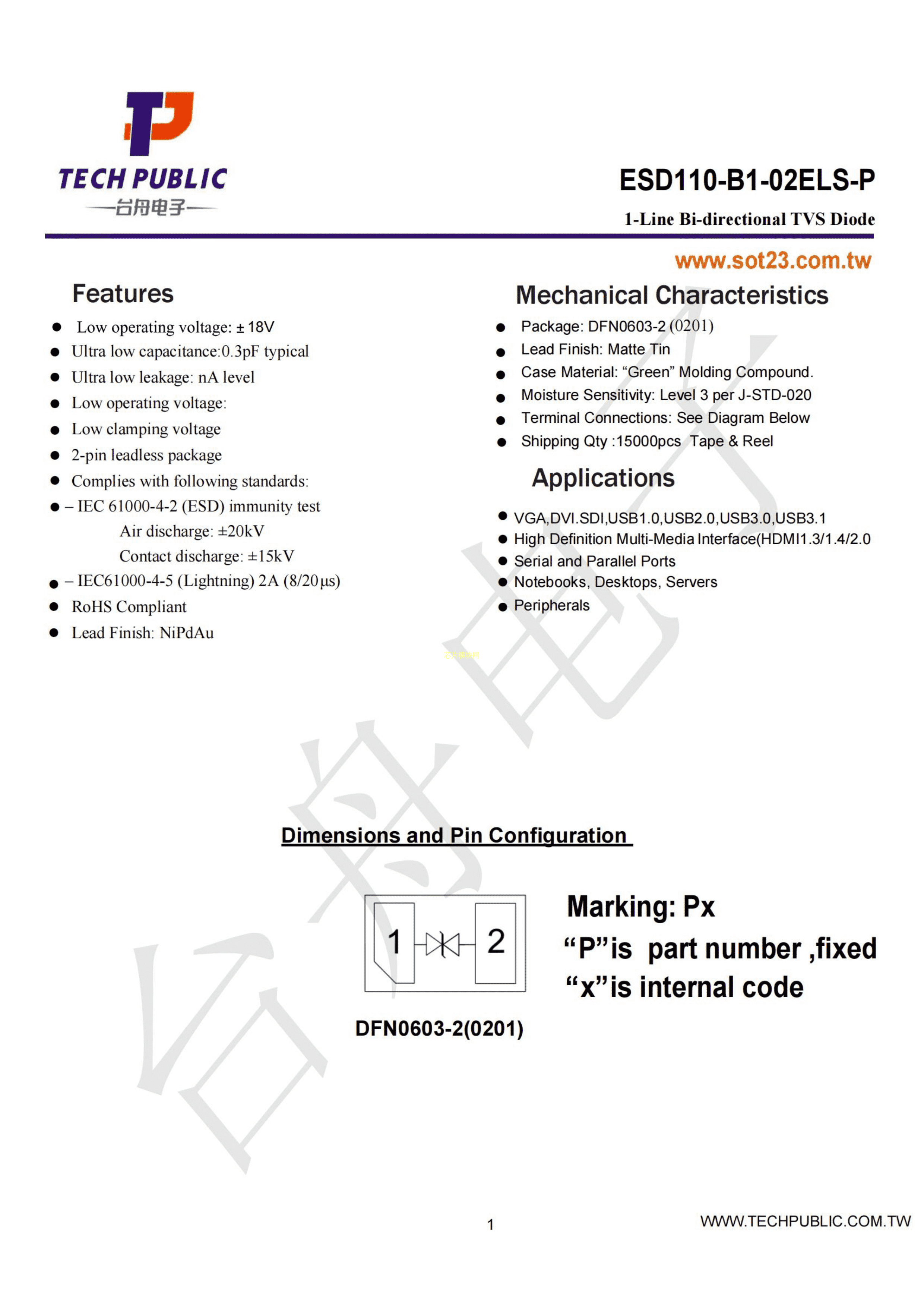 ESD110-B1-02ELS-P数据手册DFN0603-2封装TECHPUBLIC(台舟)PDF规格书,中英文下载