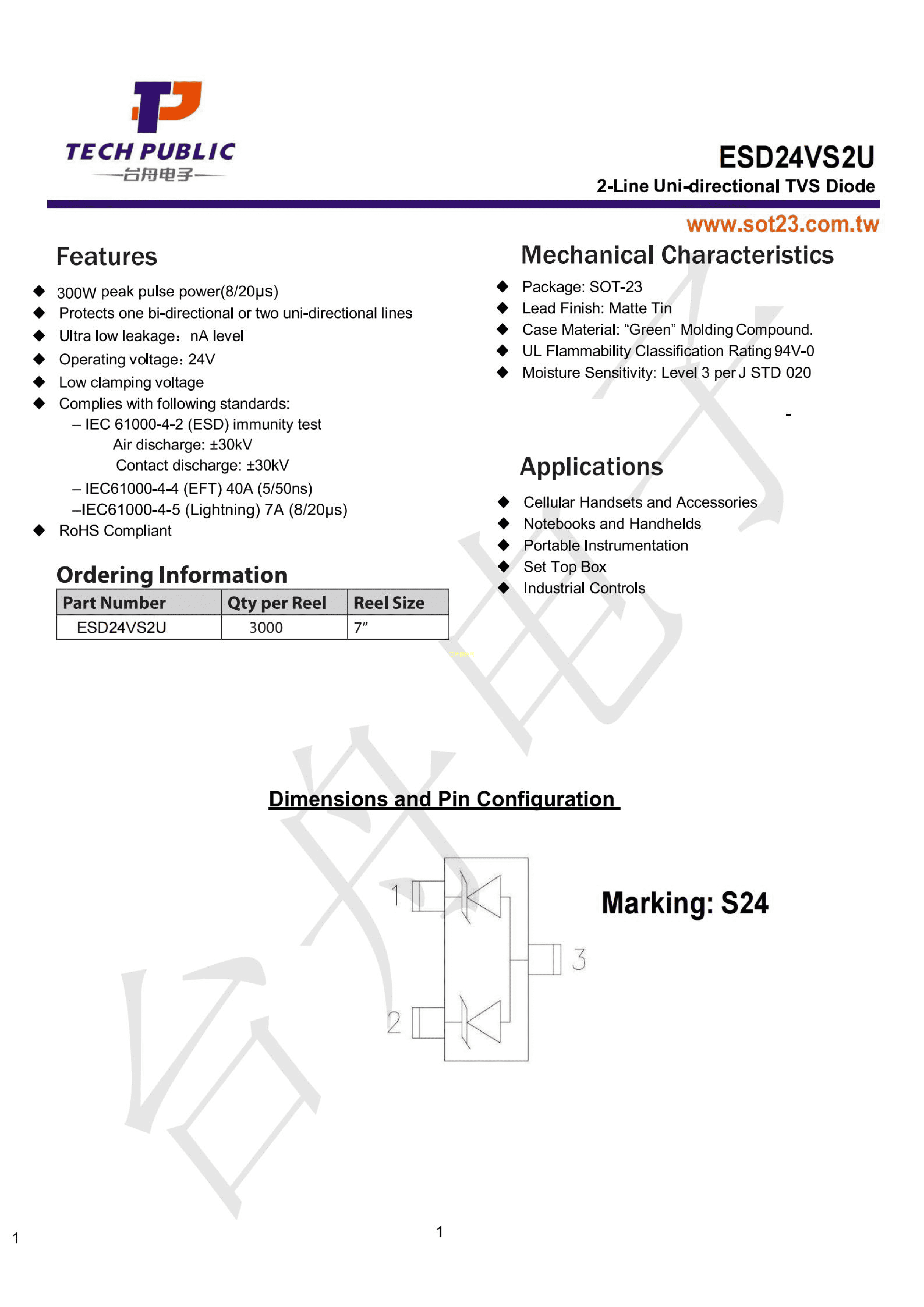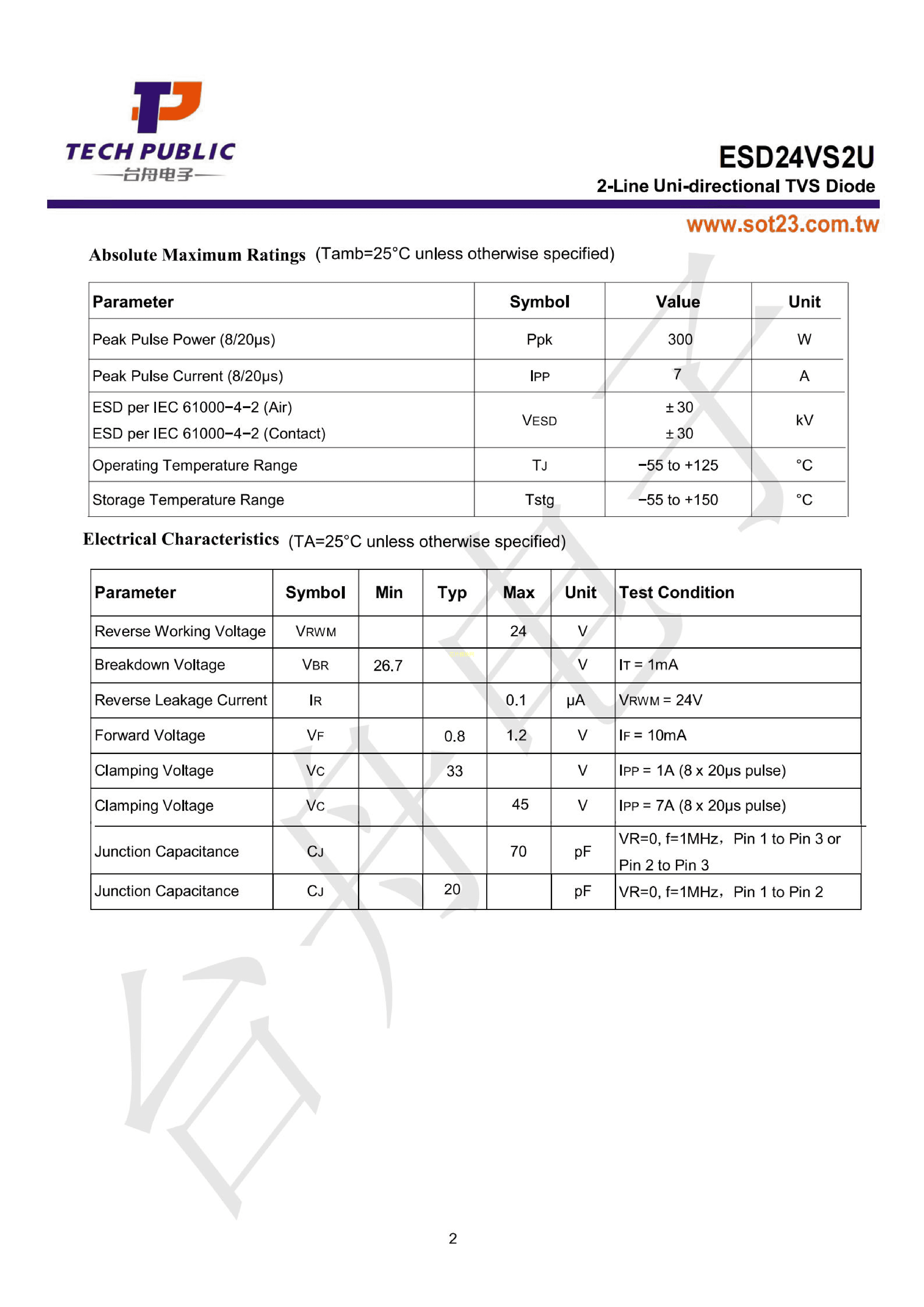 ESD24VS2U数据手册SOT-23-3封装TECHPUBLIC(台舟)PDF规格书,中英文下载