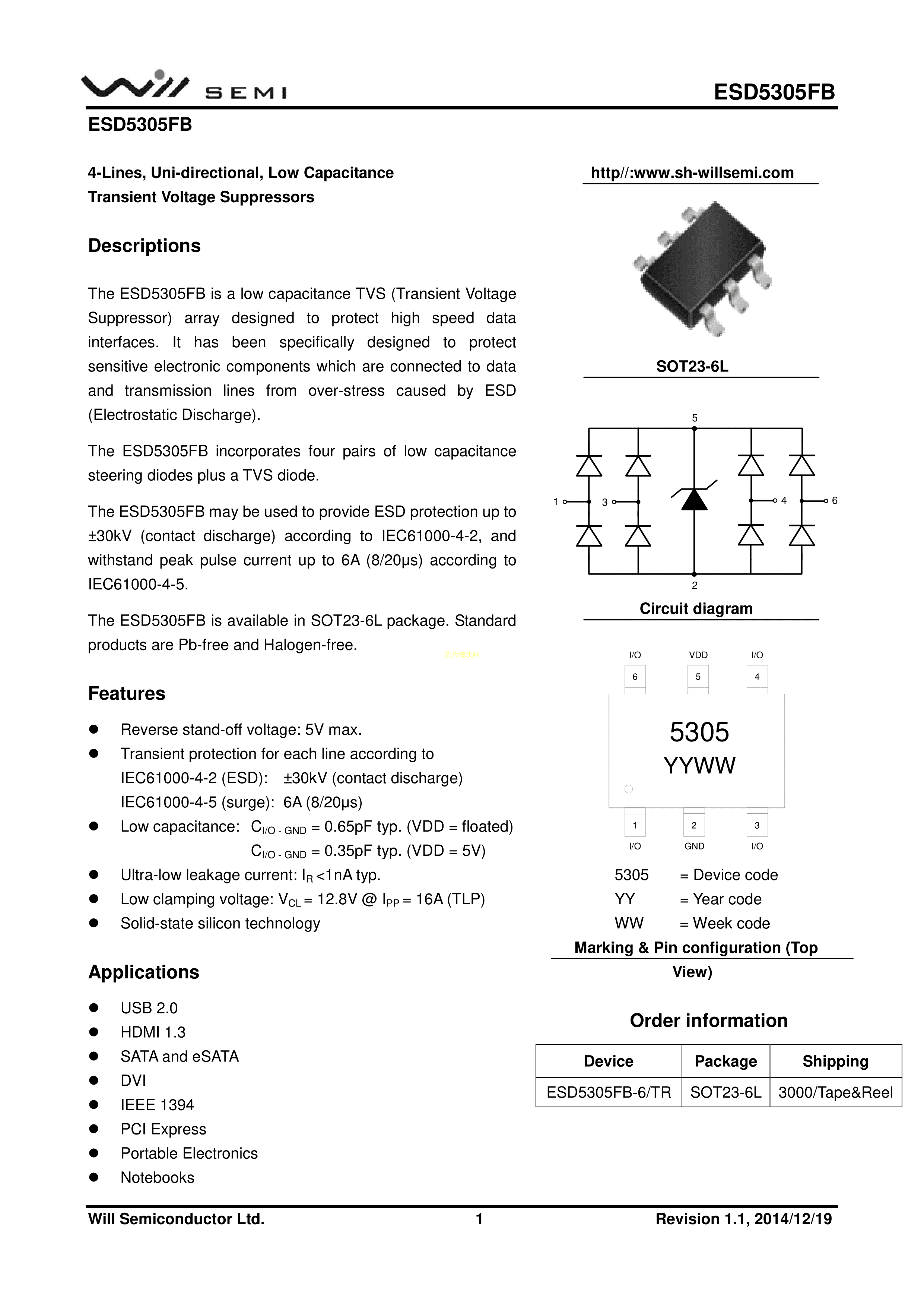 ESD5305FB-6-TR数据手册SOT-23-6L封装WILLSEMI(韦尔)PDF规格书,中英文下载