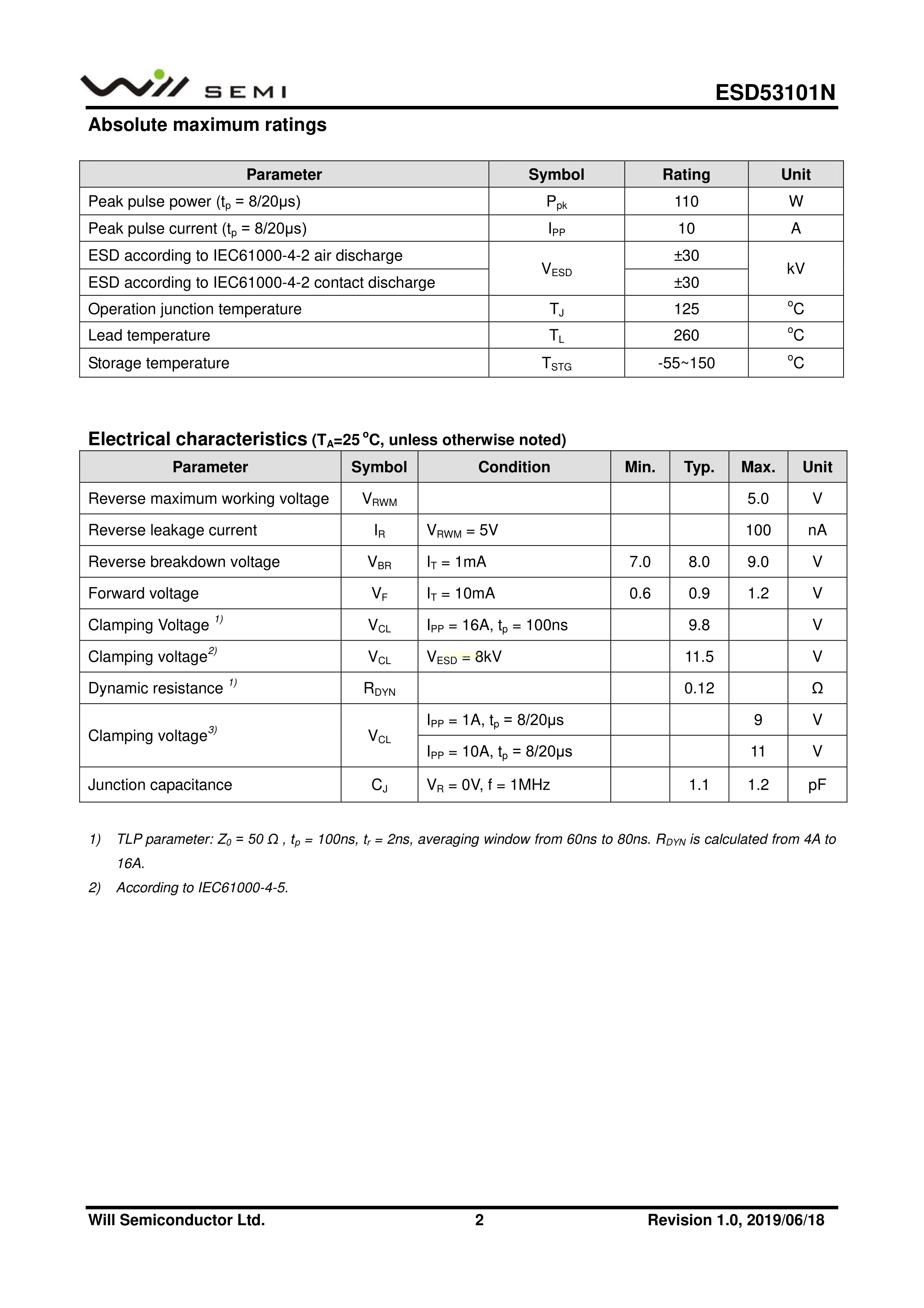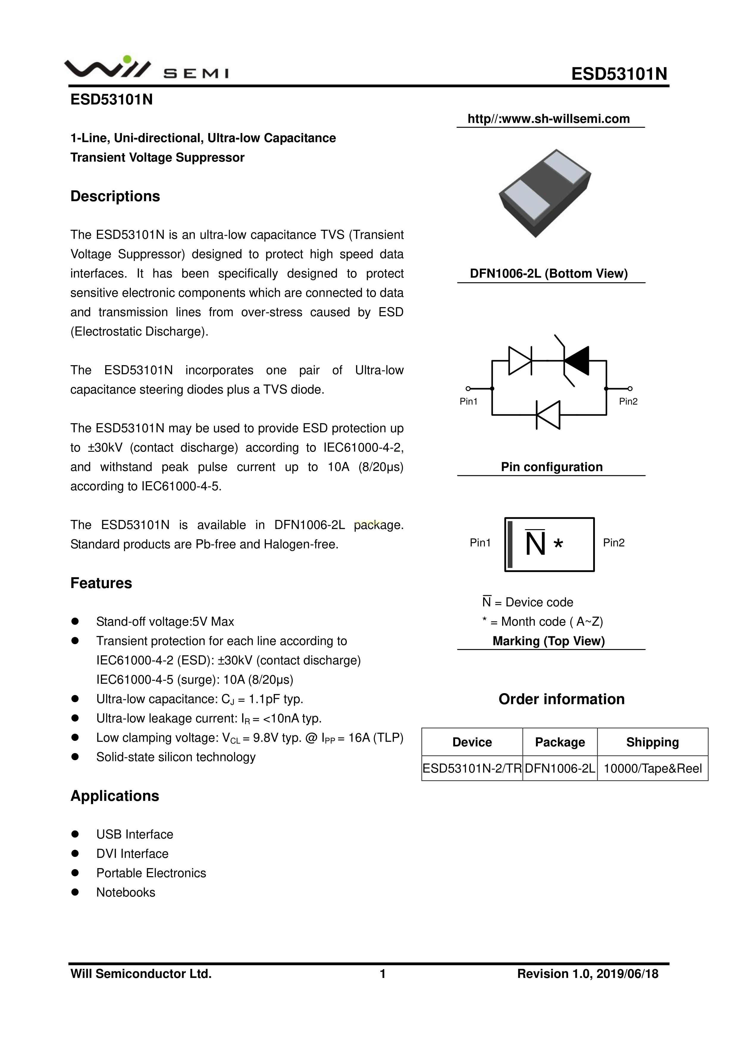 ESD53101N-2-TR数据手册DFN1006-2L封装WILLSEMI(韦尔)PDF规格书,中