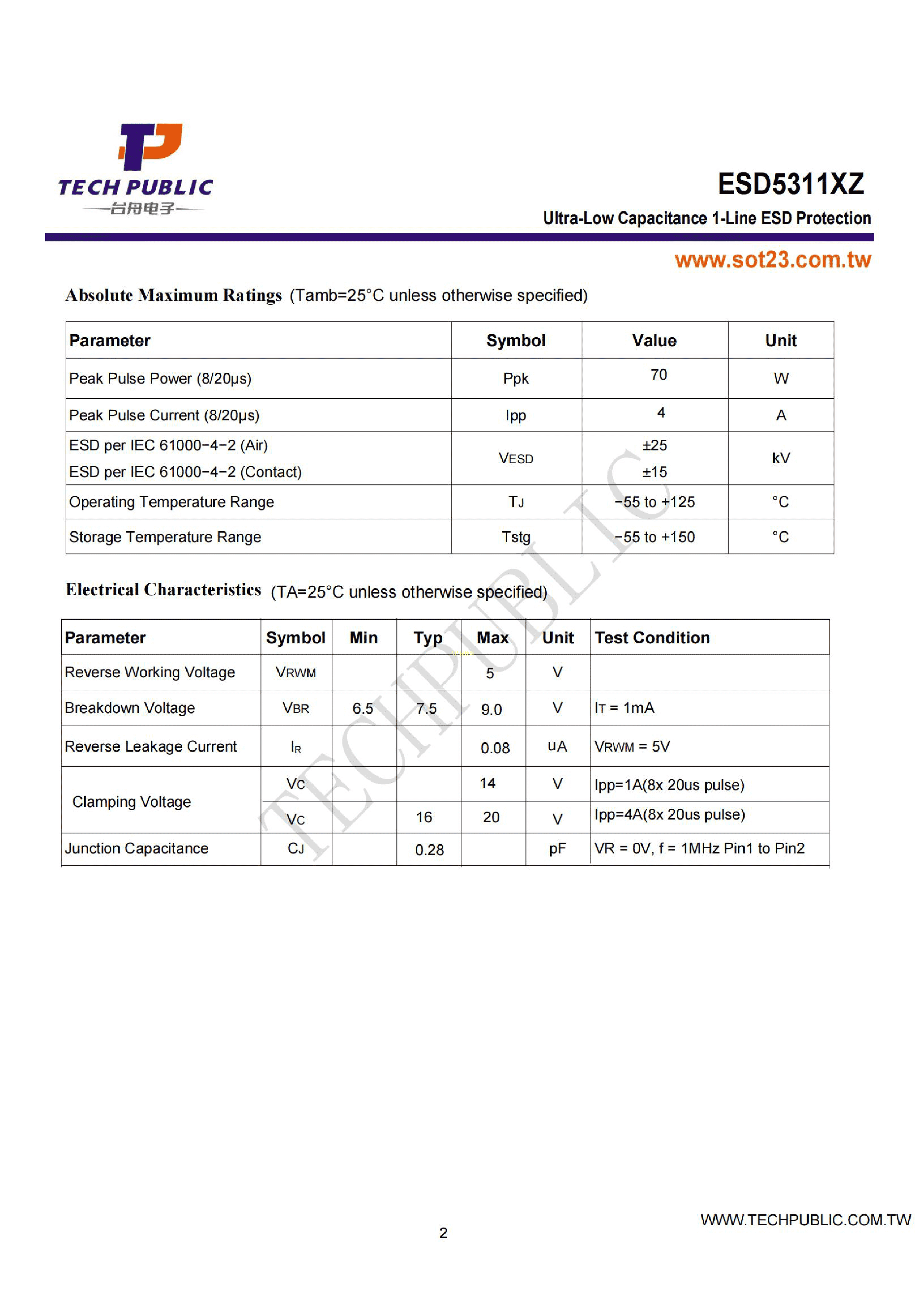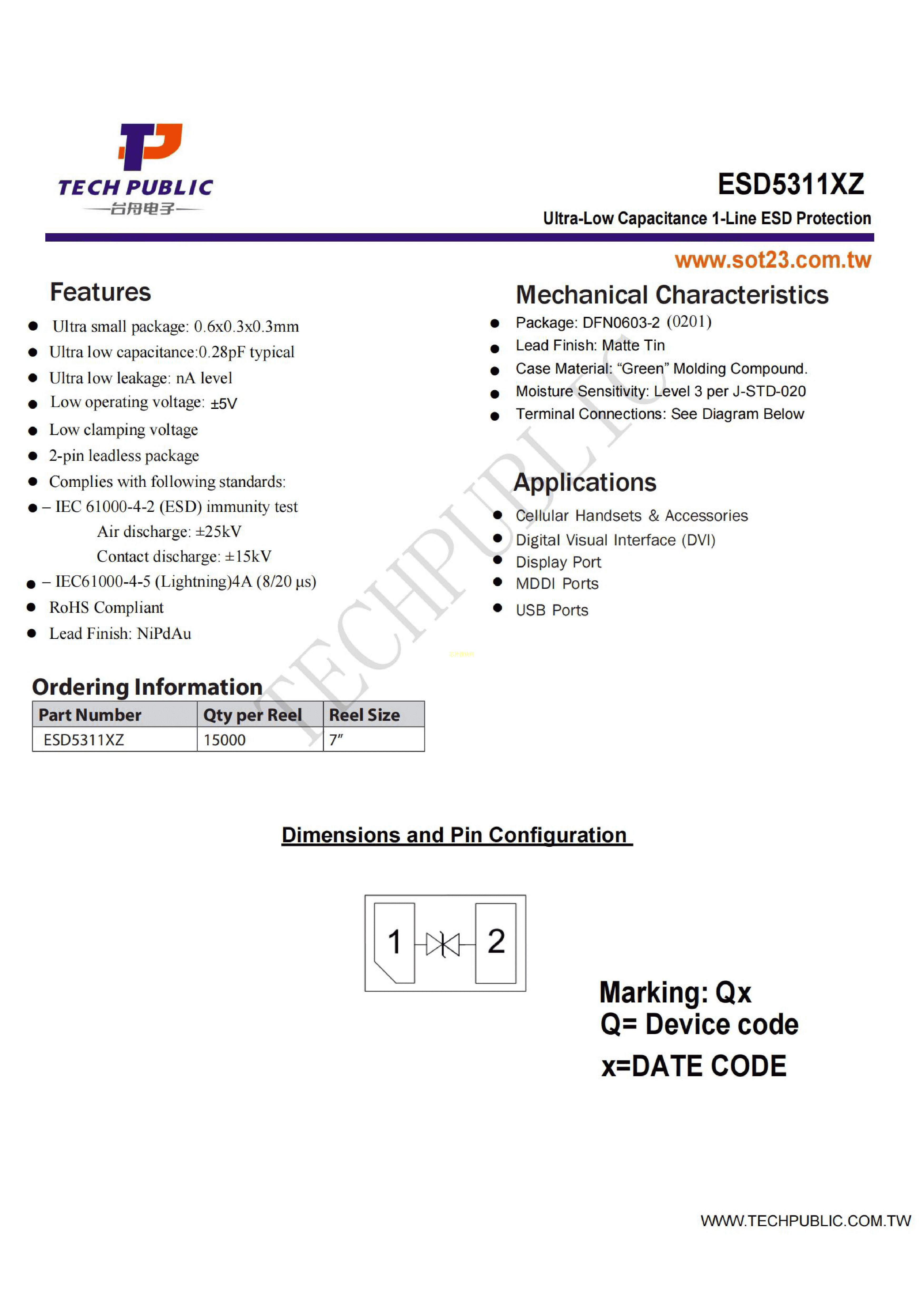 ESD5311XZ数据手册FBP0603-2封装TECHPUBLIC(台舟)PDF规格书,中英文下载