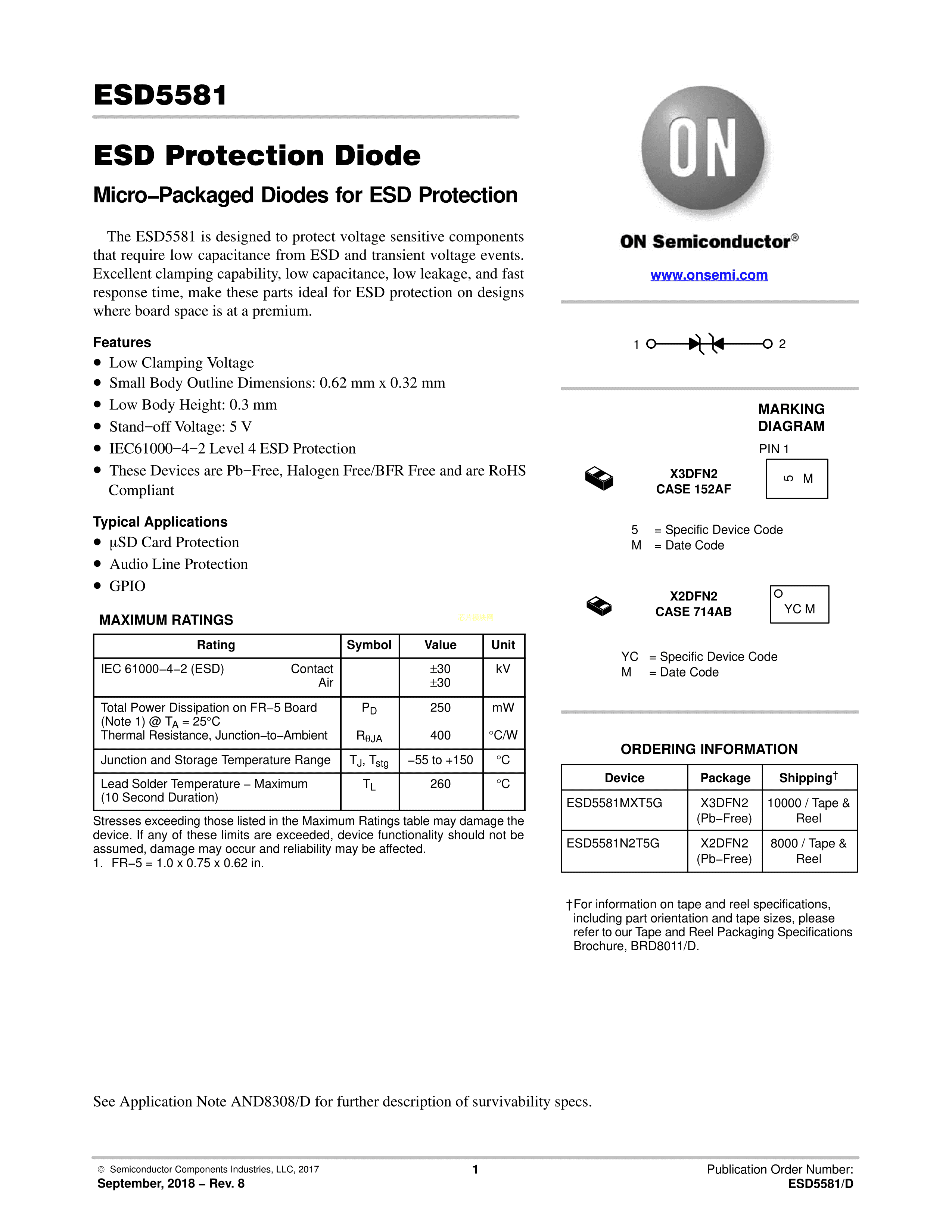 ESD5581N2T5G数据手册X2DFN-2封装onsemi(安森美)PDF规格书,中英文下载
