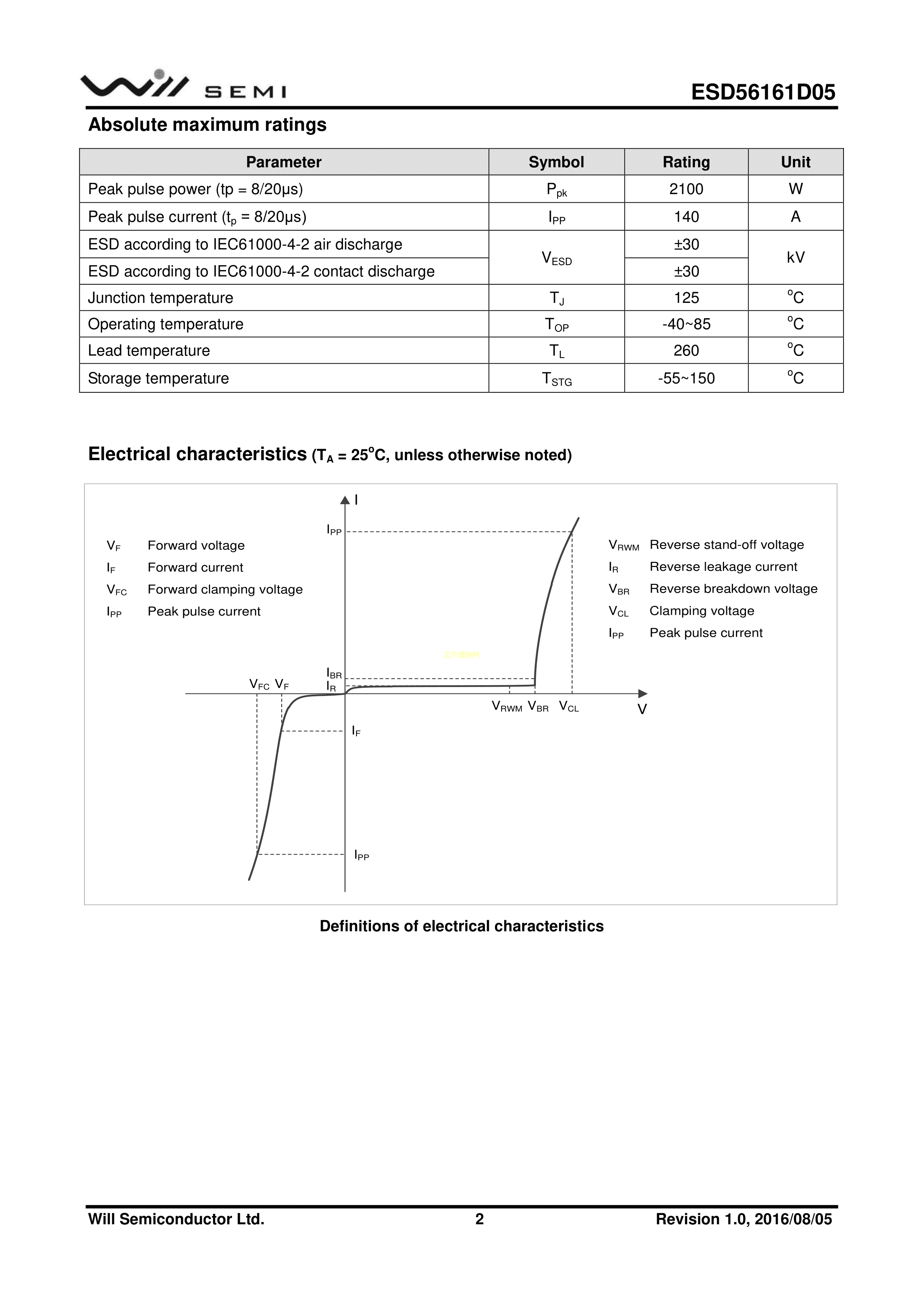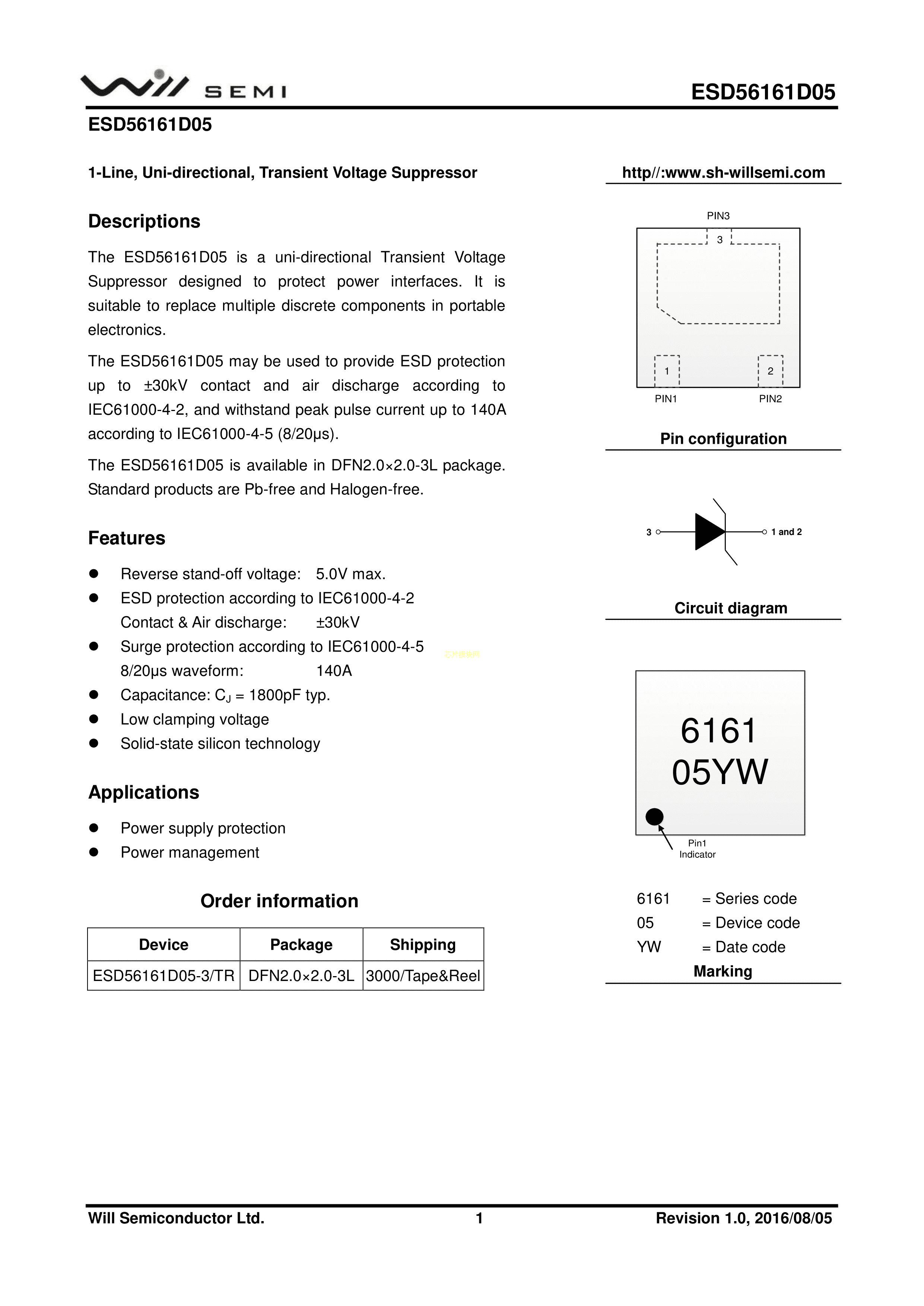 ESD56161D05-3-TR数据手册DFN2x2-3L封装WILLSEMI(韦尔)PDF规格书,