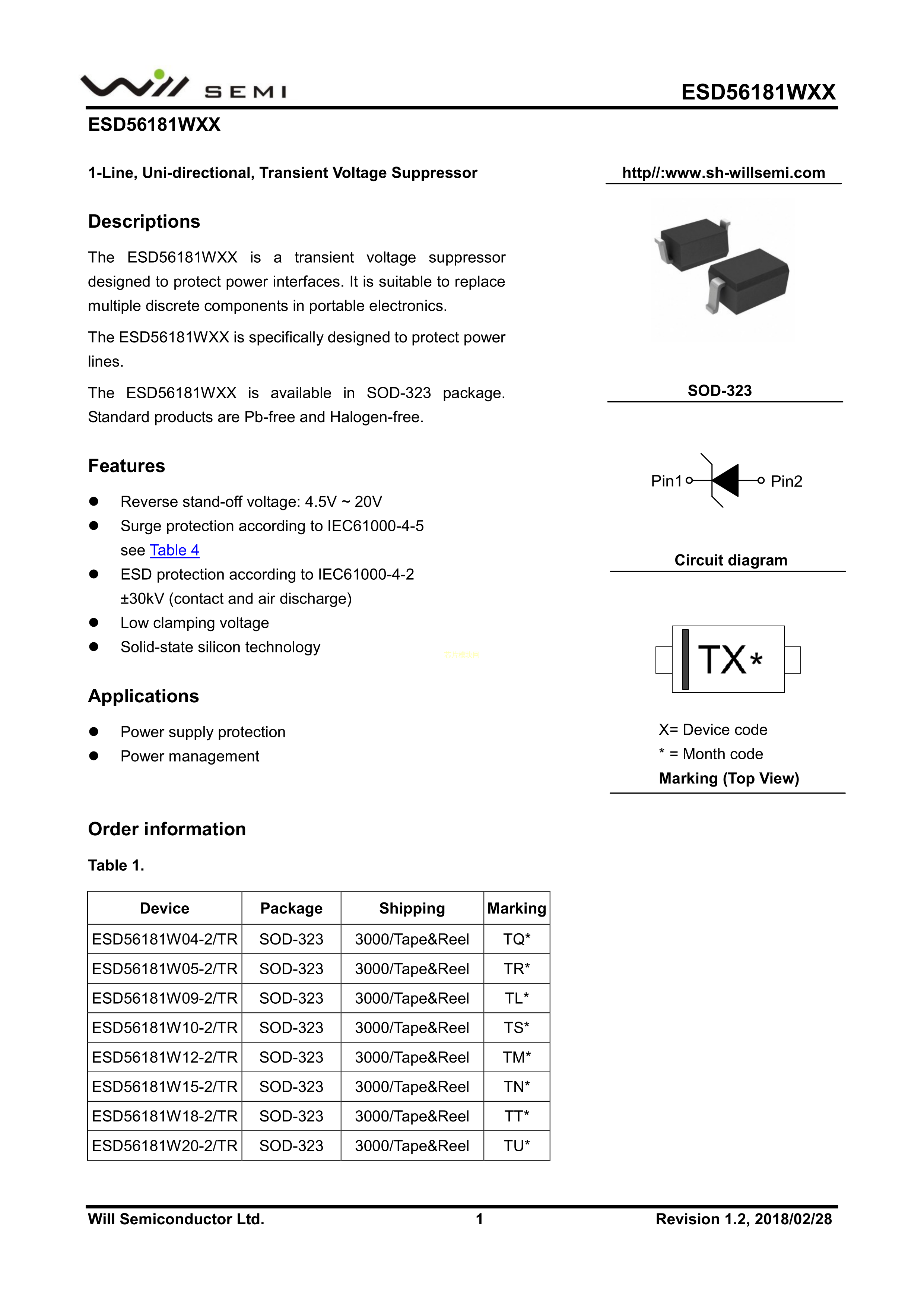 ESD56181W09-2-TR数据手册SOD-323封装WILLSEMI(韦尔)PDF规格书,中英