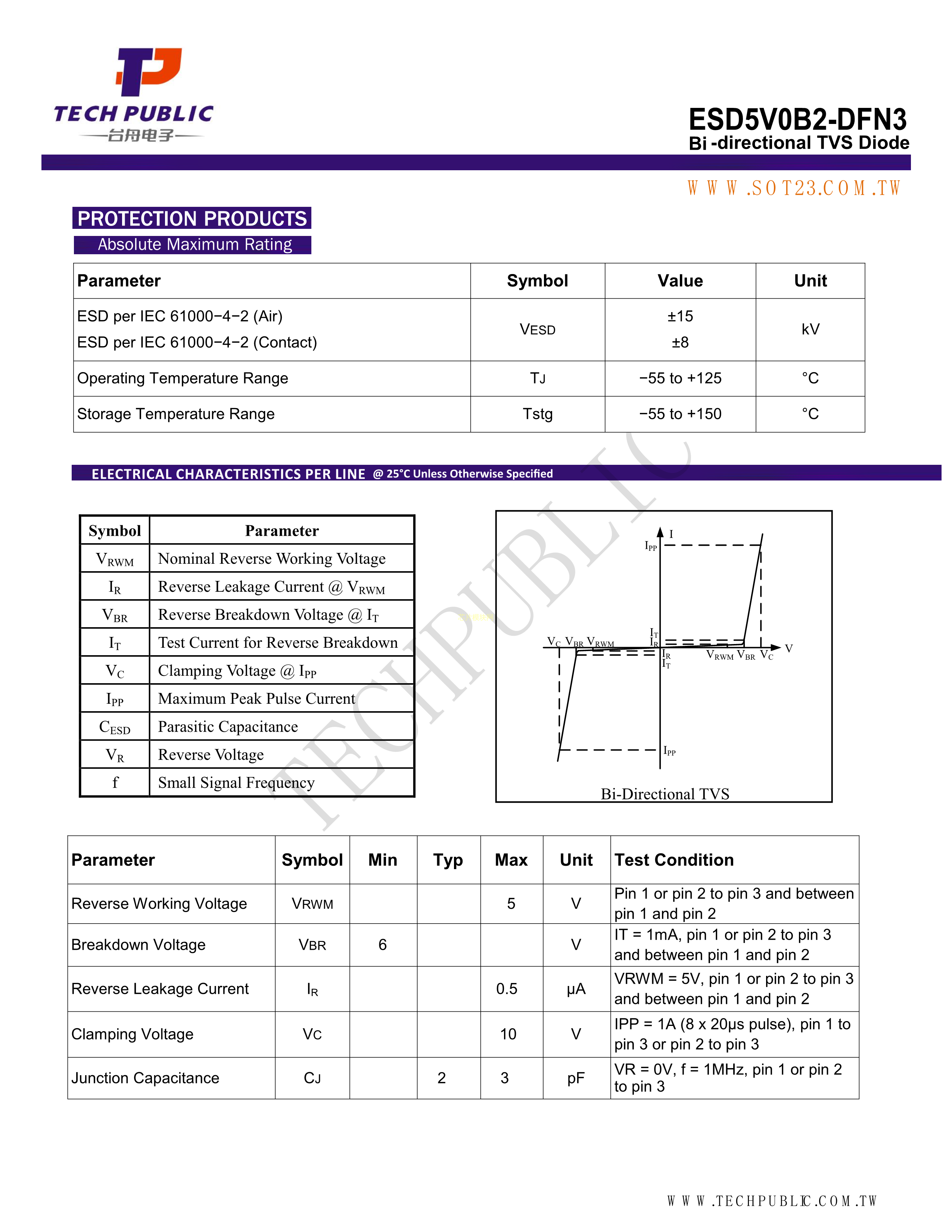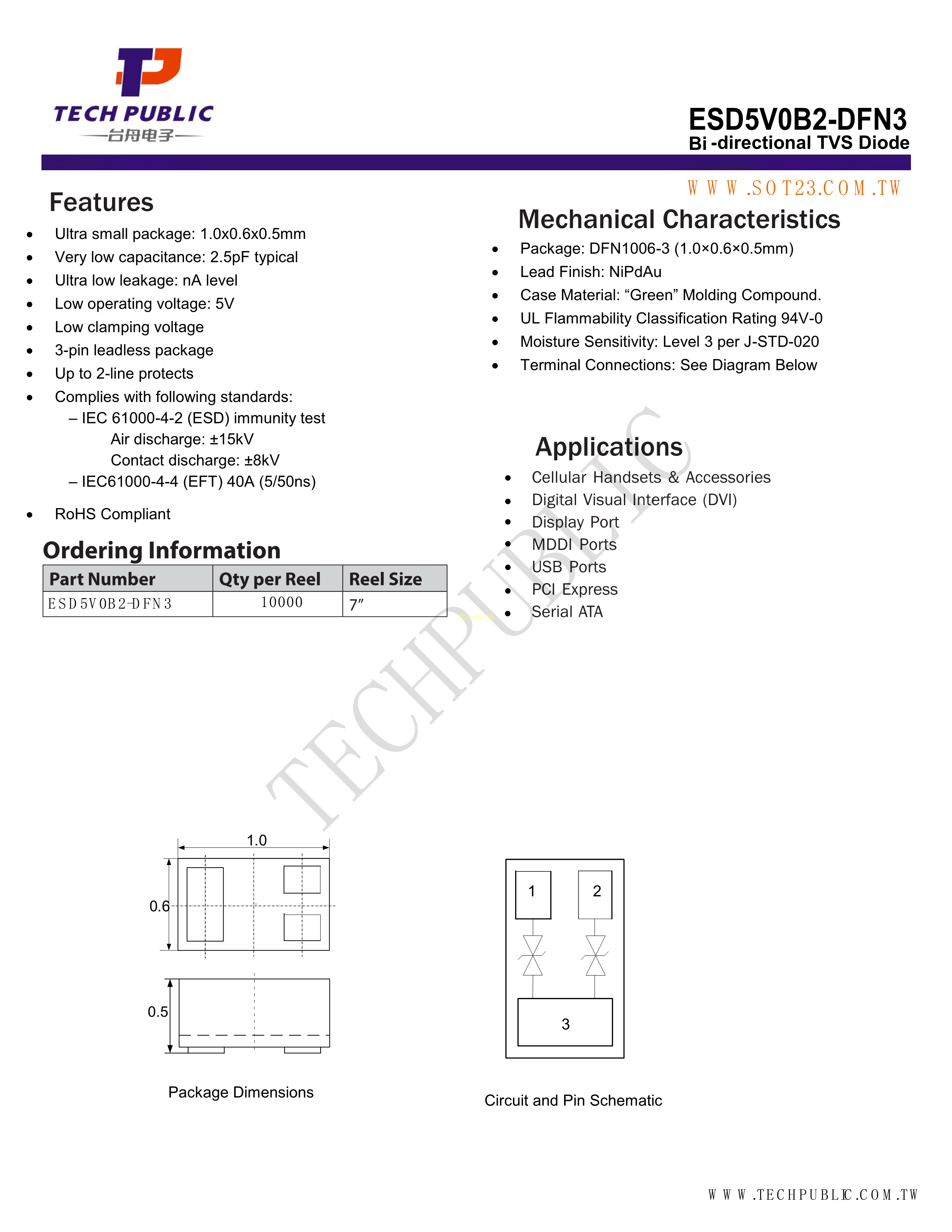 ESD5V0B2-DFN3数据手册DFN1006-3封装TECH PUBLIC(台舟)PDF规格书,