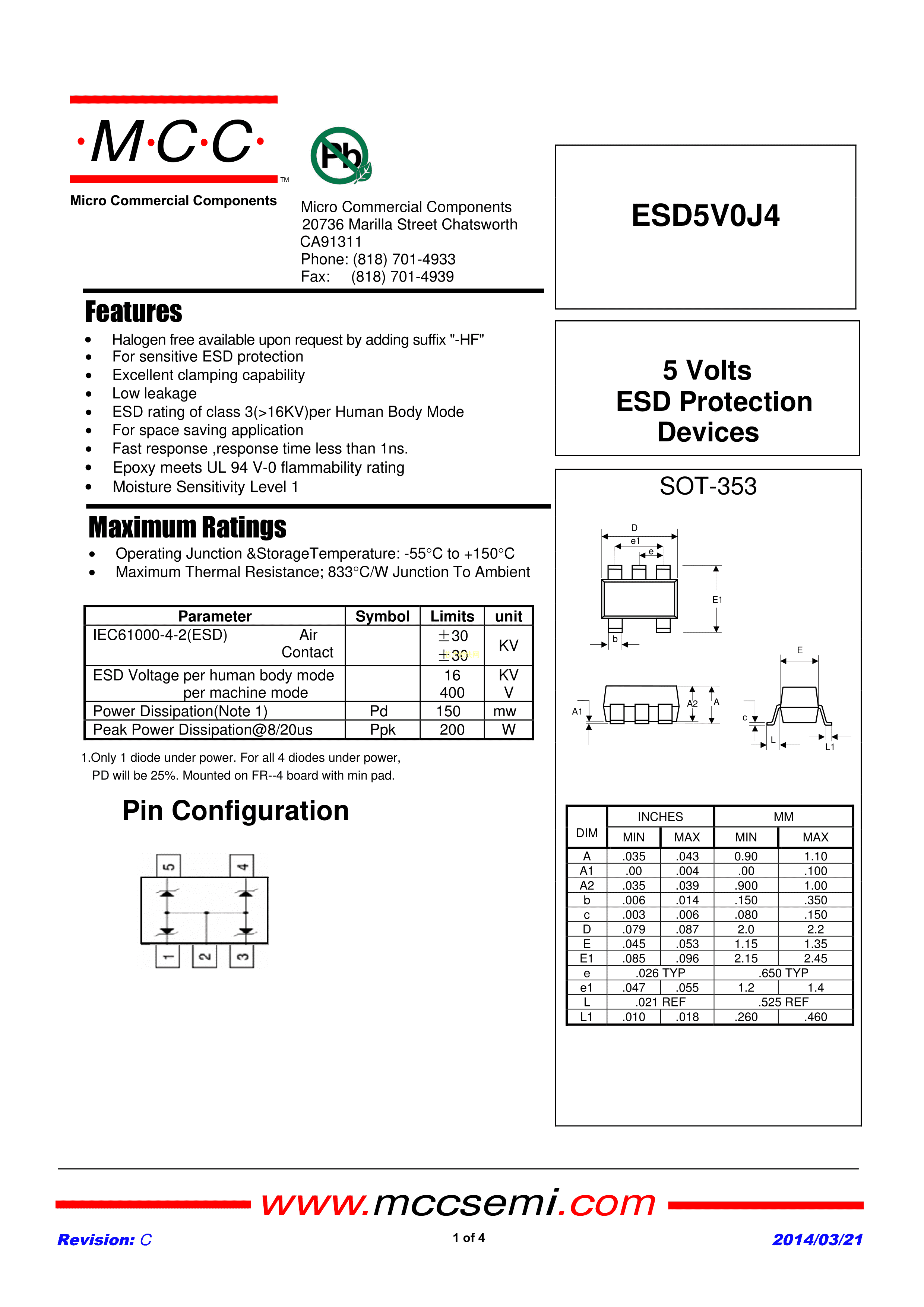ESD5V0J4-TP数据手册SOT-353封装MCC(美微科)PDF规格书,中英文下载