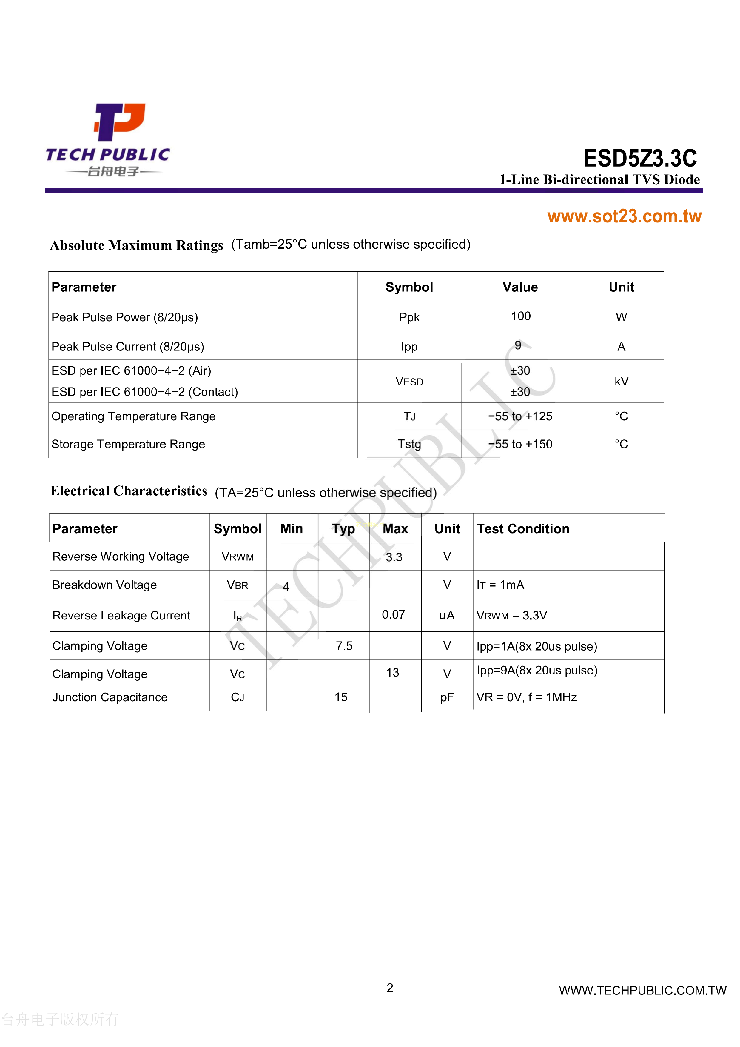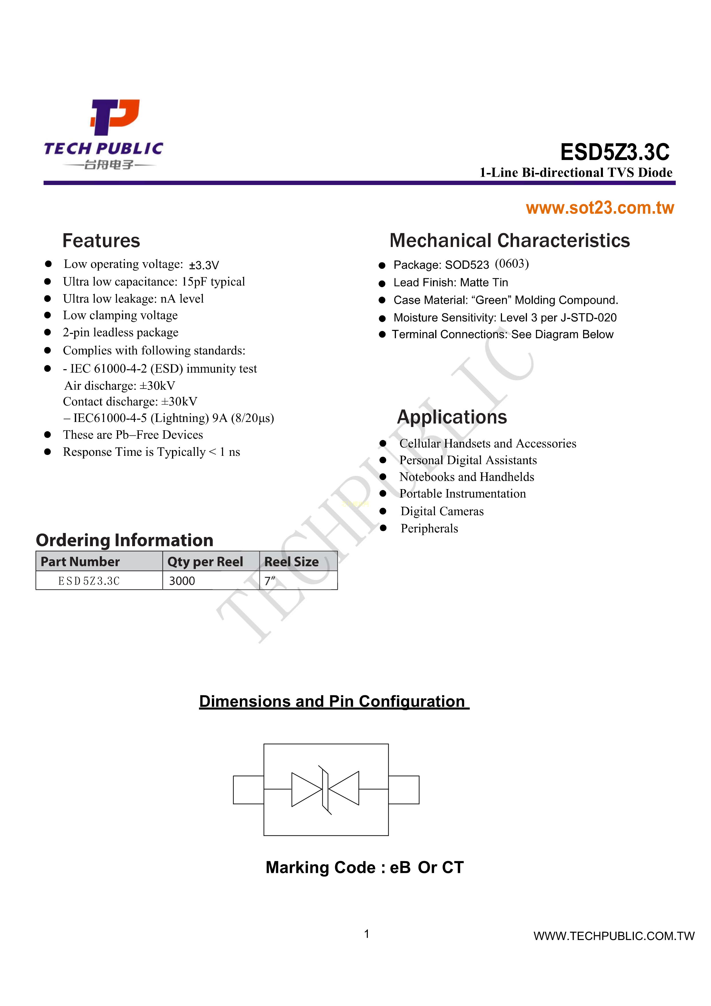ESD5Z3.3C数据手册SOD-523封装TECH PUBLIC(台舟)PDF规格书,中英文下载