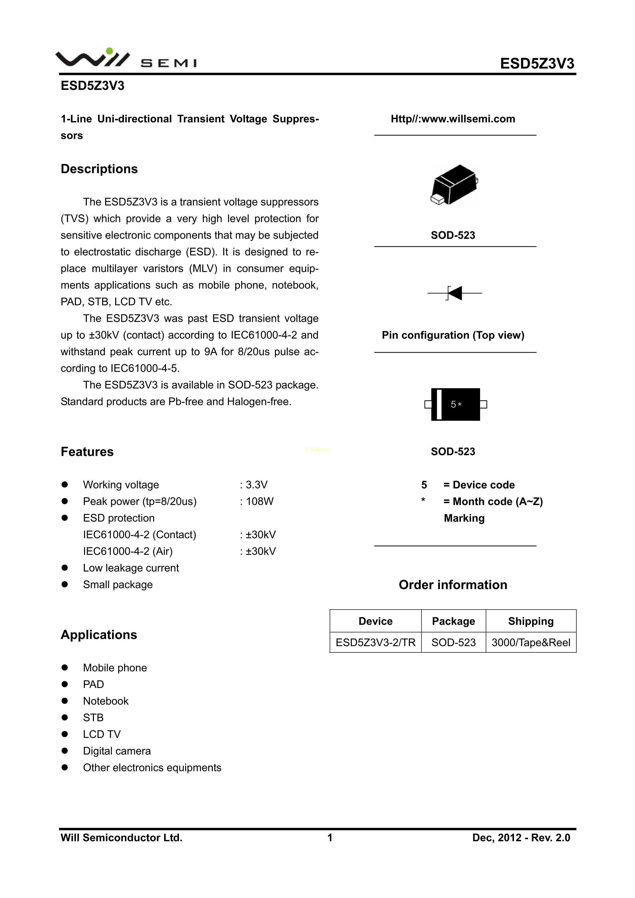 ESD5Z3V3-2-TR数据手册SOD-523封装WILLSEMI(韦尔)PDF规格书,中英文下载
