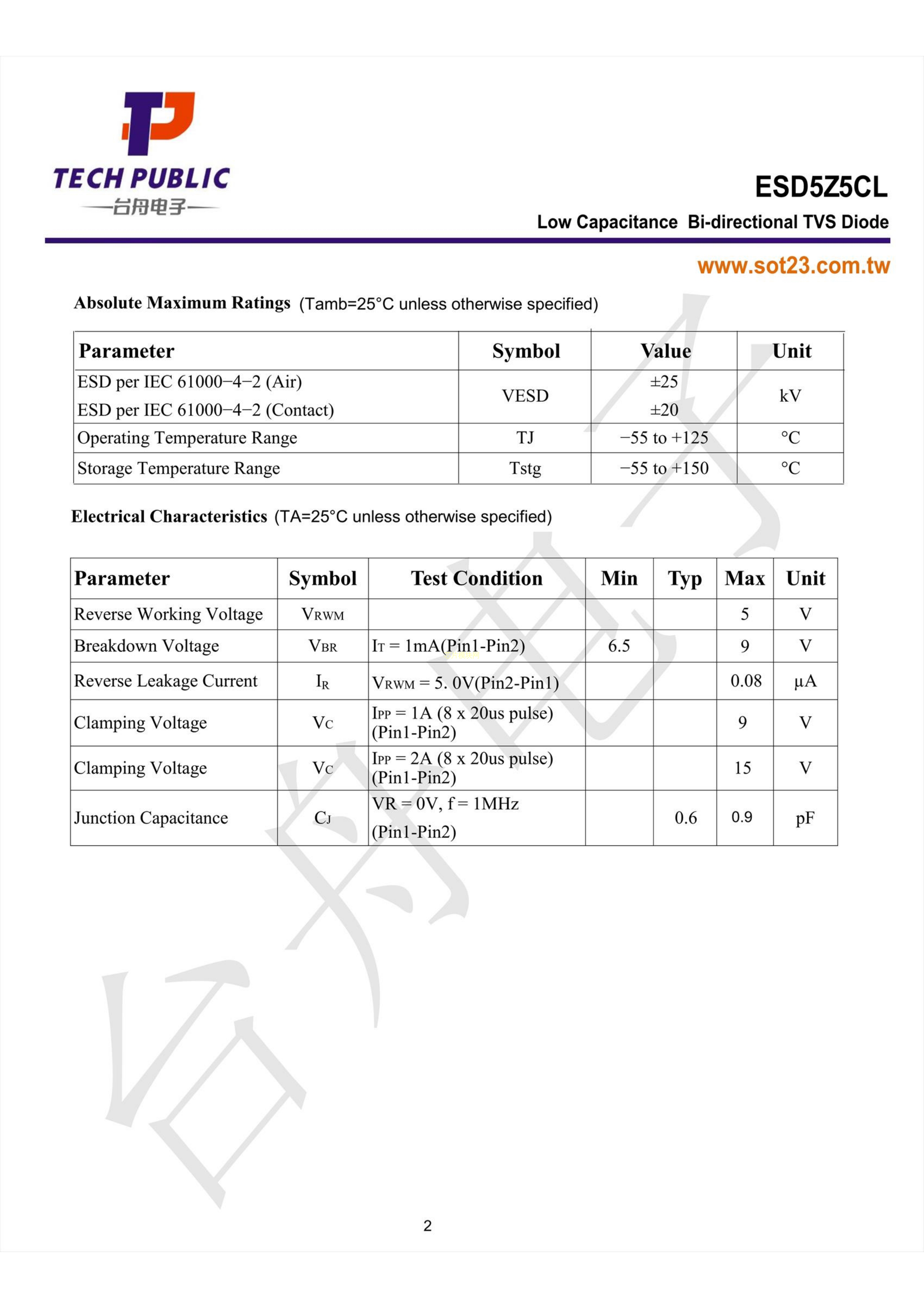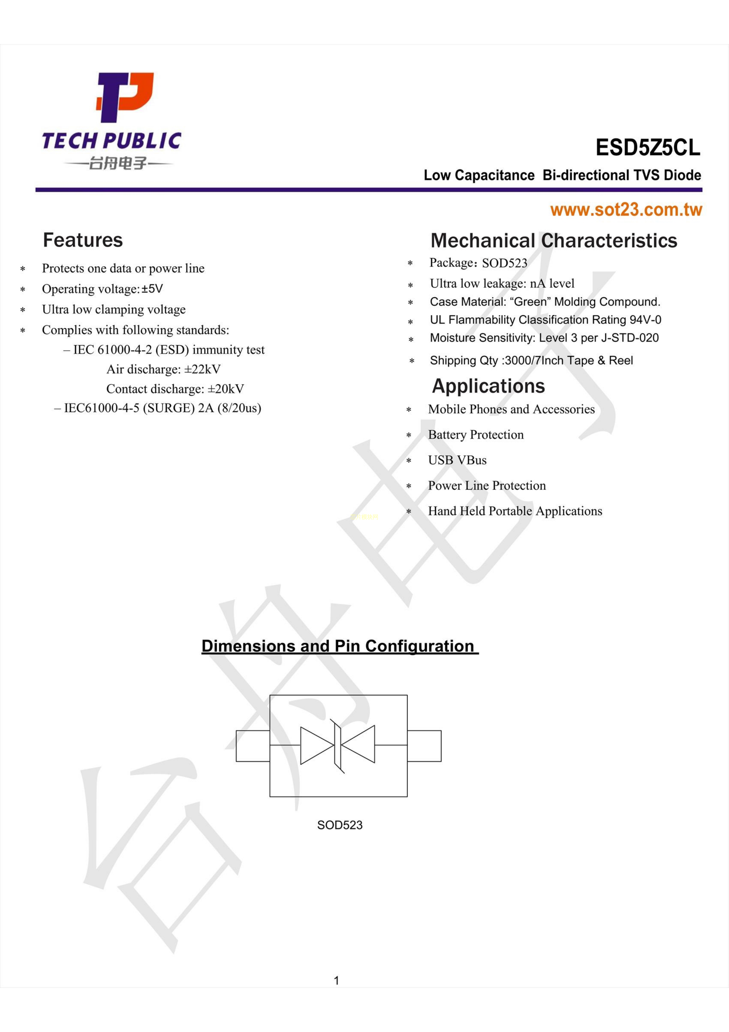 ESD5Z5CL数据手册SOD-523封装TECH PUBLIC(台舟)PDF规格书,中英文下载