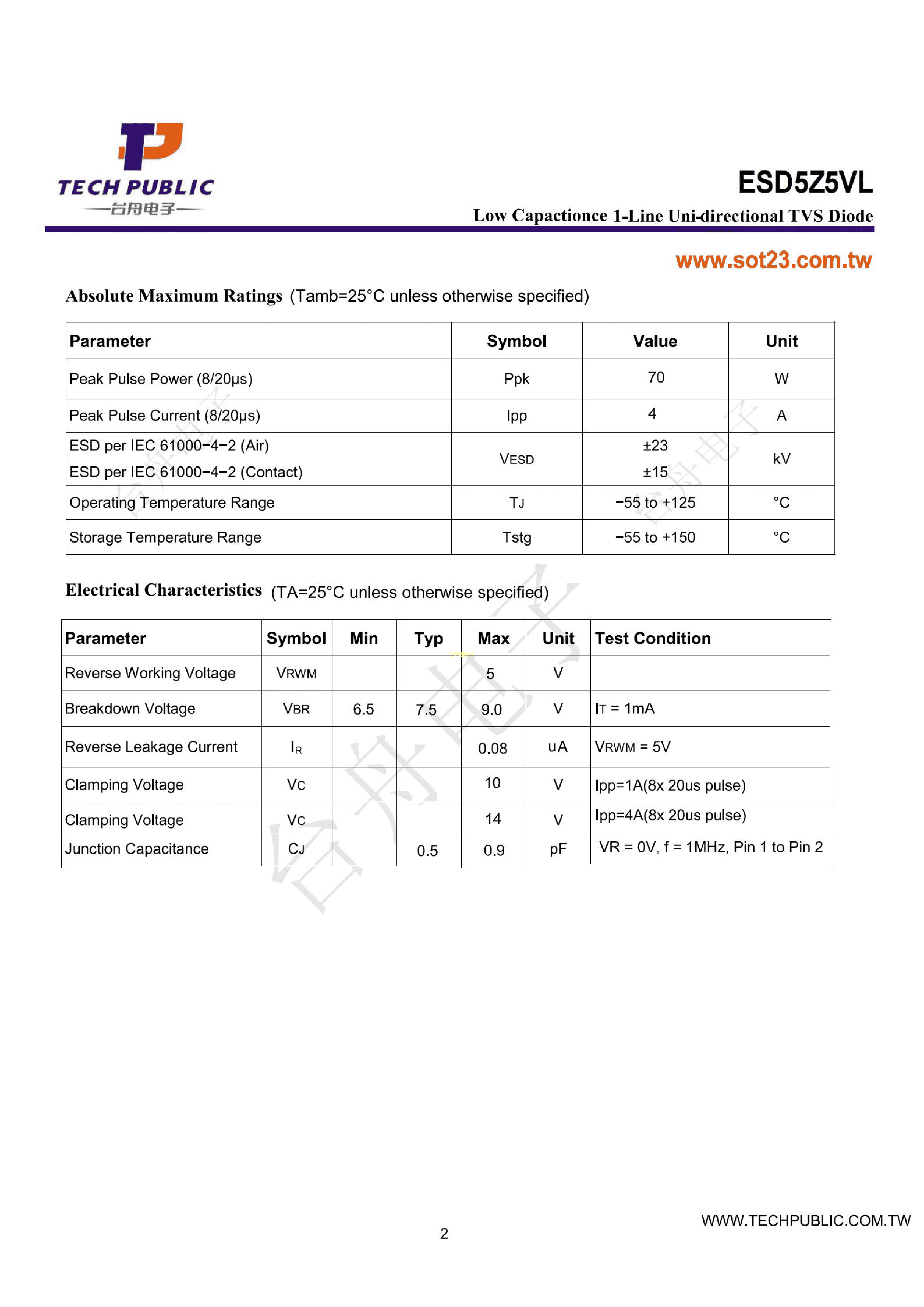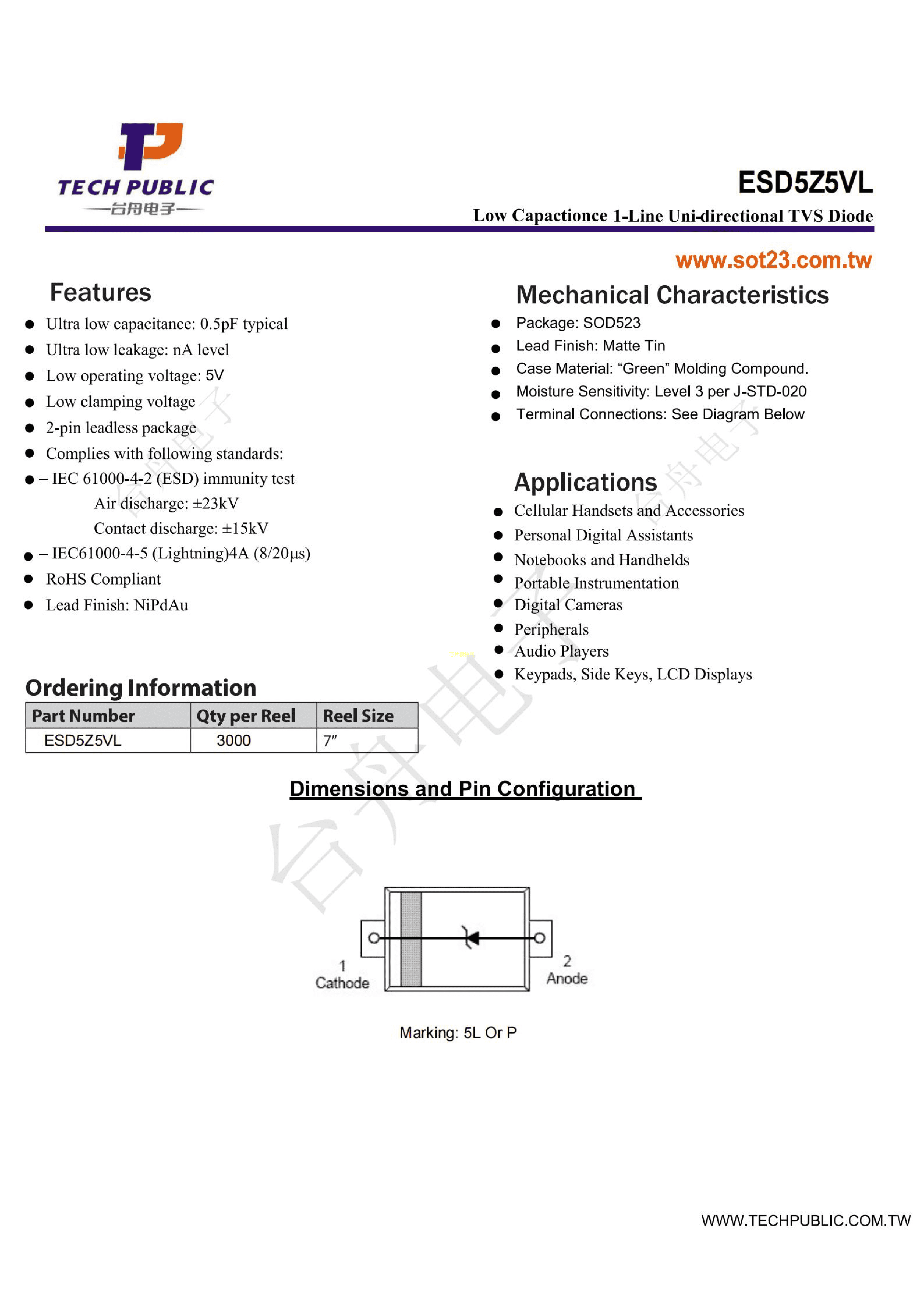 ESD5Z5VL数据手册SOD-523封装TECHPUBLIC(台舟)PDF规格书,中英文下载