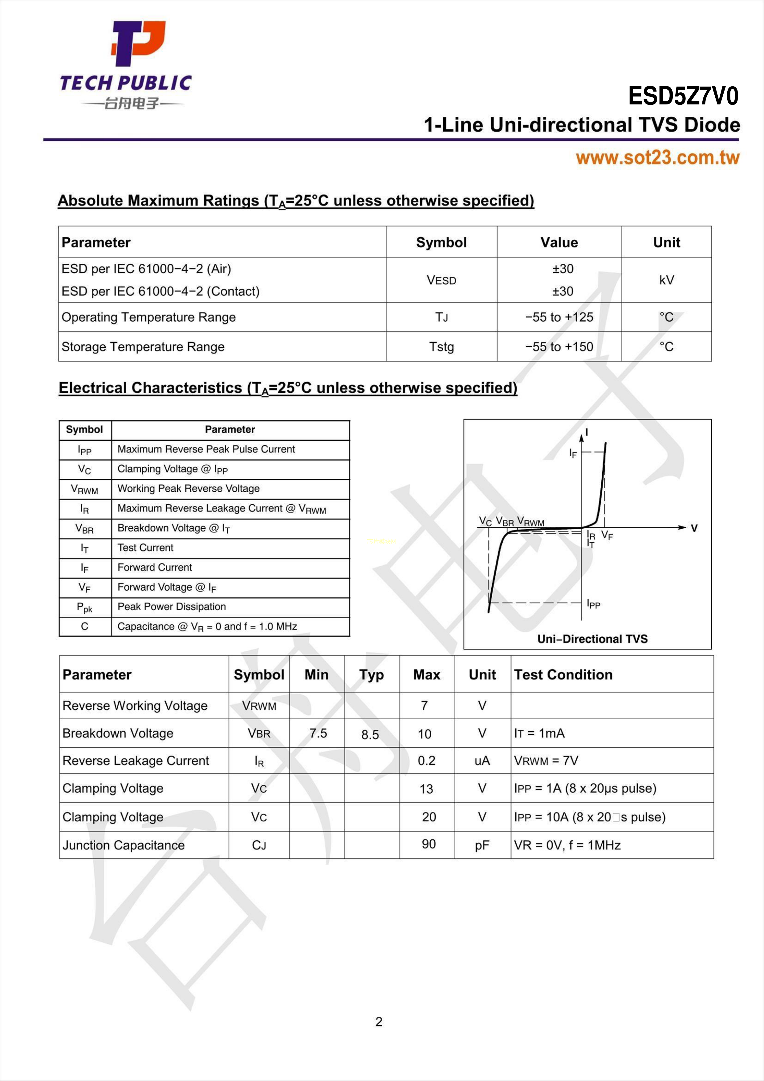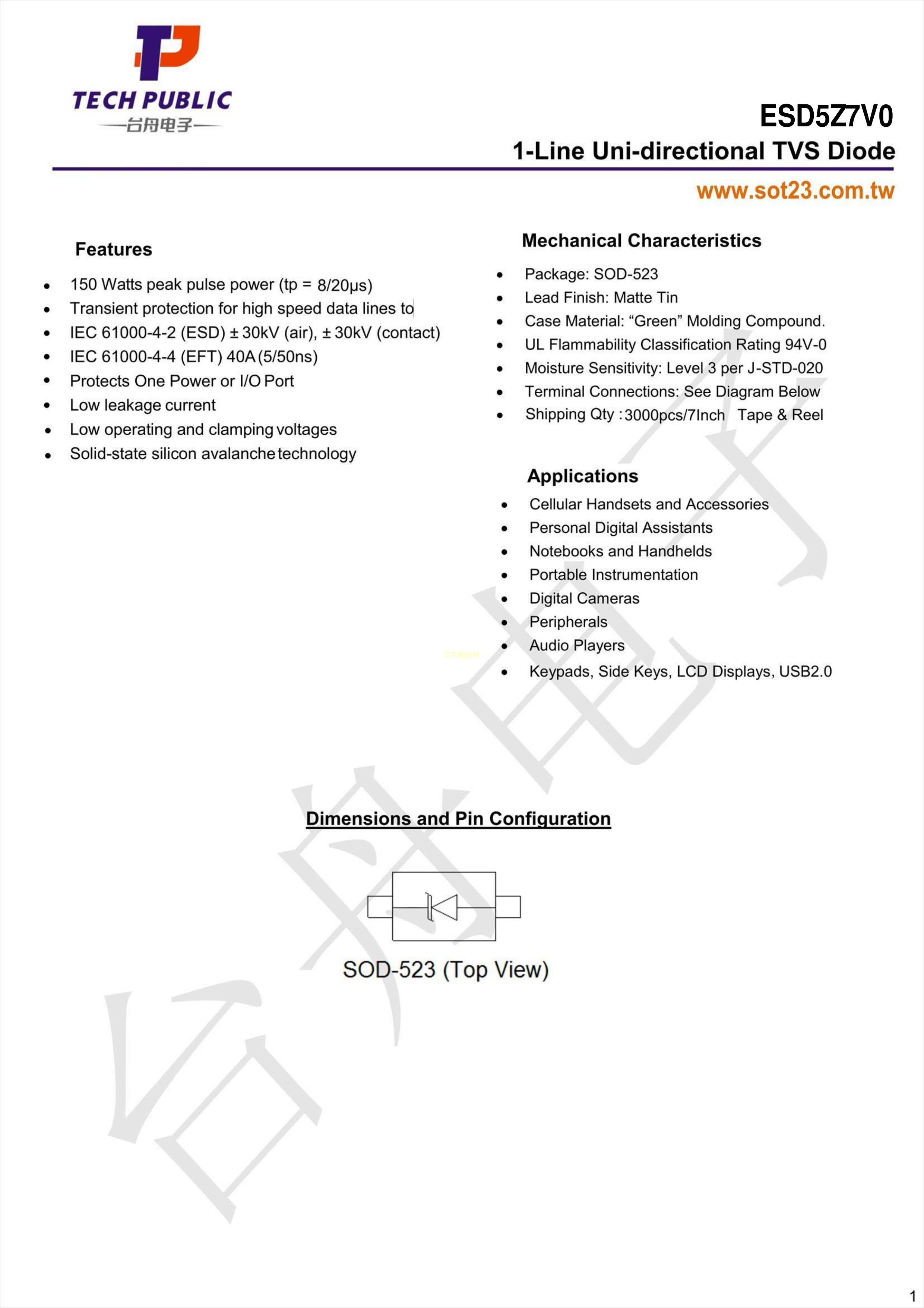 ESD5Z7V0数据手册SOD-523封装TECH PUBLIC(台舟)PDF规格书,中英文下载