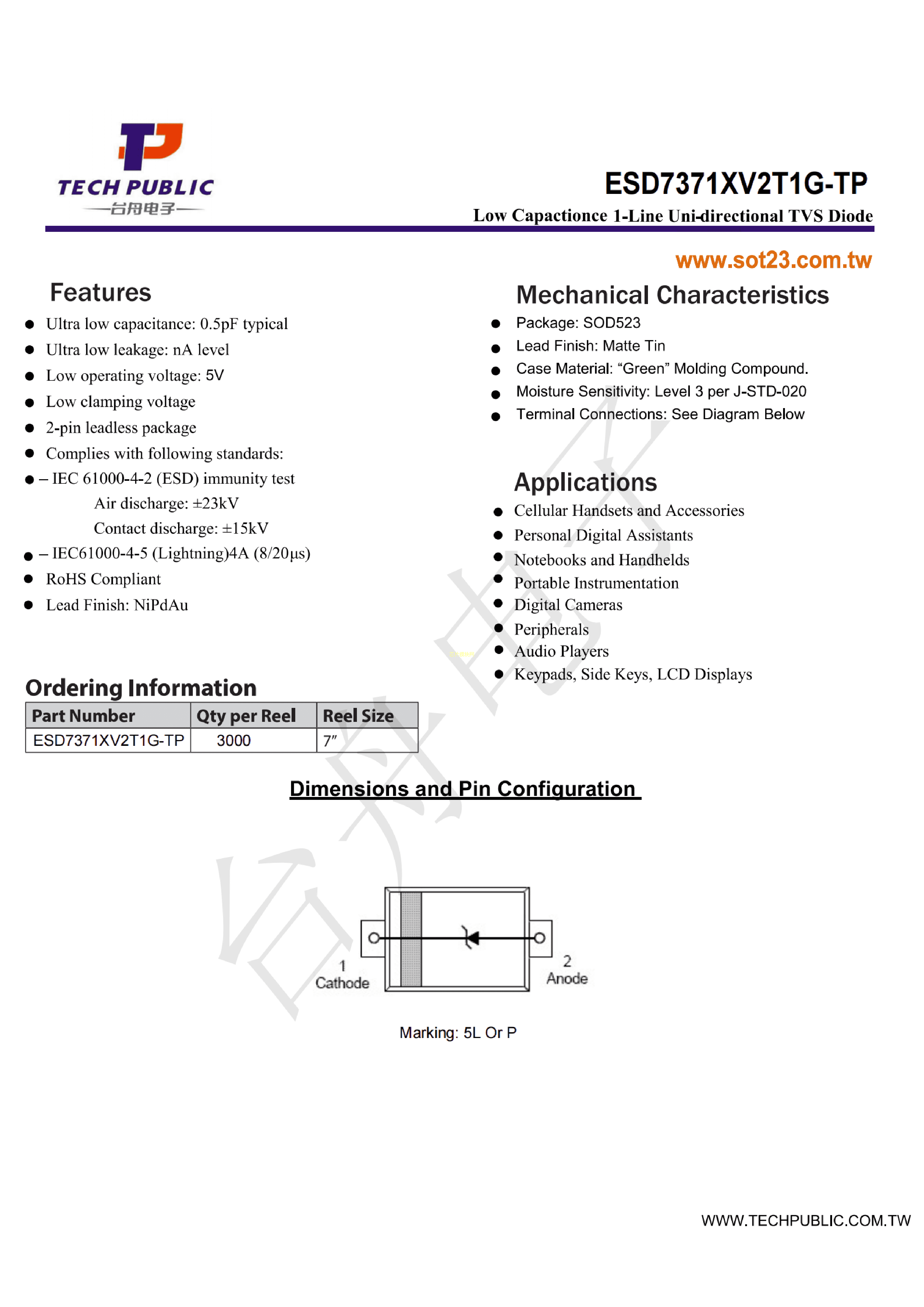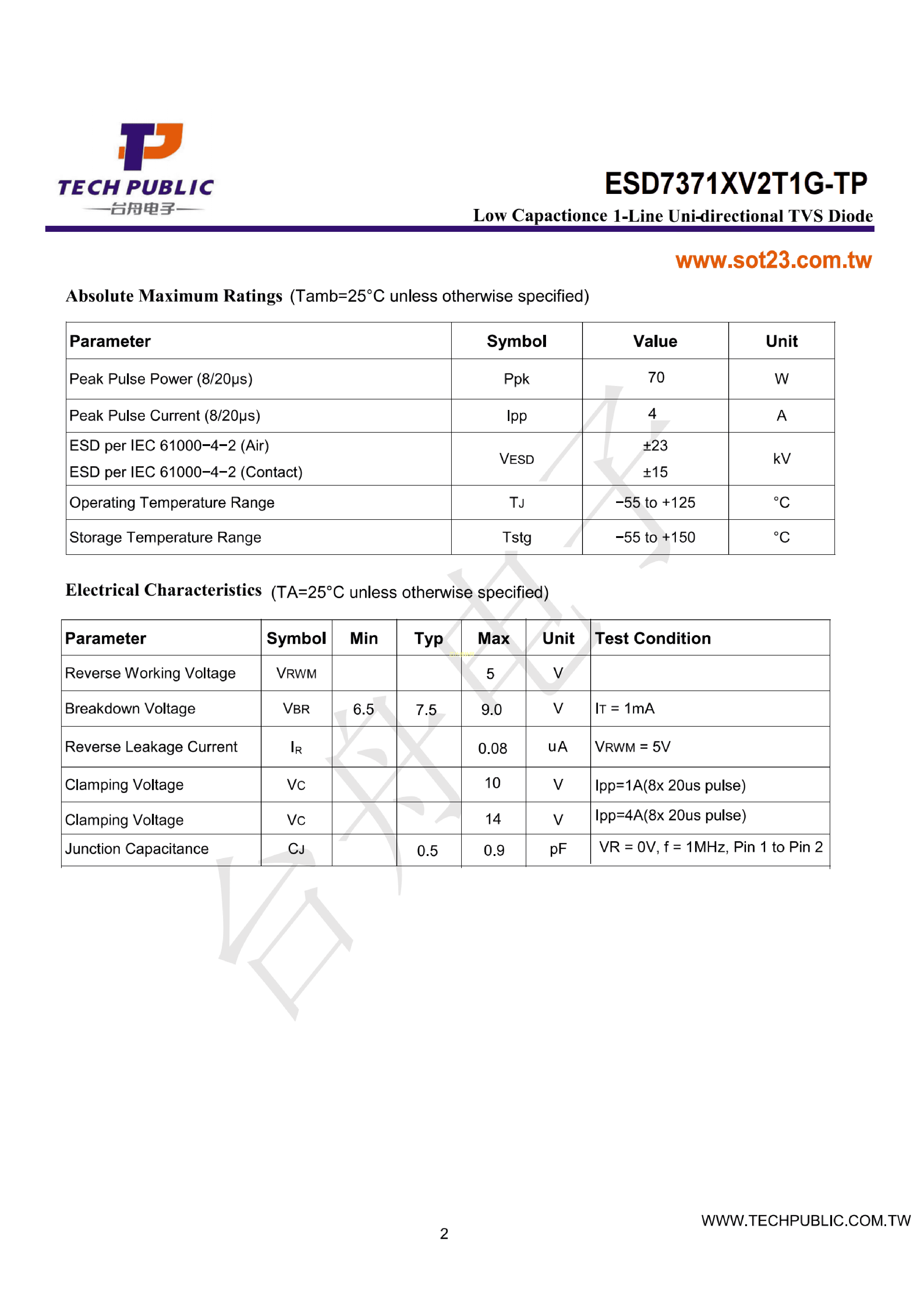 ESD7371XV2T1G-TP数据手册SOD-523封装TECHPUBLIC(台舟)PDF规格书,中英文下载