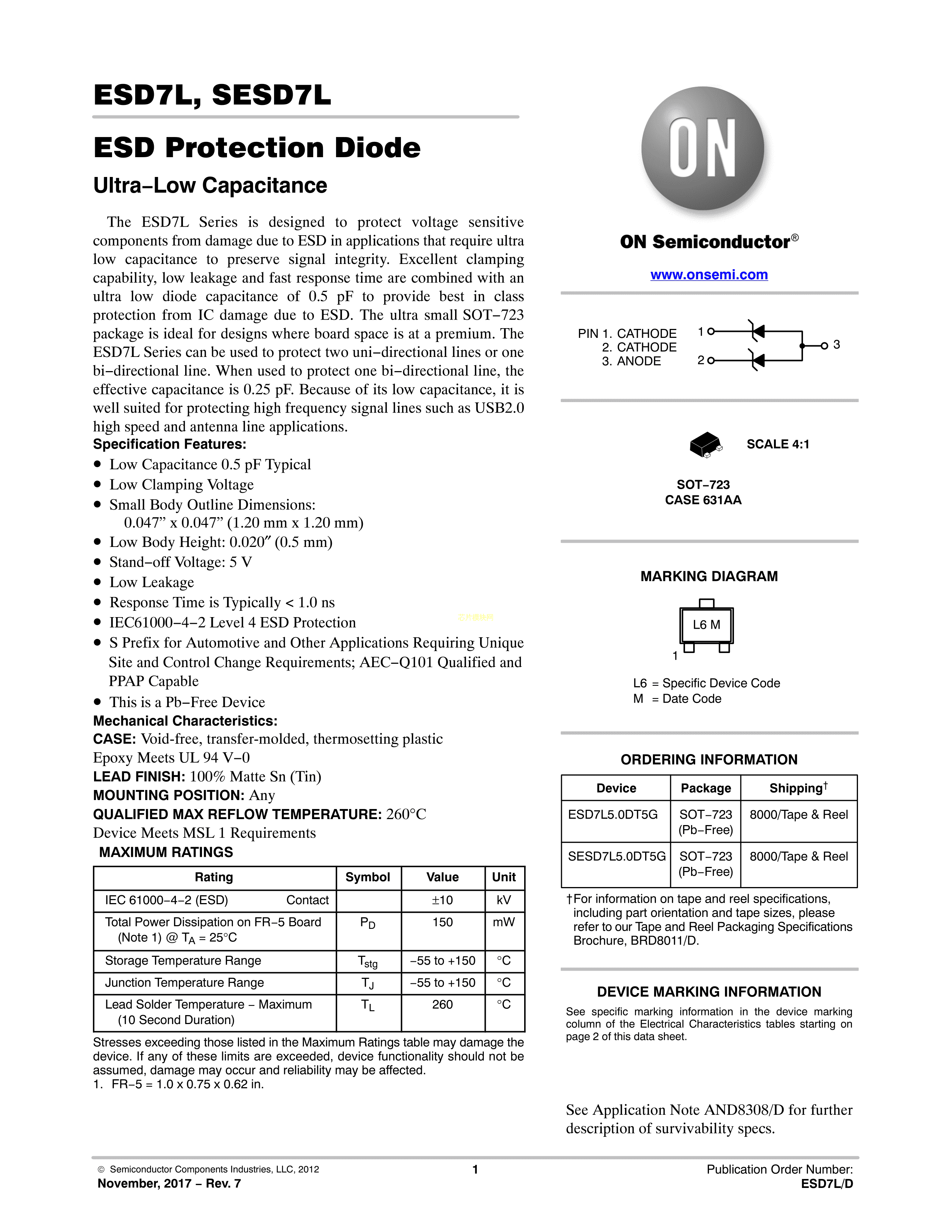 ESD7L5.0DT5G数据手册SOT-723封装onsemi(安森美)PDF规格书,中英文下载