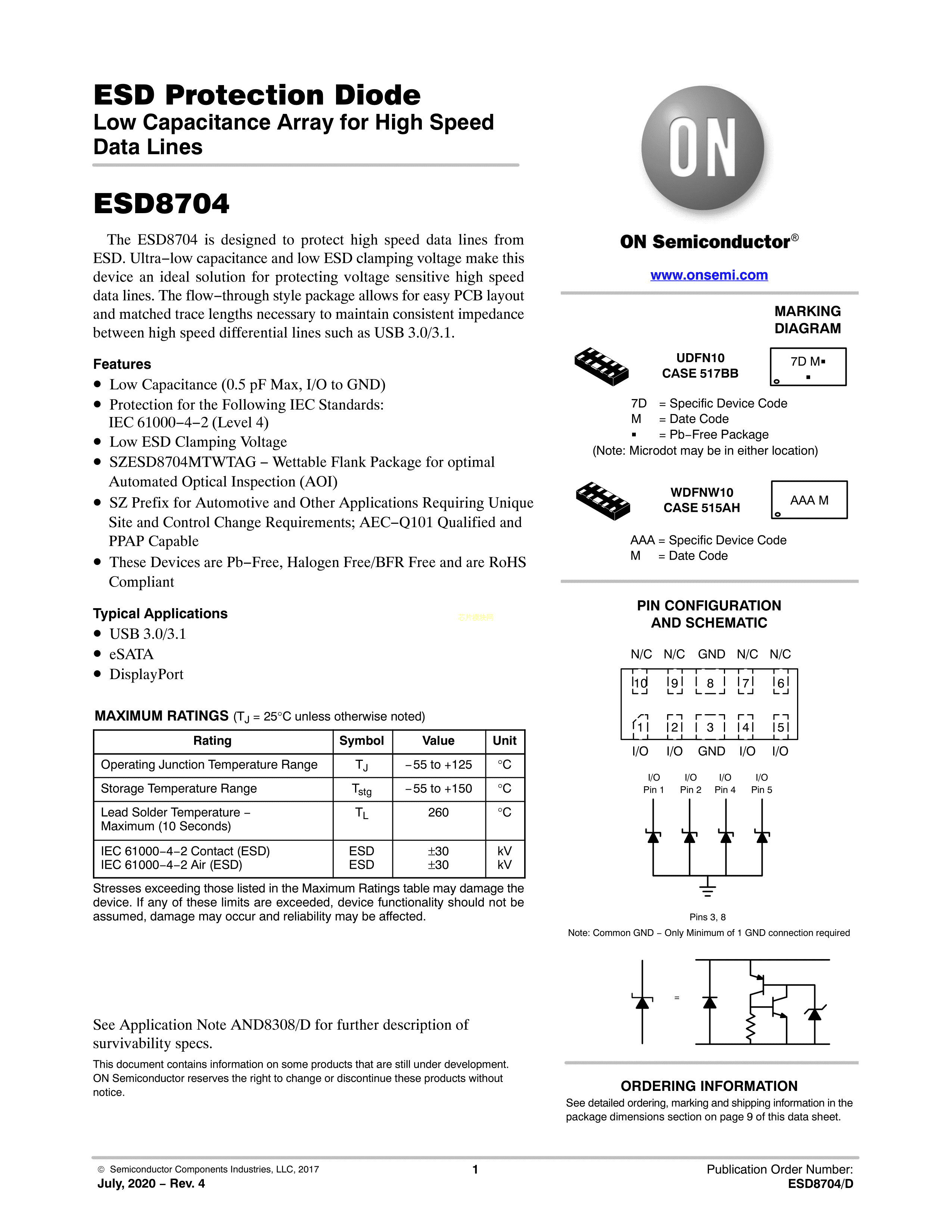 ESD8704MUTAG数据手册UDFN-10封装onsemi(安森美)PDF规格书,中英文下载