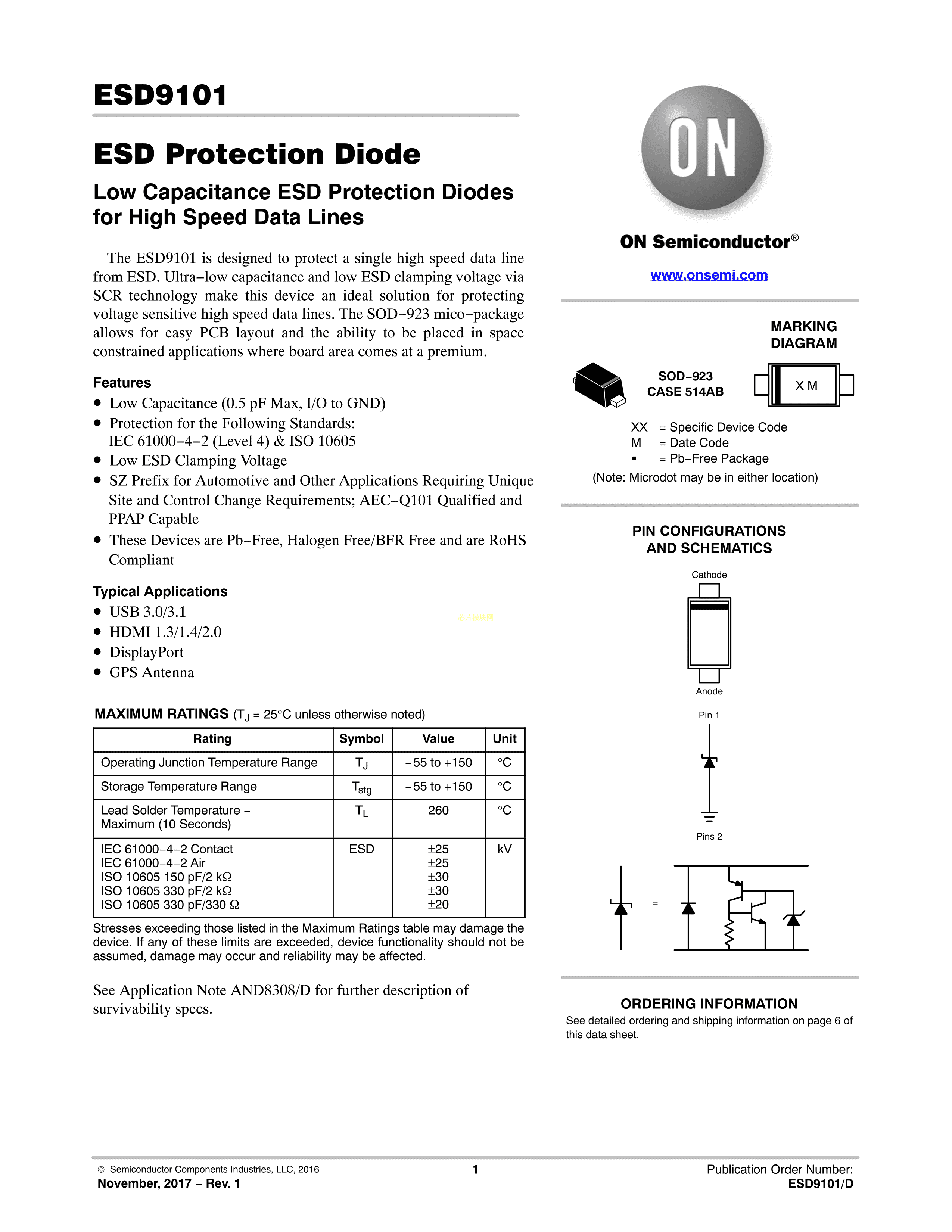 ESD9101P2T5G数据手册SOD-923-2封装onsemi(安森美)PDF规格书,中英文下载