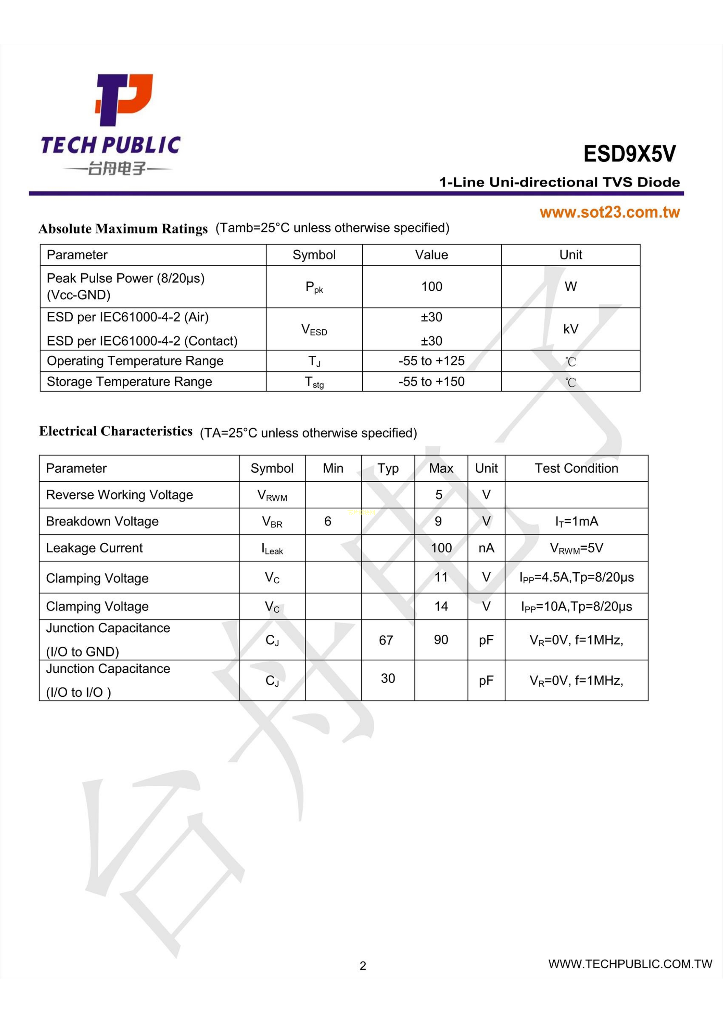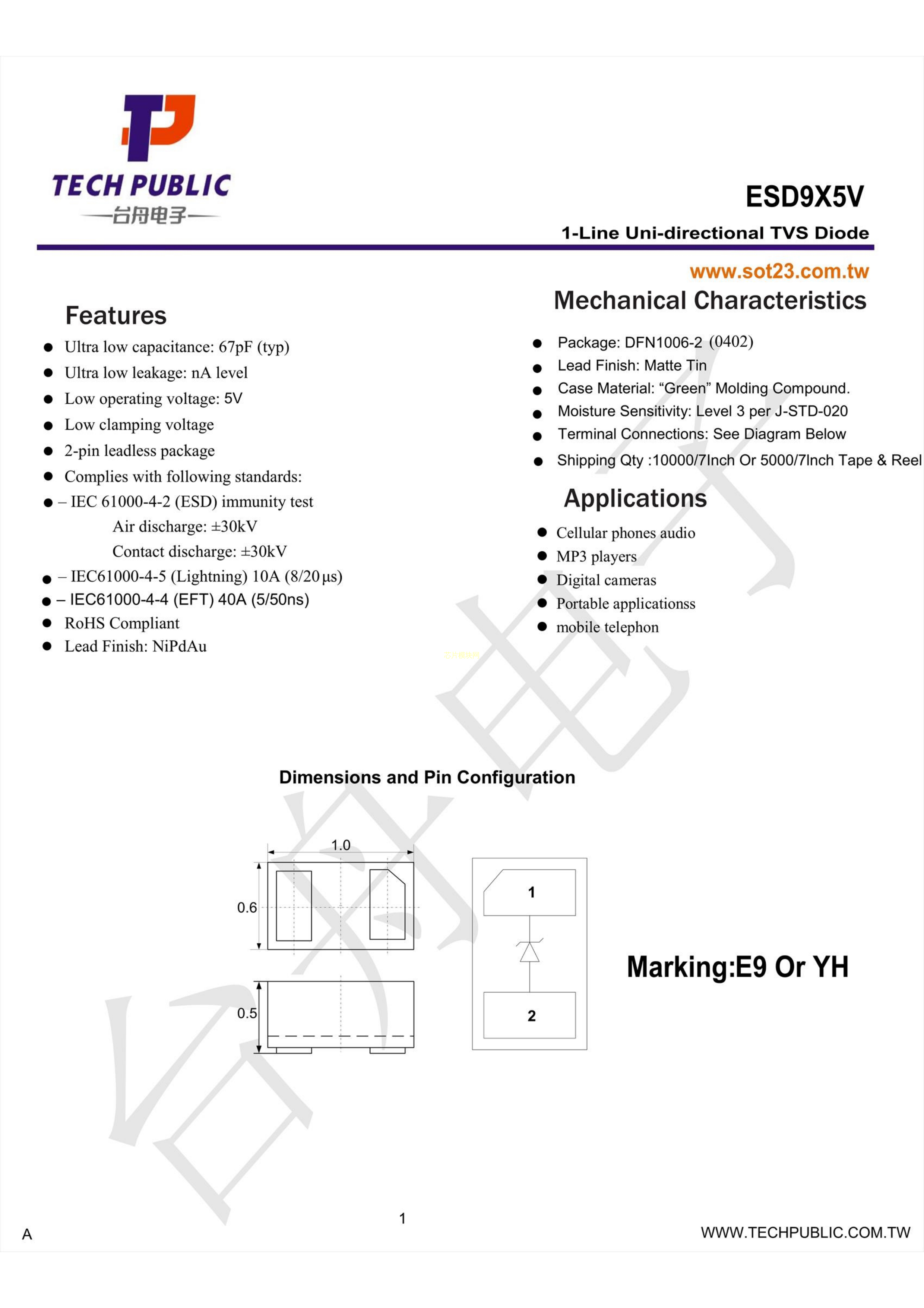 ESD9X5V数据手册DFN1006-2封装TECHPUBLIC(台舟)PDF规格书,中英文下载