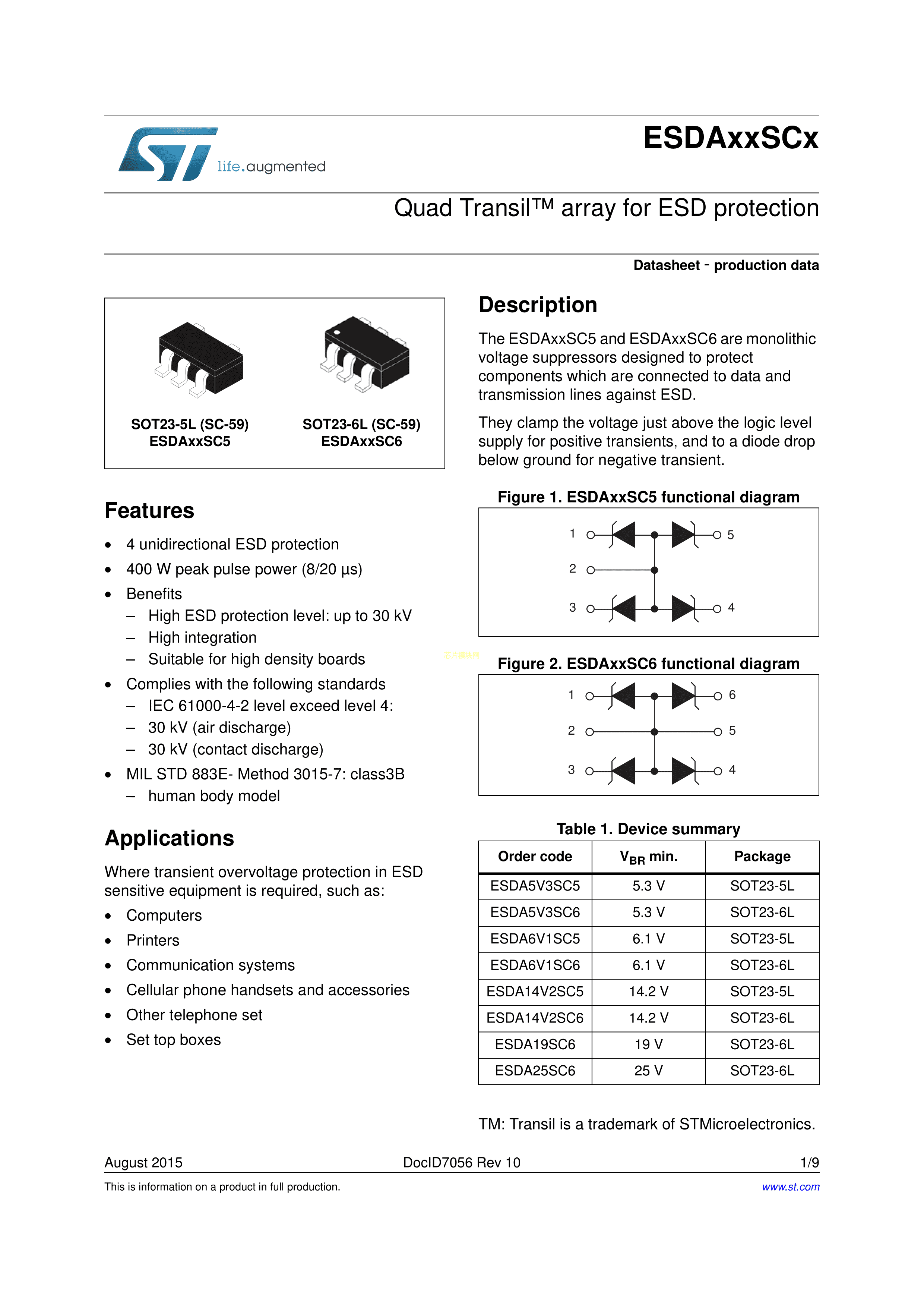 ESDA6V1SC5数据手册SOT-23-5封装ST(意法半导体)PDF规格书,中英文下载