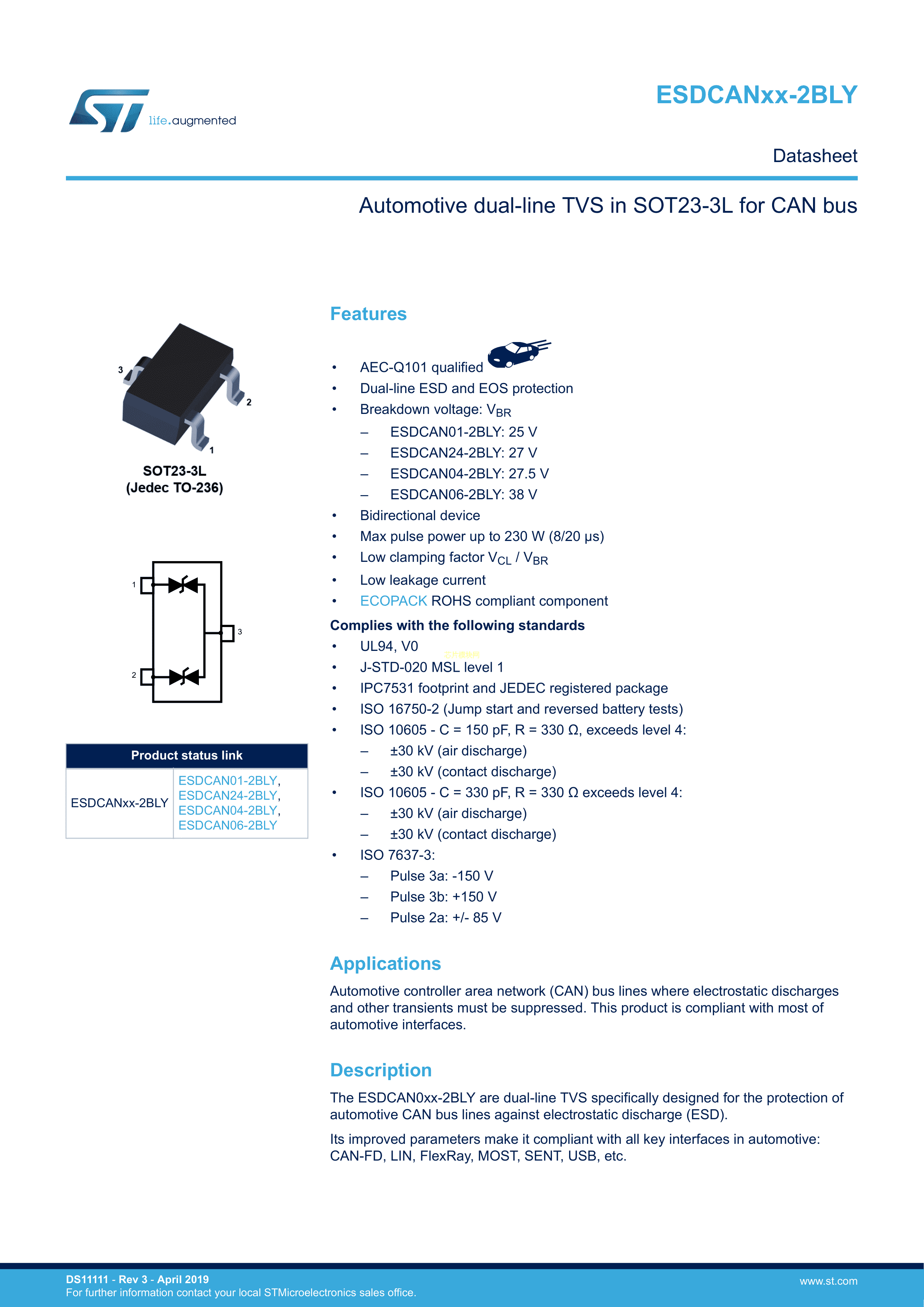 ESDCAN01-2BLY数据手册SOT-23-3封装ST(意法半导体)PDF规格书,中英文下载