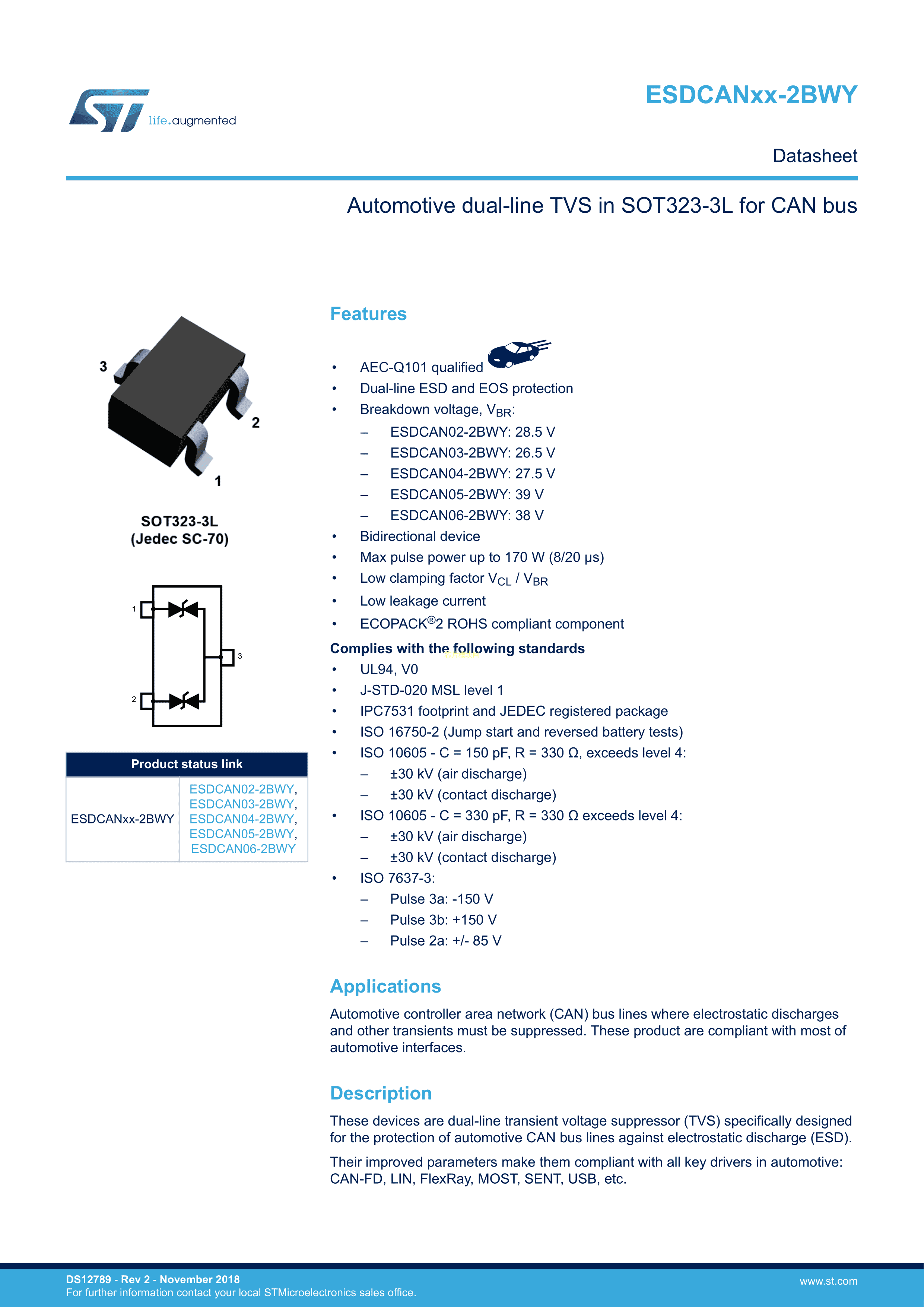 ESDCAN04-2BWY数据手册SOT-323-3封装ST(意法半导体)PDF规格书,中英文下载