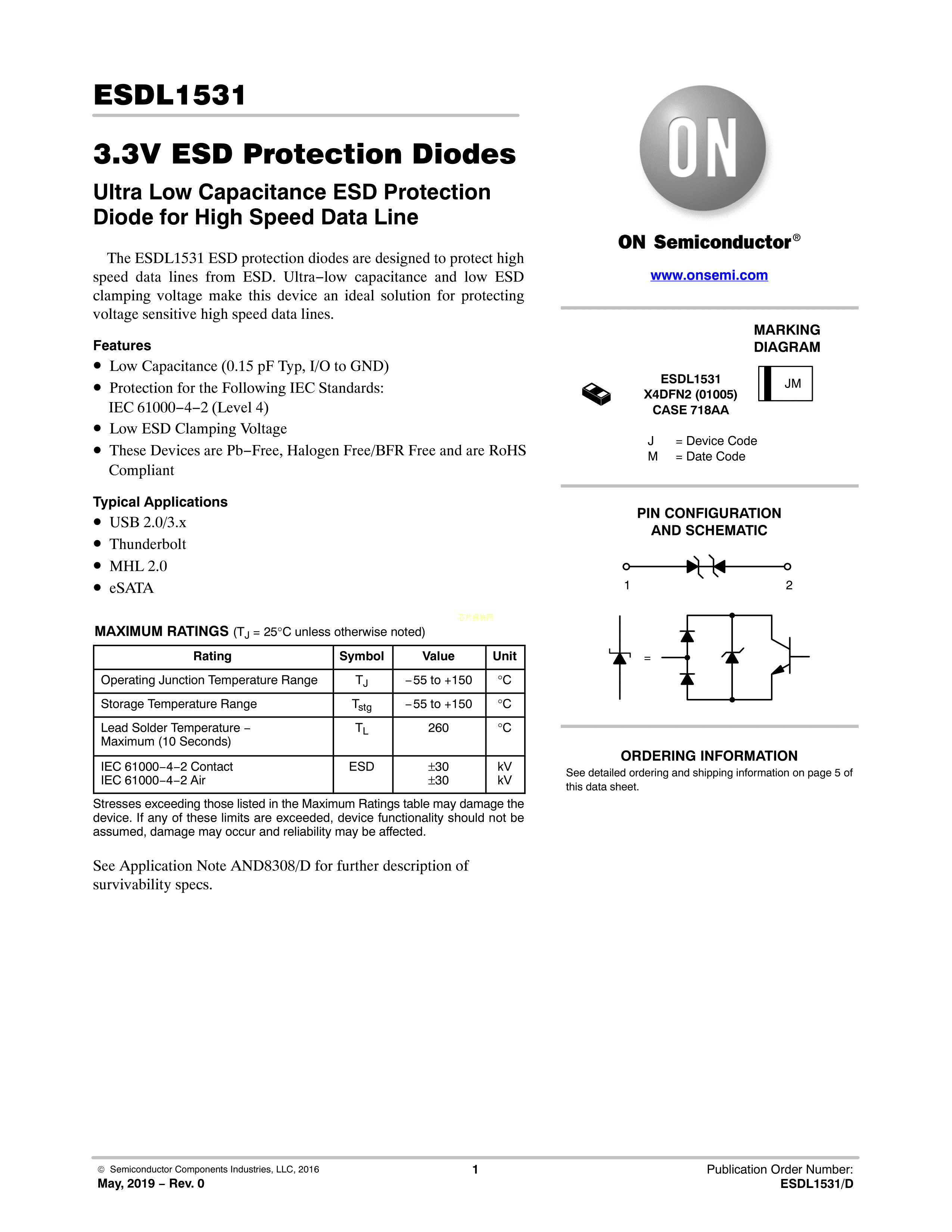 ESDL1531MX4T5G数据手册X4DFN-2封装onsemi(安森美)PDF规格书,中英文下载