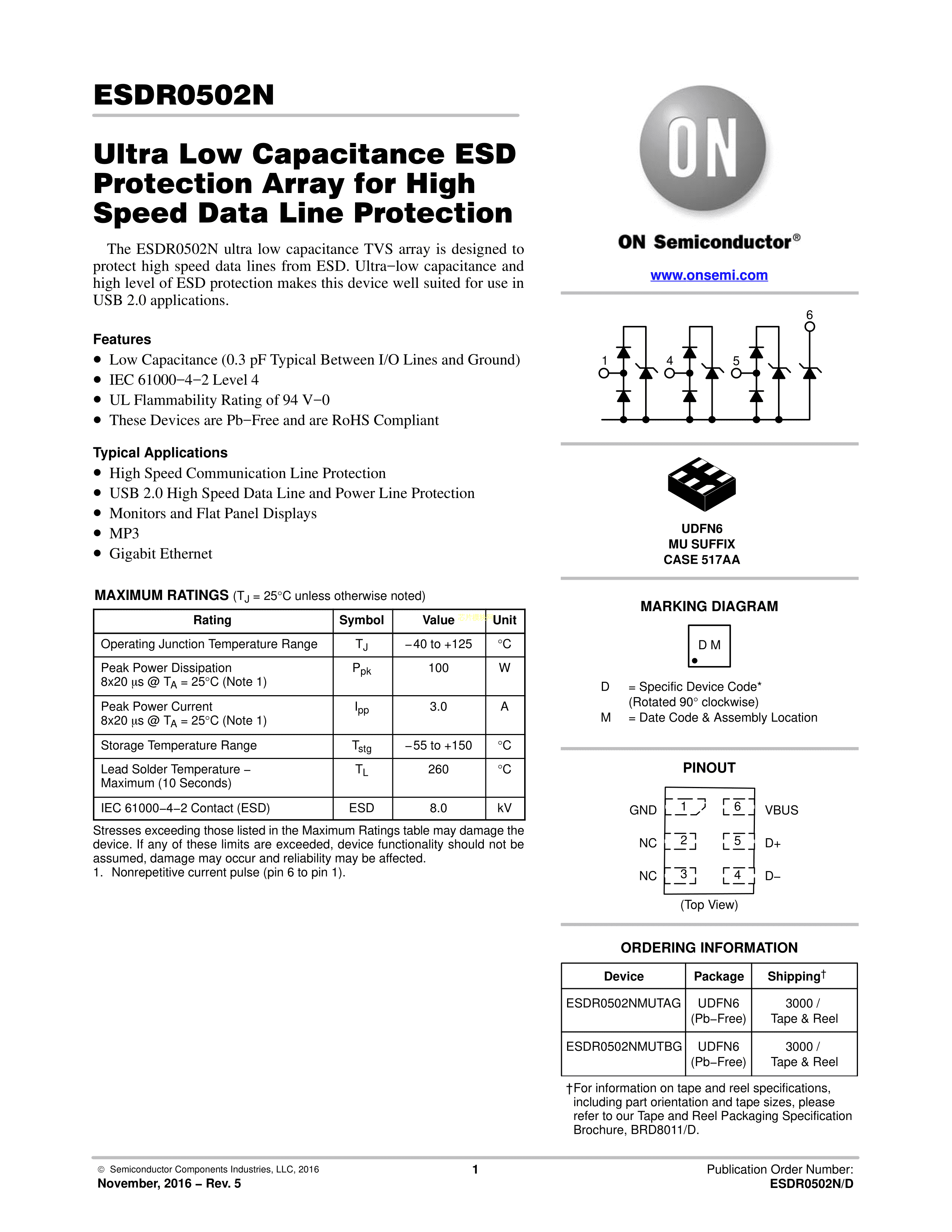 ESDR0502NMUTAG数据手册UDFN-6封装onsemi(安森美)PDF规格书,中英文下载