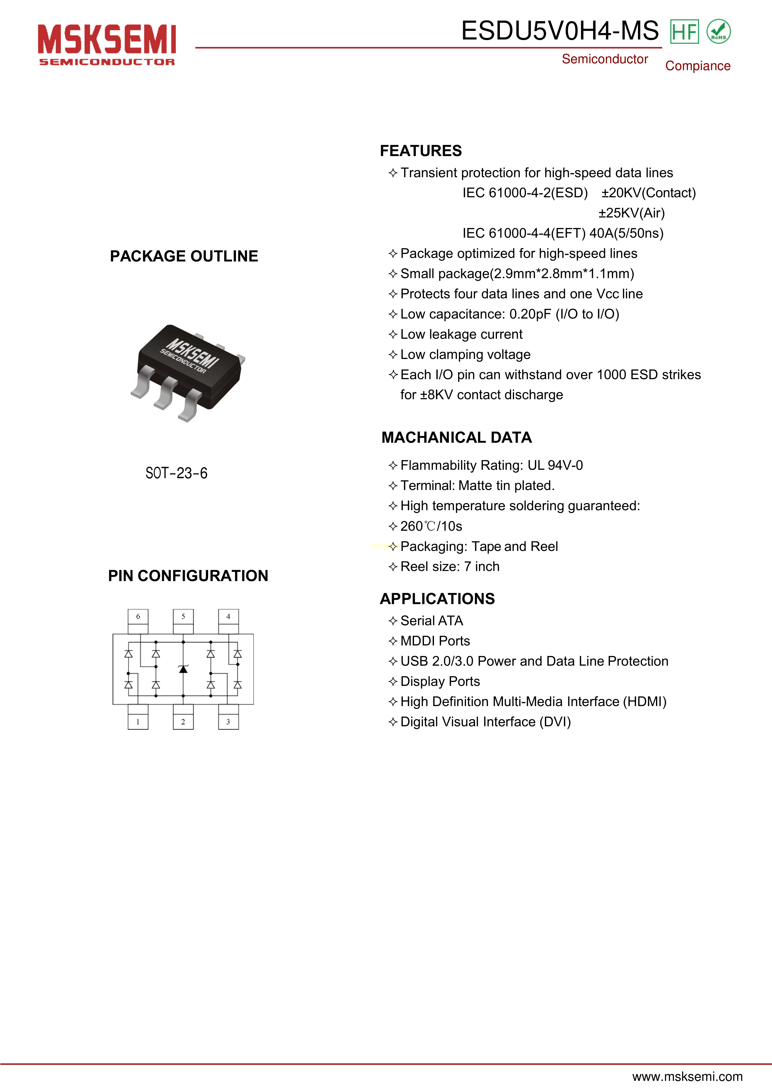 ESDU5V0H4-MS数据手册SOT-23-6封装MSKSEMI(美森科)PDF规格书,中英文下载