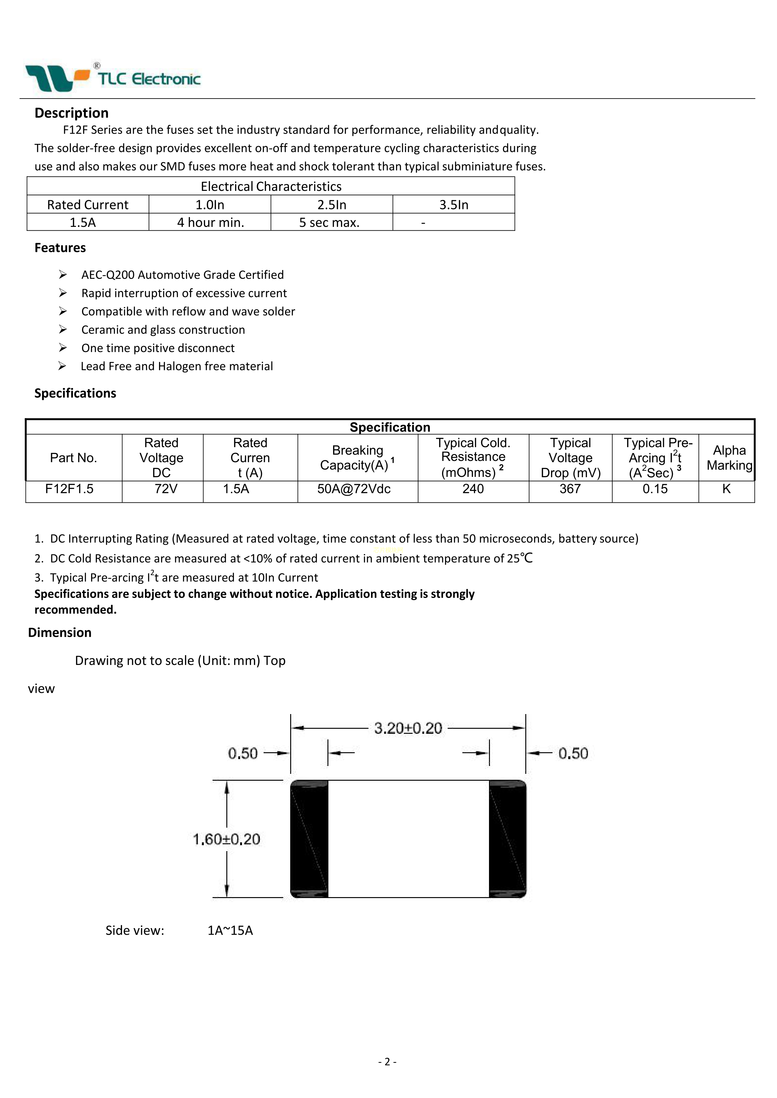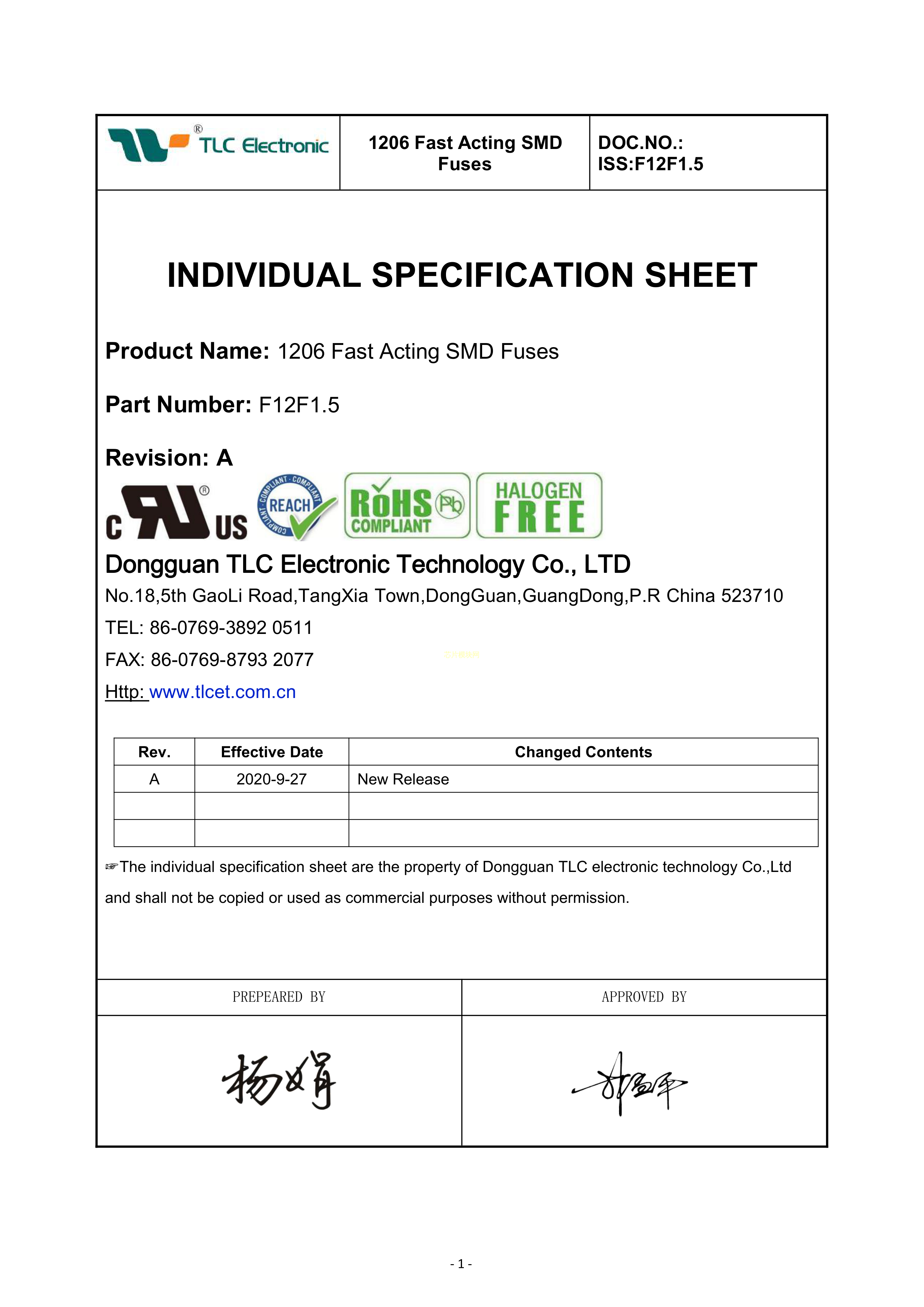 F12F1.5数据手册1206封装TLC(竞沃)PDF规格书,中英文下载