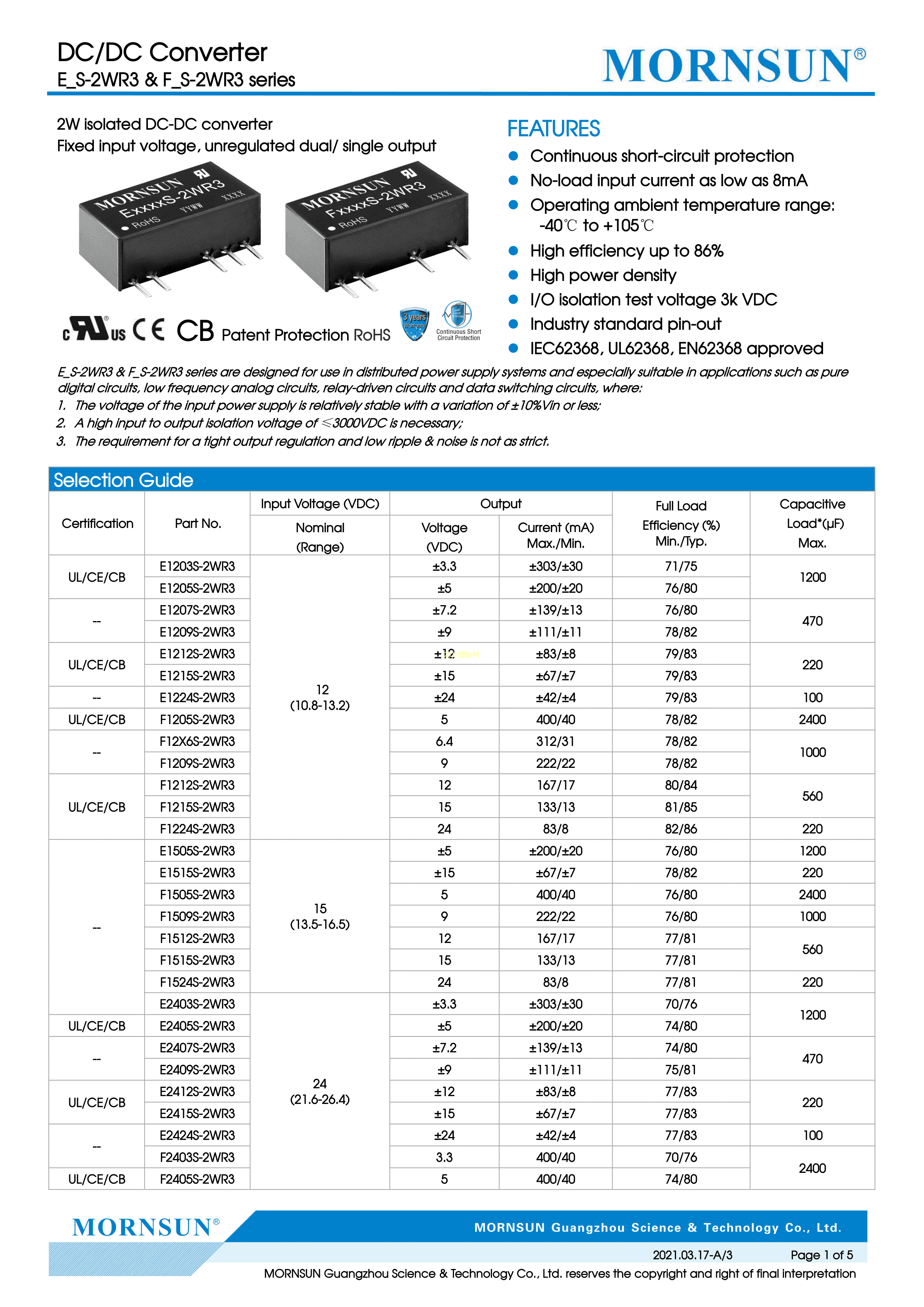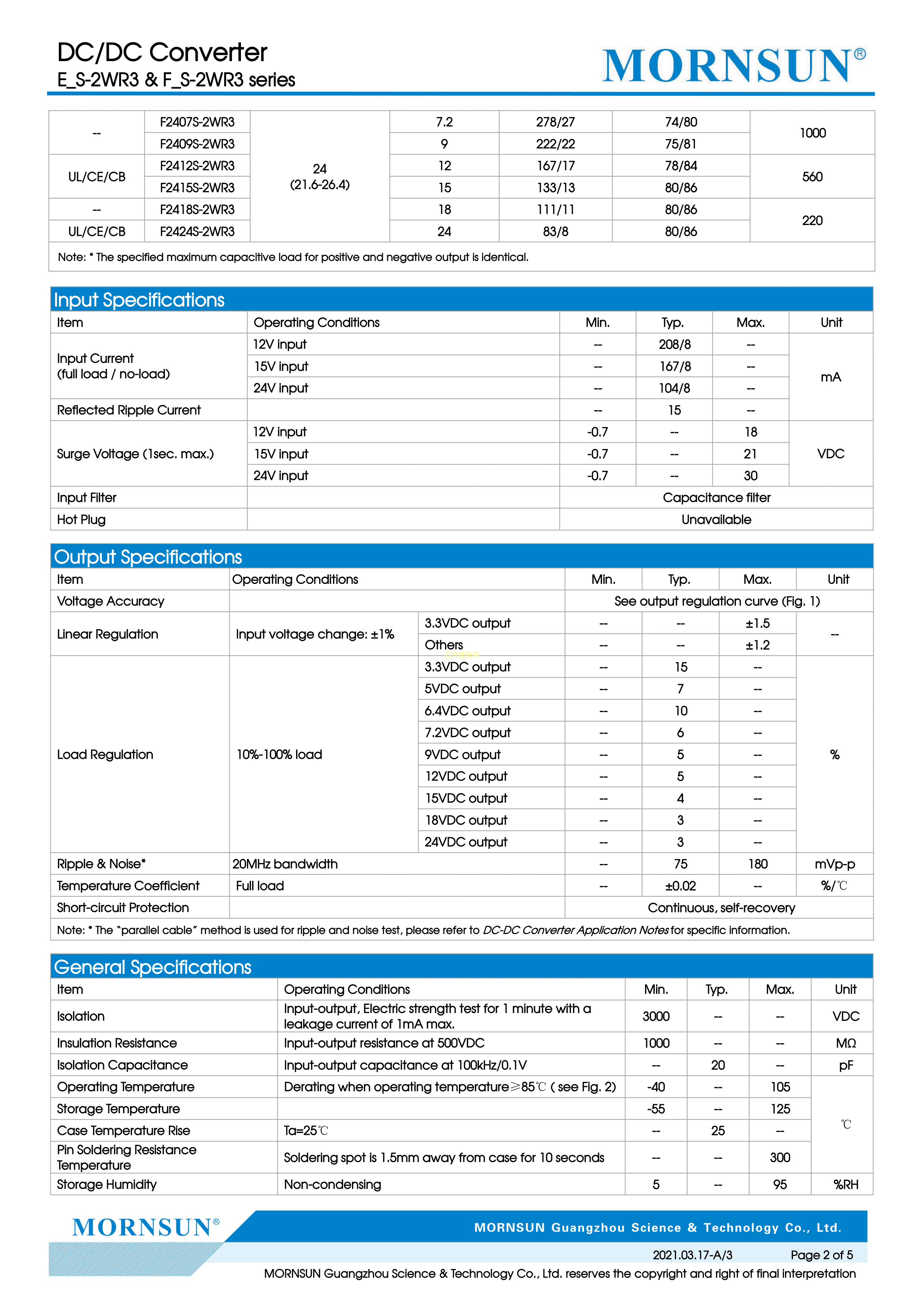 F2405S-2WR3数据手册插件封装MORNSUN(金升阳)PDF规格书,中英文下载