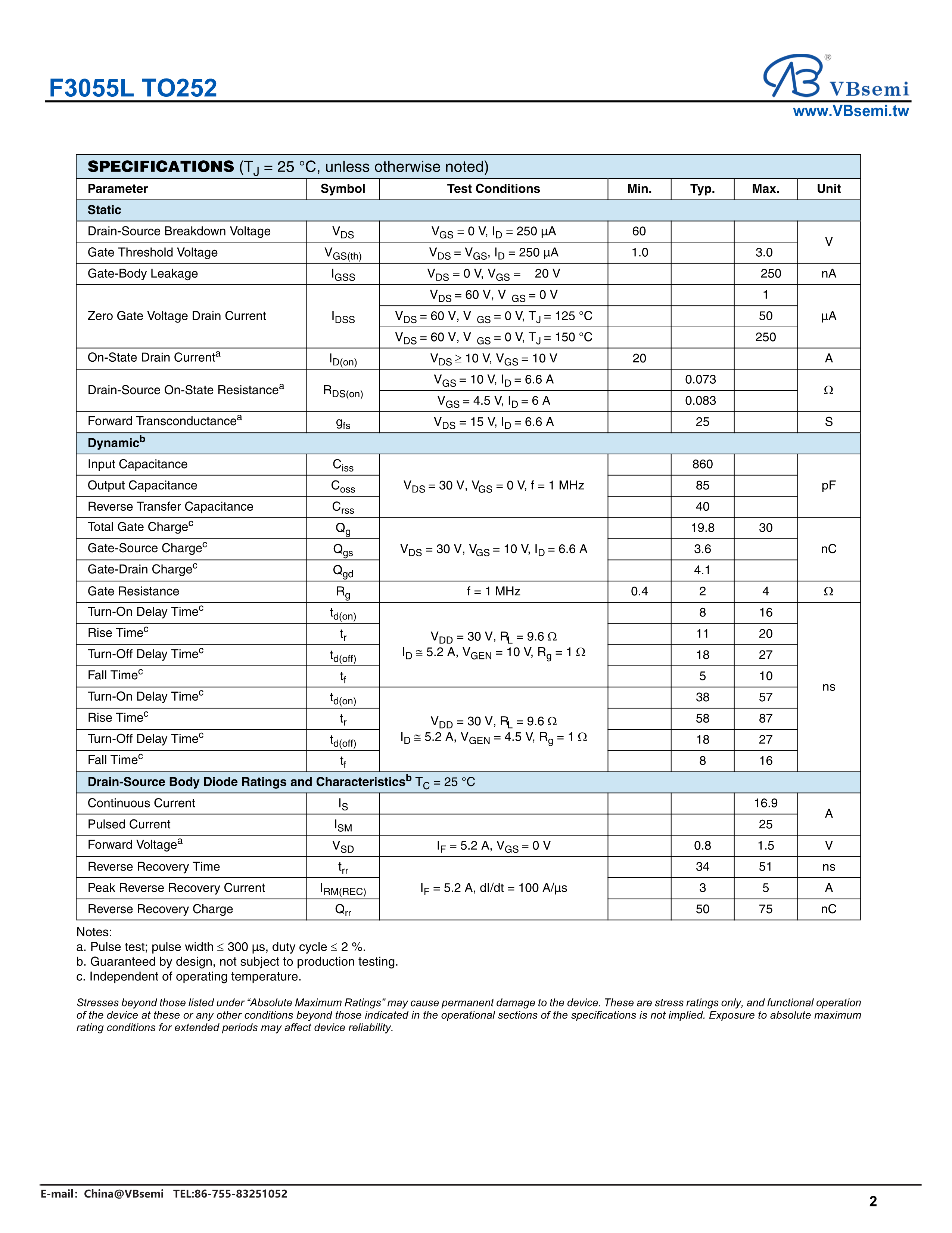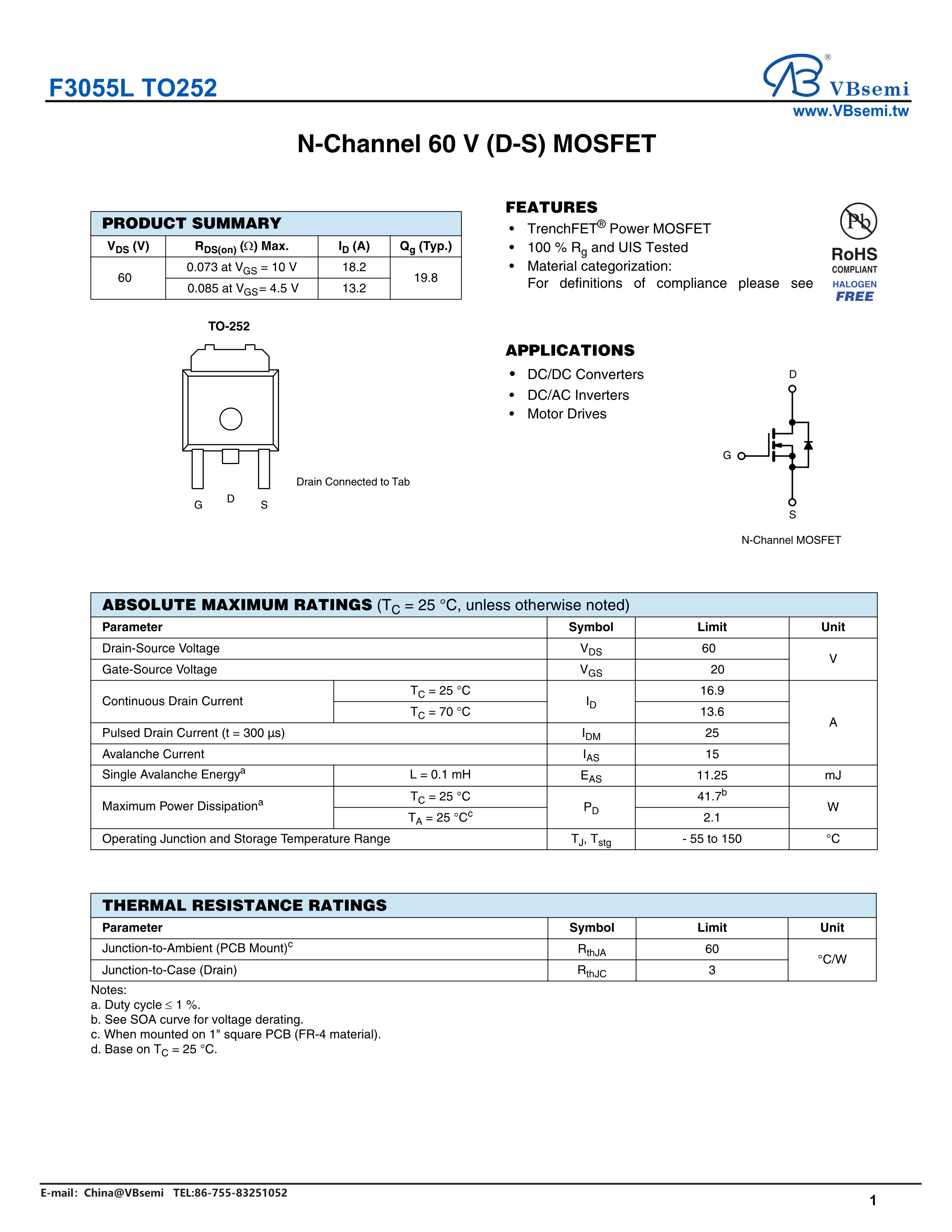F3055L TO252数据手册TO-252封装VBsemi(台湾微碧)PDF规格书,中英文下载