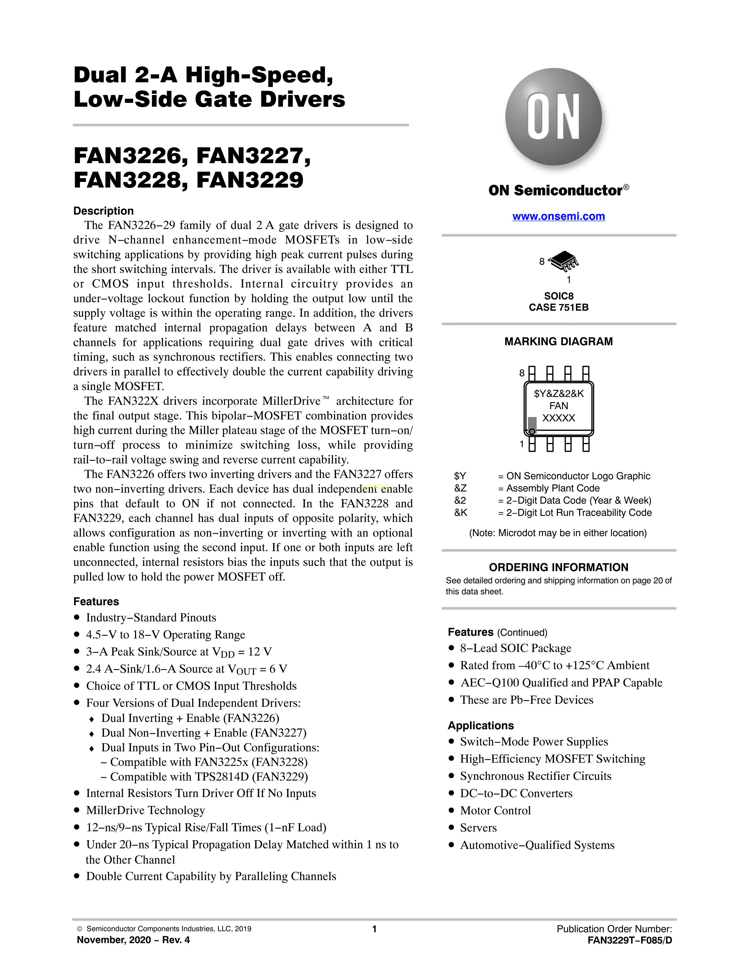 FAN3229CMX-F085数据手册SOIC-8封装onsemi(安森美)PDF规格书,中英文下载