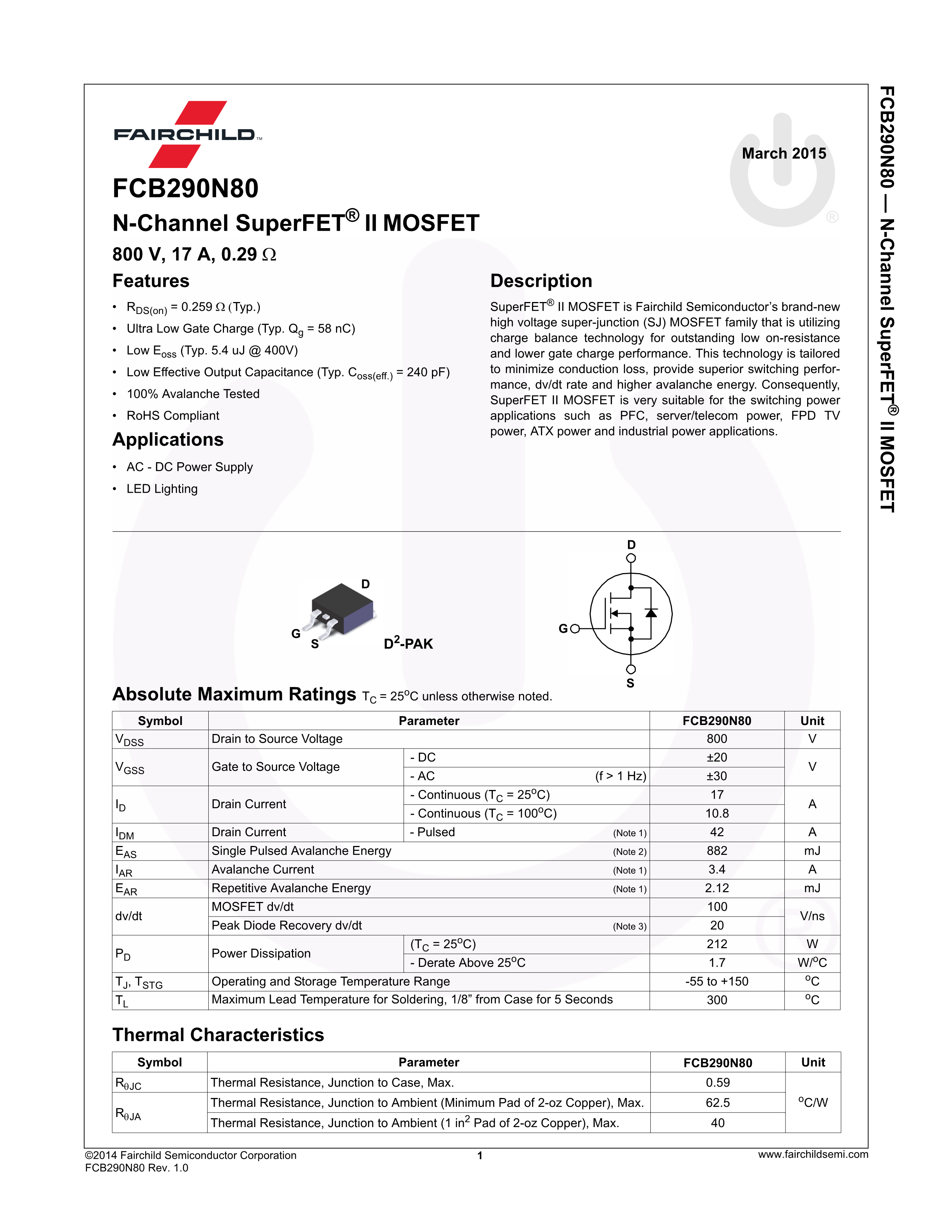 FCB290N80数据手册D2PAK封装onsemi(安森美)PDF规格书,中英文下载