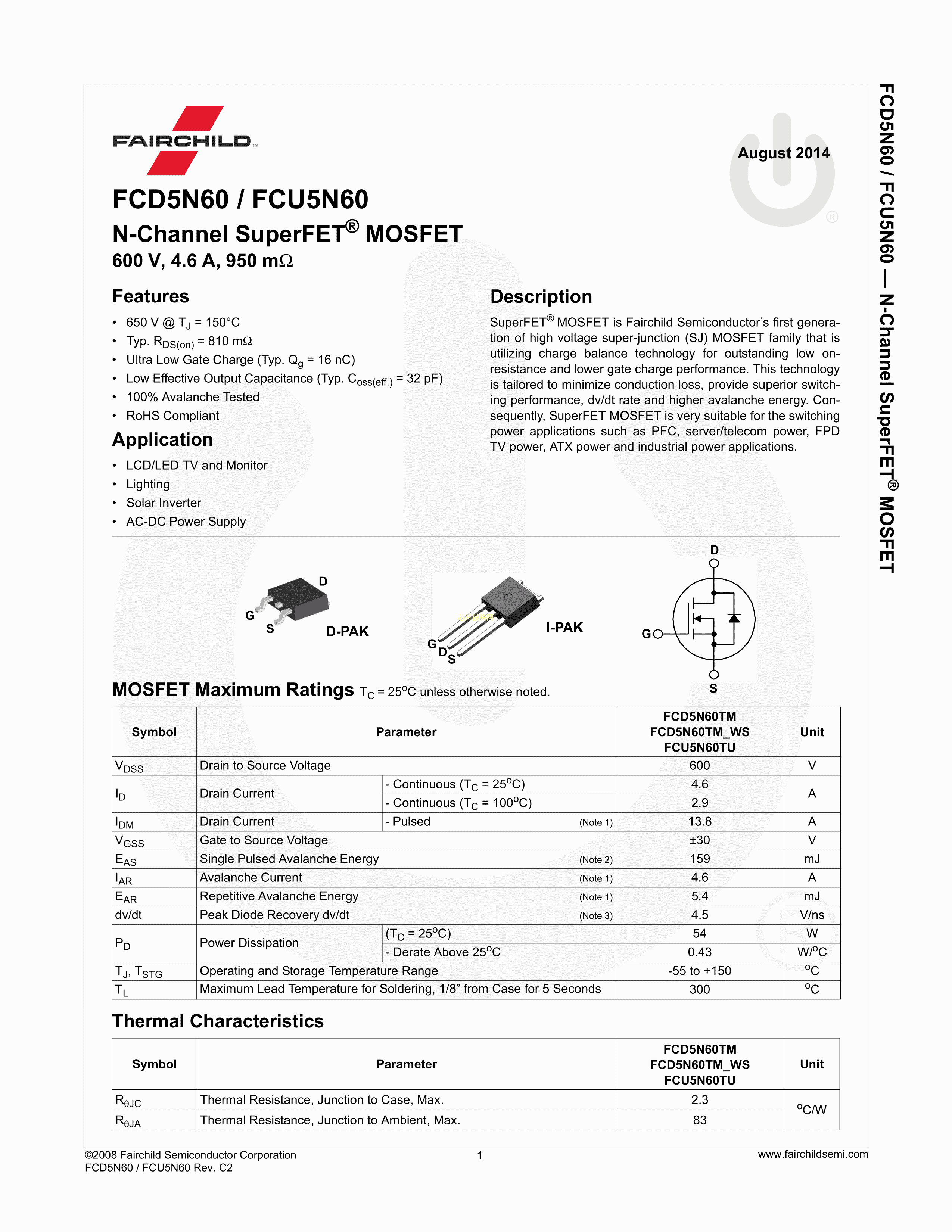 FCD5N60TM数据手册D-PAK封装onsemi(安森美)PDF规格书,中英文下载