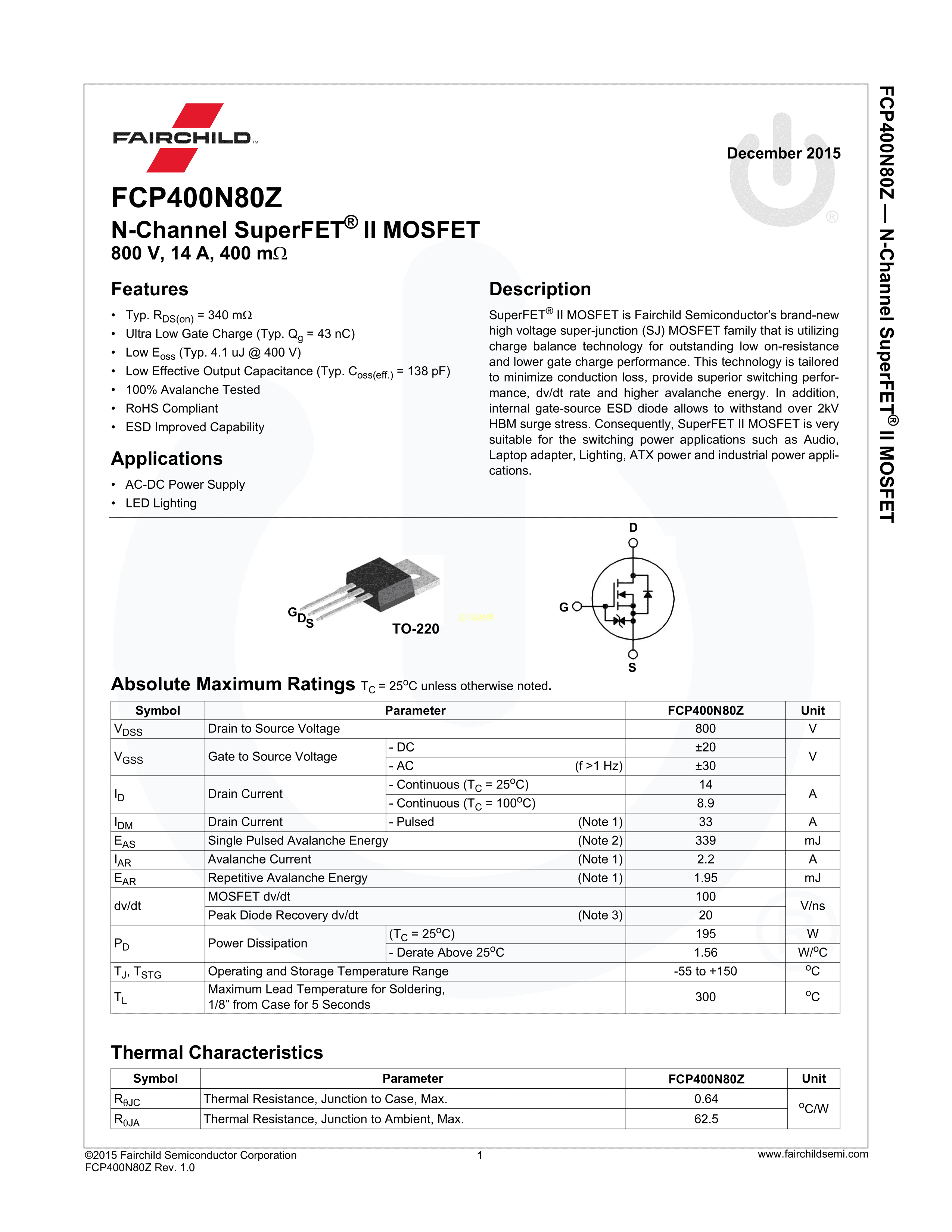 FCP400N80Z数据手册TO-220封装onsemi(安森美)PDF规格书,中英文下载