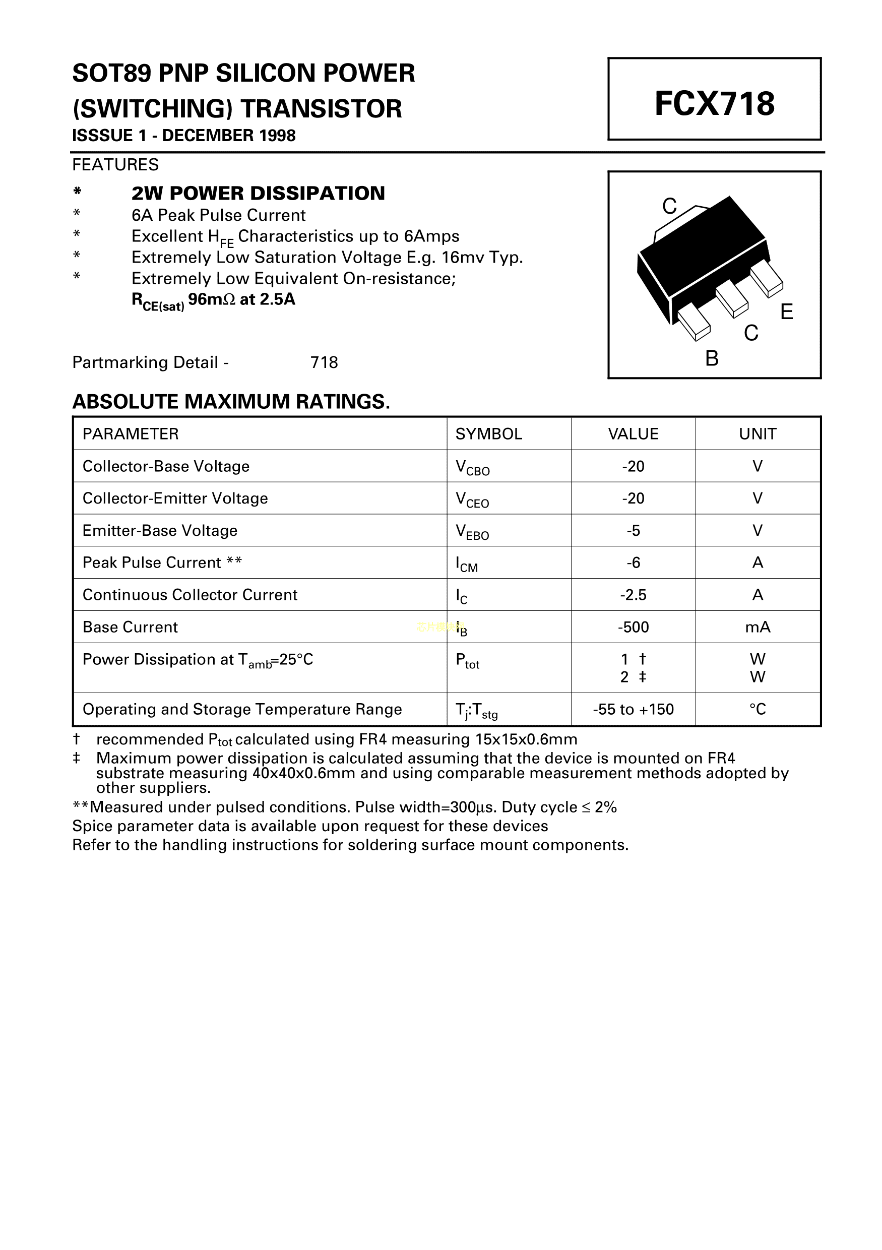 FCX718TA数据手册SOT-89(SOT-89-3)封装DIODES(美台)PDF规格书,中英文