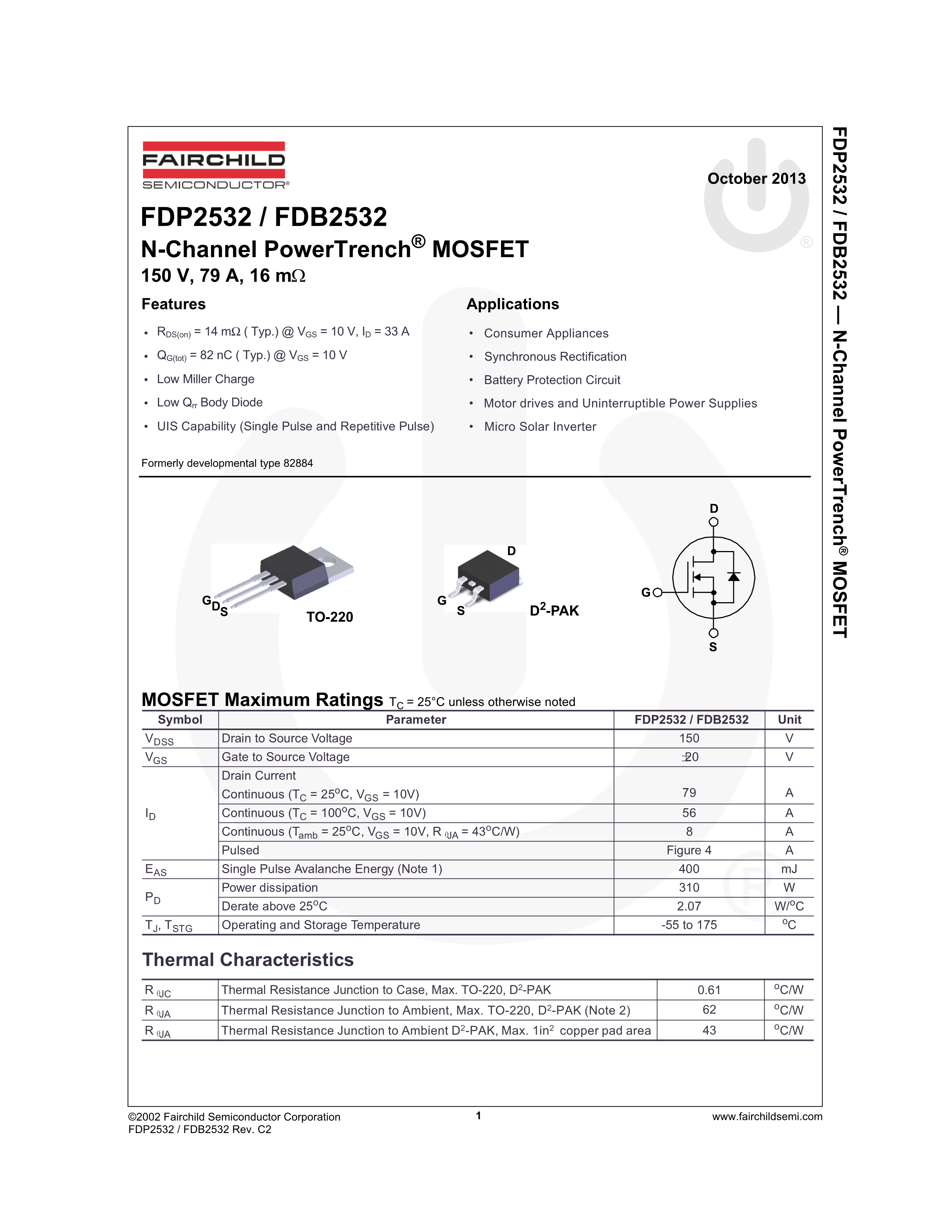FDB2532数据手册D2PAK封装onsemi(安森美)PDF规格书,中英文下载