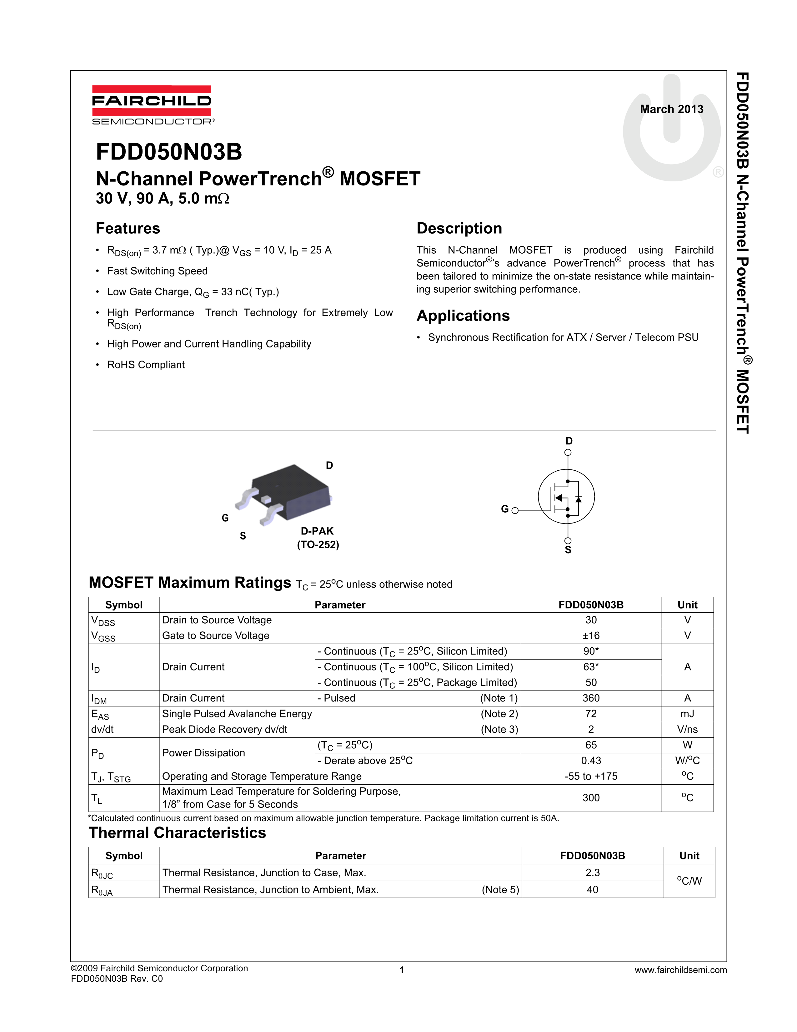 FDD050N03B数据手册TO-252封装onsemi(安森美)PDF规格书,中英文下载