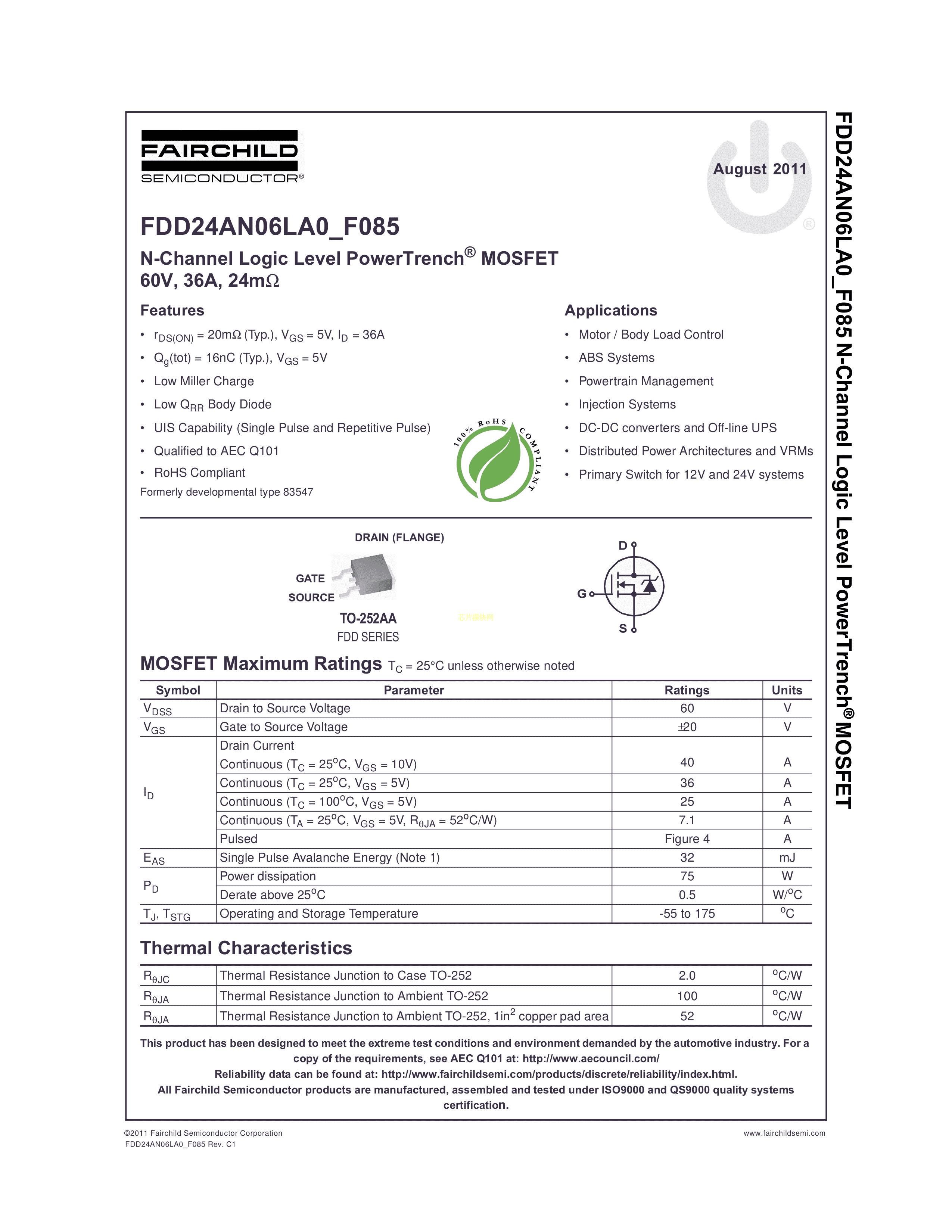 FDD24AN06LA0-F085数据手册TO-252-3封装onsemi(安森美)PDF规格书,中