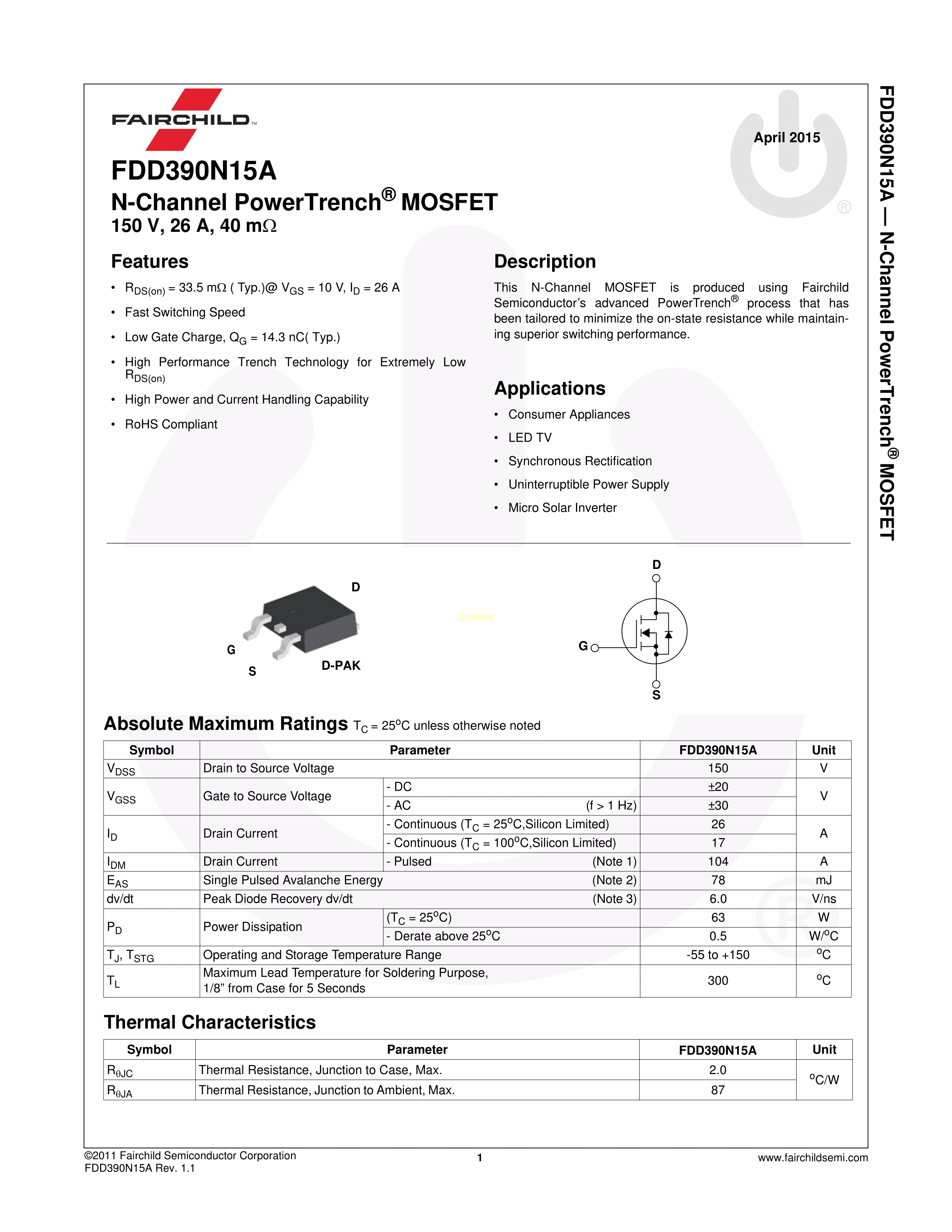 FDD390N15A数据手册TO-252(DPAK)封装onsemi(安森美)PDF规格书,中英文下